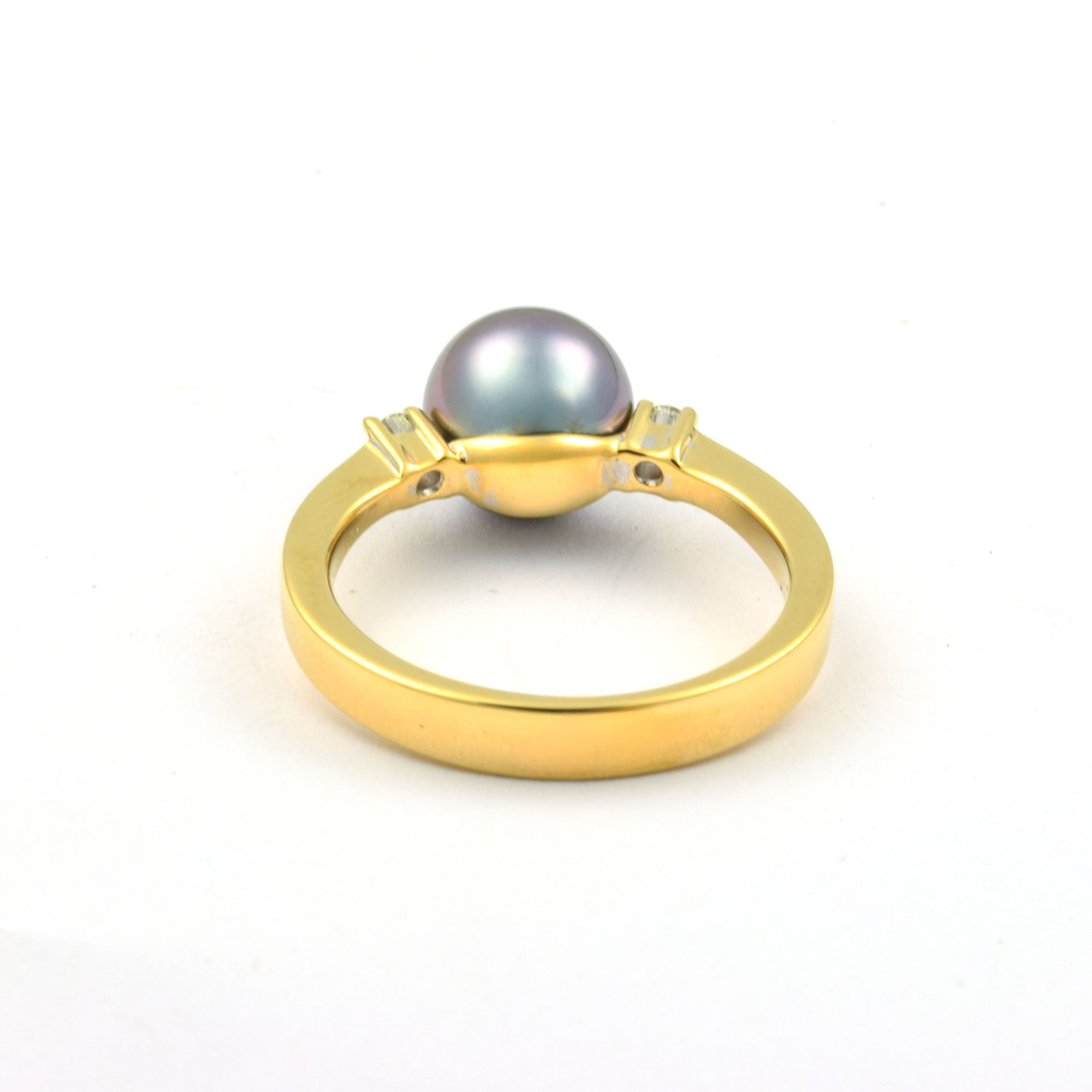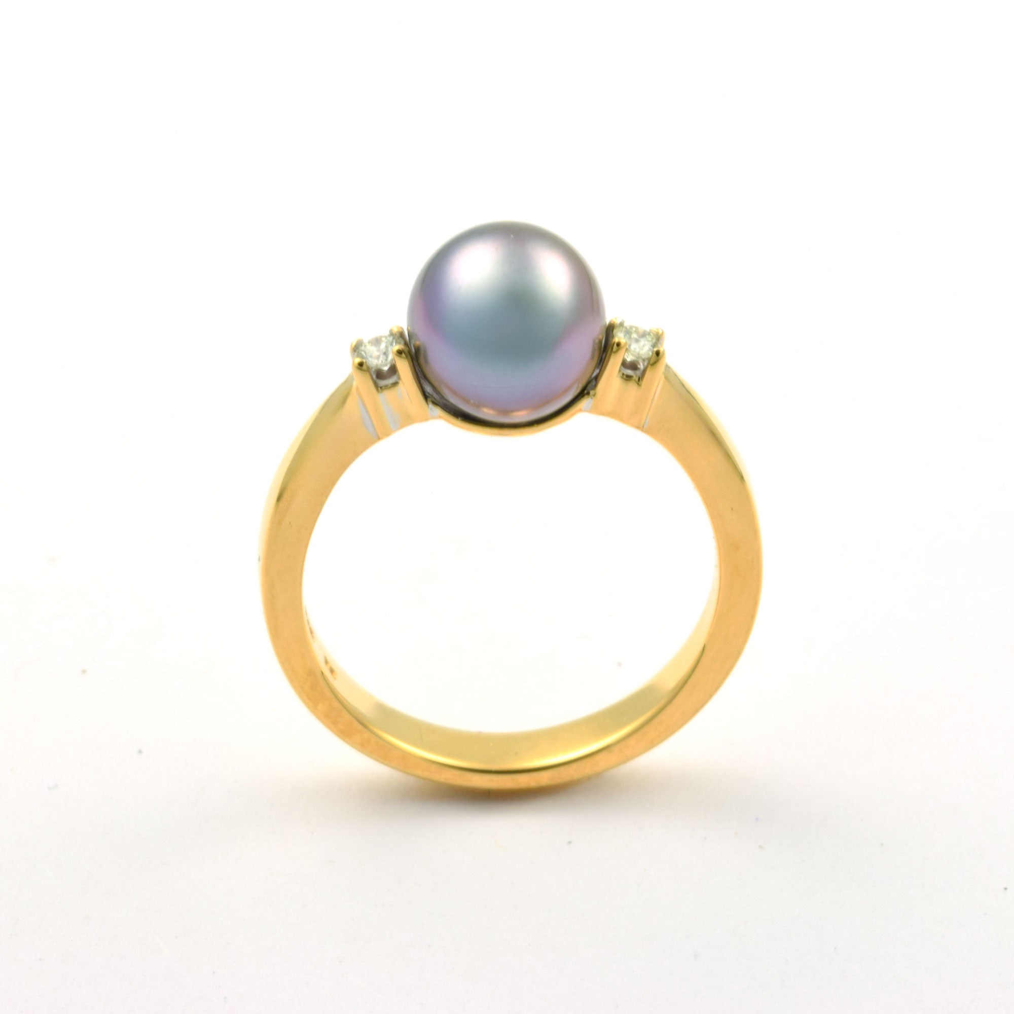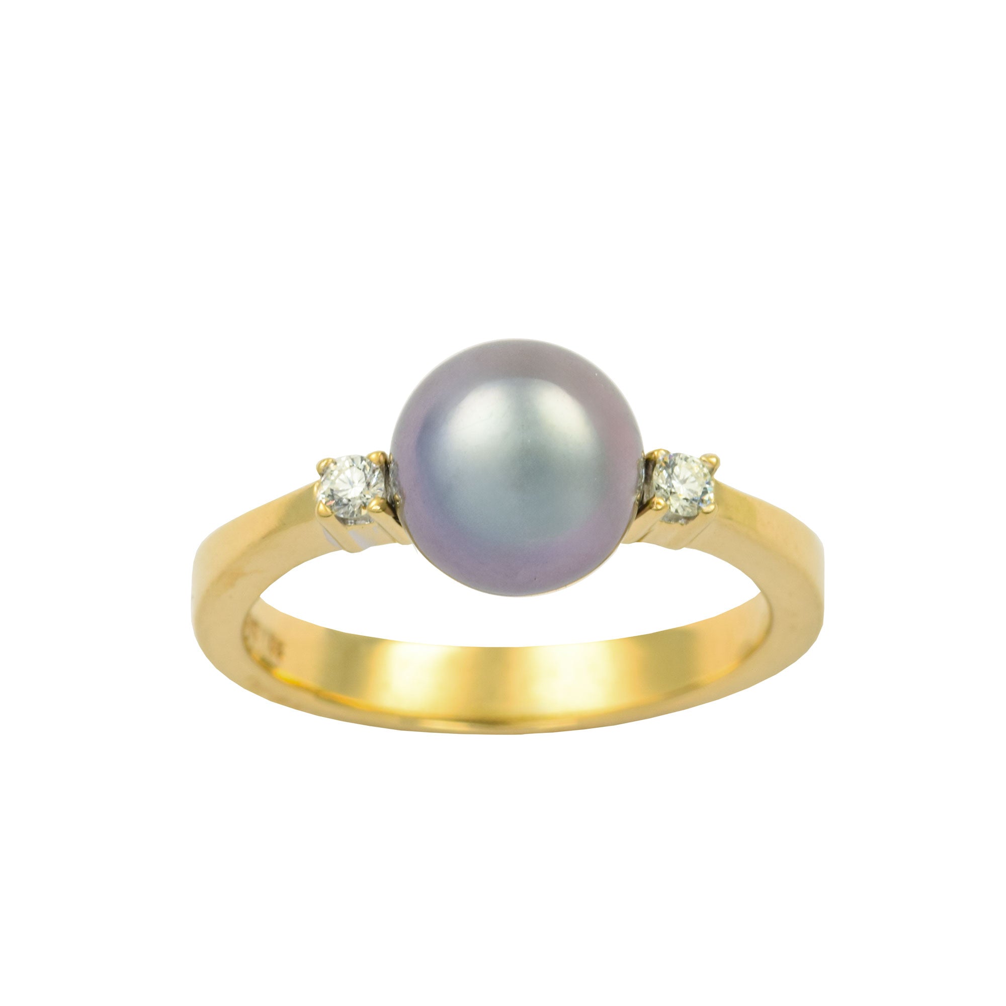 Bei dem Schmuckstück handelt es sich um einen Ring aus 585 Gelb- und Weißgold mit einer Tahitizuchtperle und zwei Brillanten von zusammen ca. 0,08 ct in der Qualität weiß mit sehr kleinen Einschlüssen (weiß/vs).