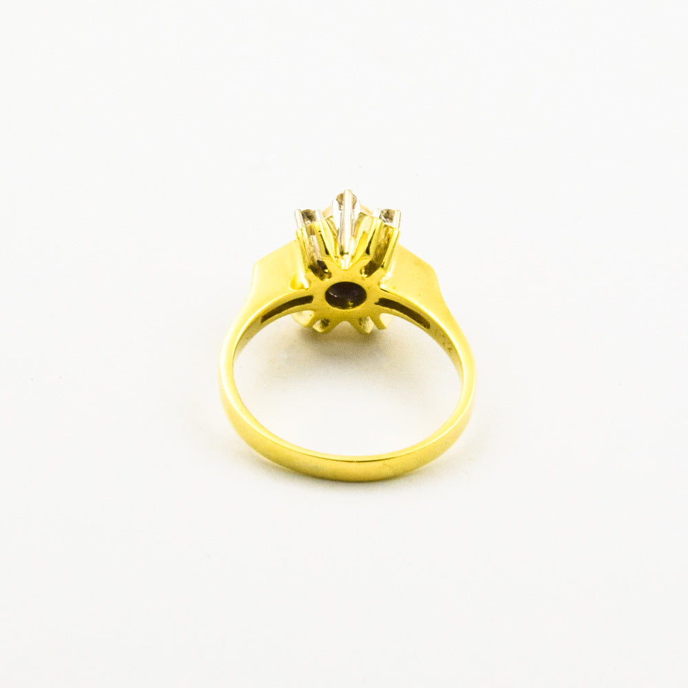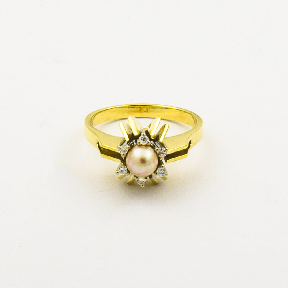 Bei dem Schmuckstück handelt es sich um einen Ring aus 585 Gelb- und Weißgold mit einer Zuchtperle und sechs Brillanten von zusammen ca. 0,12 ct in der Qualität Weiß mit kleinen Einschlüssen (W/si).