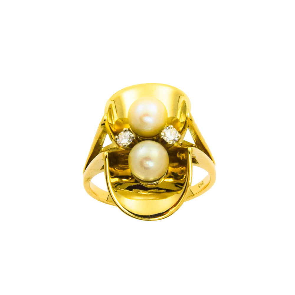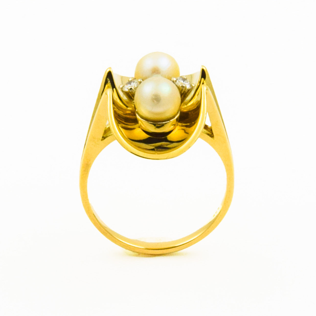 Bei dem Schmuckstück handelt es sich um einen Ring aus 585 Gelb- und Weißgold mit zwei Zuchtperlen und zwei Brillanten von zusammen ca. 0,14 ct in der Qualität feines Weiß mit sehr kleinen Einschlüssen (TW/vs).