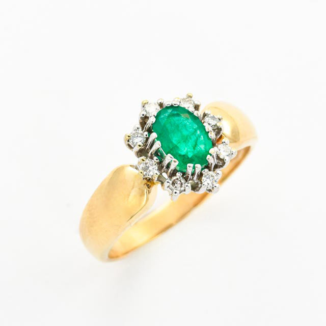 Bei dem Schmuckstück handelt es sich um einen Ring aus 585 Gelb- und Weißgold mit einem Smaragd und acht Brillanten von zusammen ca. 0,08 ct in der Qualität Weiß mit kleinen Einschlüssen (W/si).