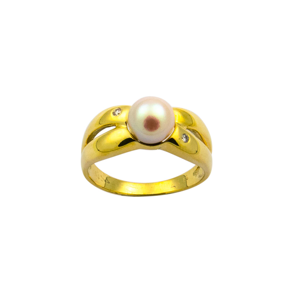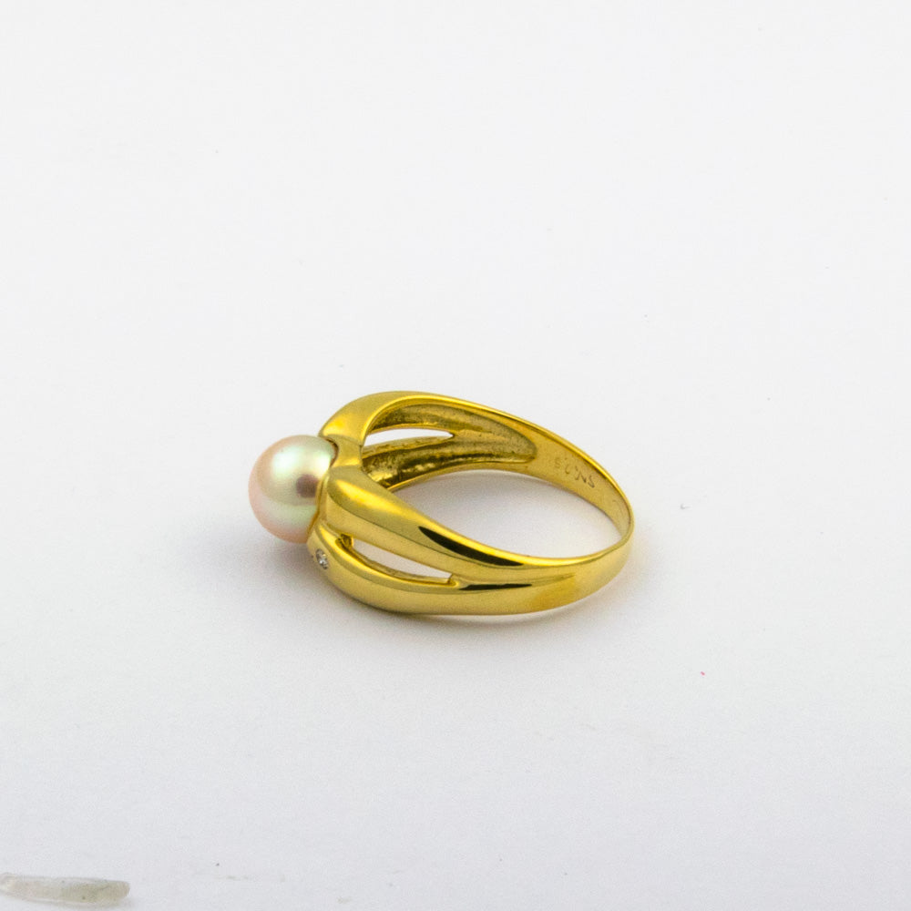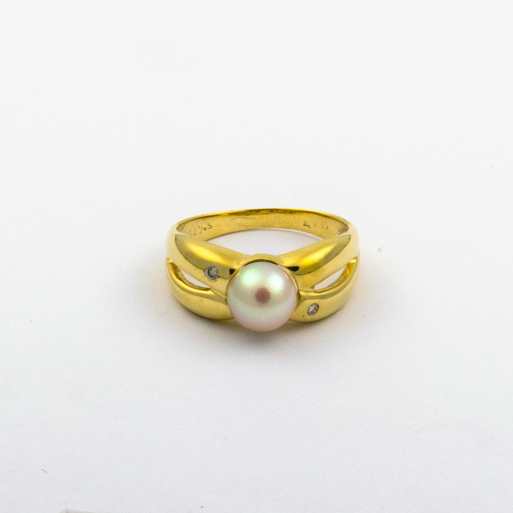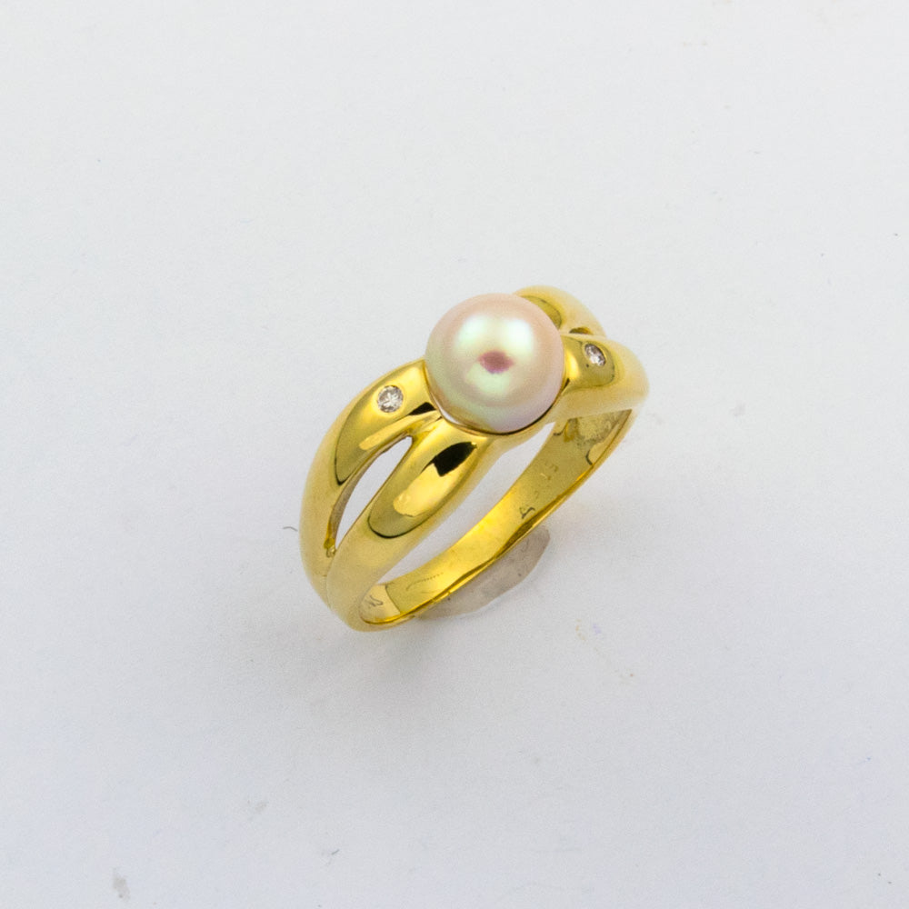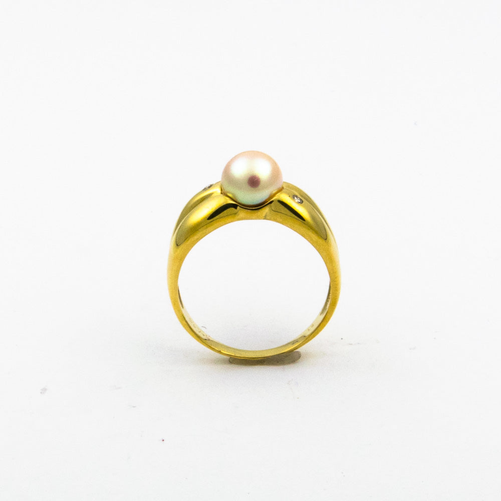 Bei dem Schmuckstück handelt es sich um einen Ring aus 585 Gelbgold mit einer Zuchtperle und zwei Brillanten von zusammen ca. 0,05 ct in der Qualität Weiß mit kleinen Einschlüssen (W/si).