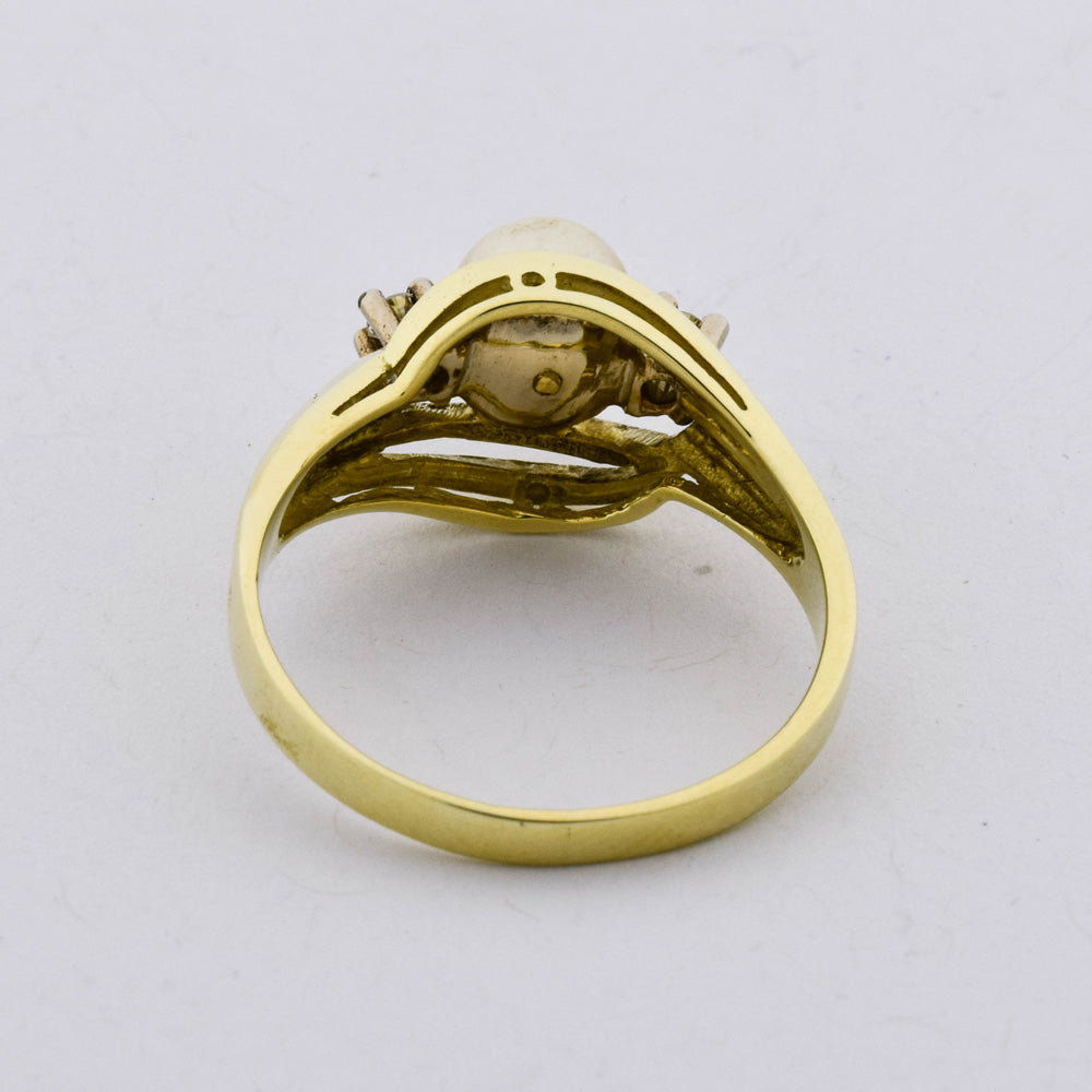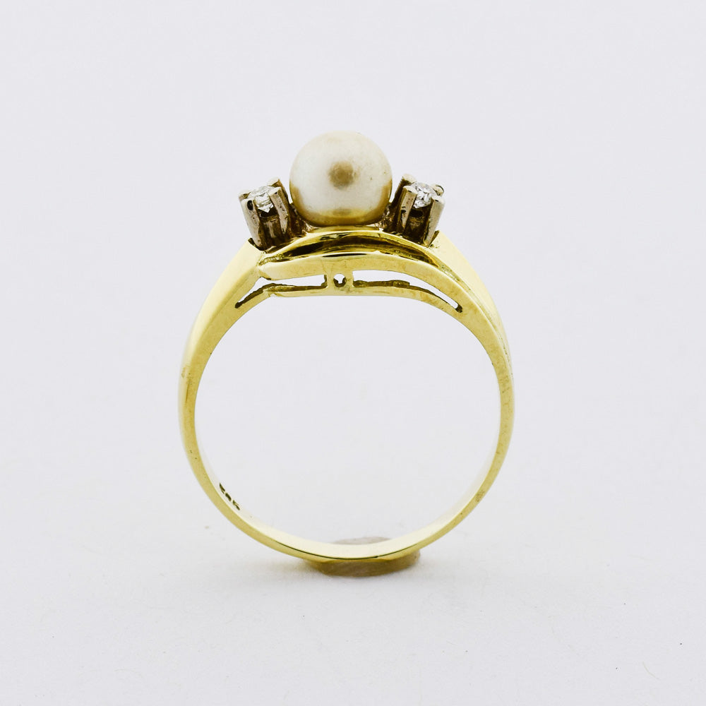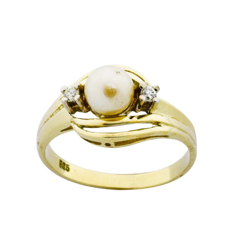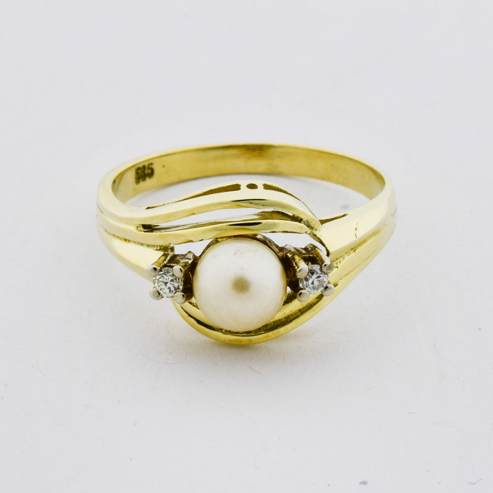 Bei dem Schmuckstück handelt es sich um einen Ring aus 585 Gelbgold mit einer Zuchtperle und zwei Diamanten im 8/8 Schliff von zusammen ca. 0,056 ct in der Qualität Weiß mit kleinen Einschlüssen (W/si).