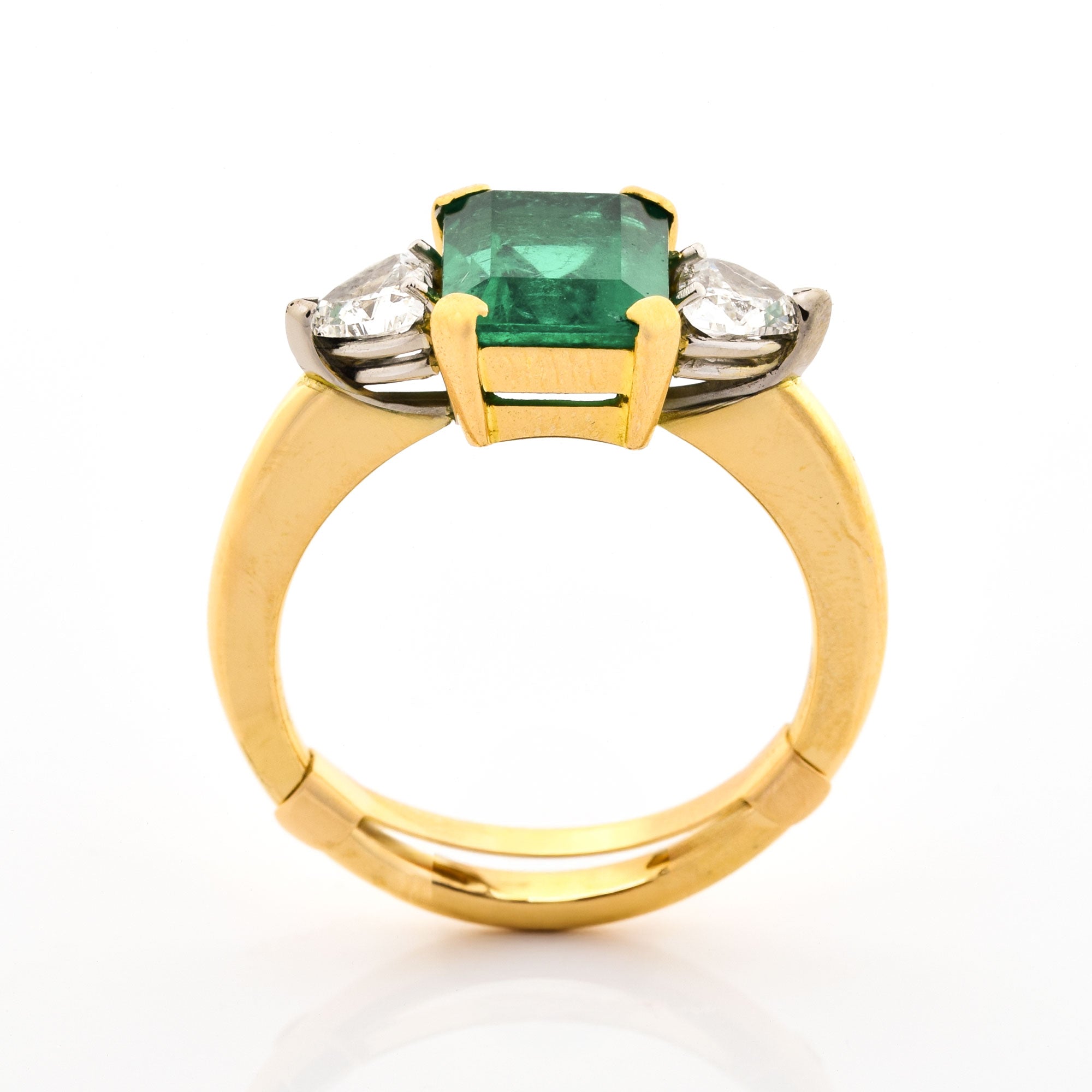 Bei dem Schmuckstück handelt es sich um einen Ring aus 750 Gelbgold mit einem kolumbianischen Smaragd von ca. 2,84 ct Behandlungsgrad: minor und zwei Diamanten im Triangelschliff von zusammen ca. 0,63 ct in der Qualität feines Weiß mit kleinen Einschlüssen (TW/si).