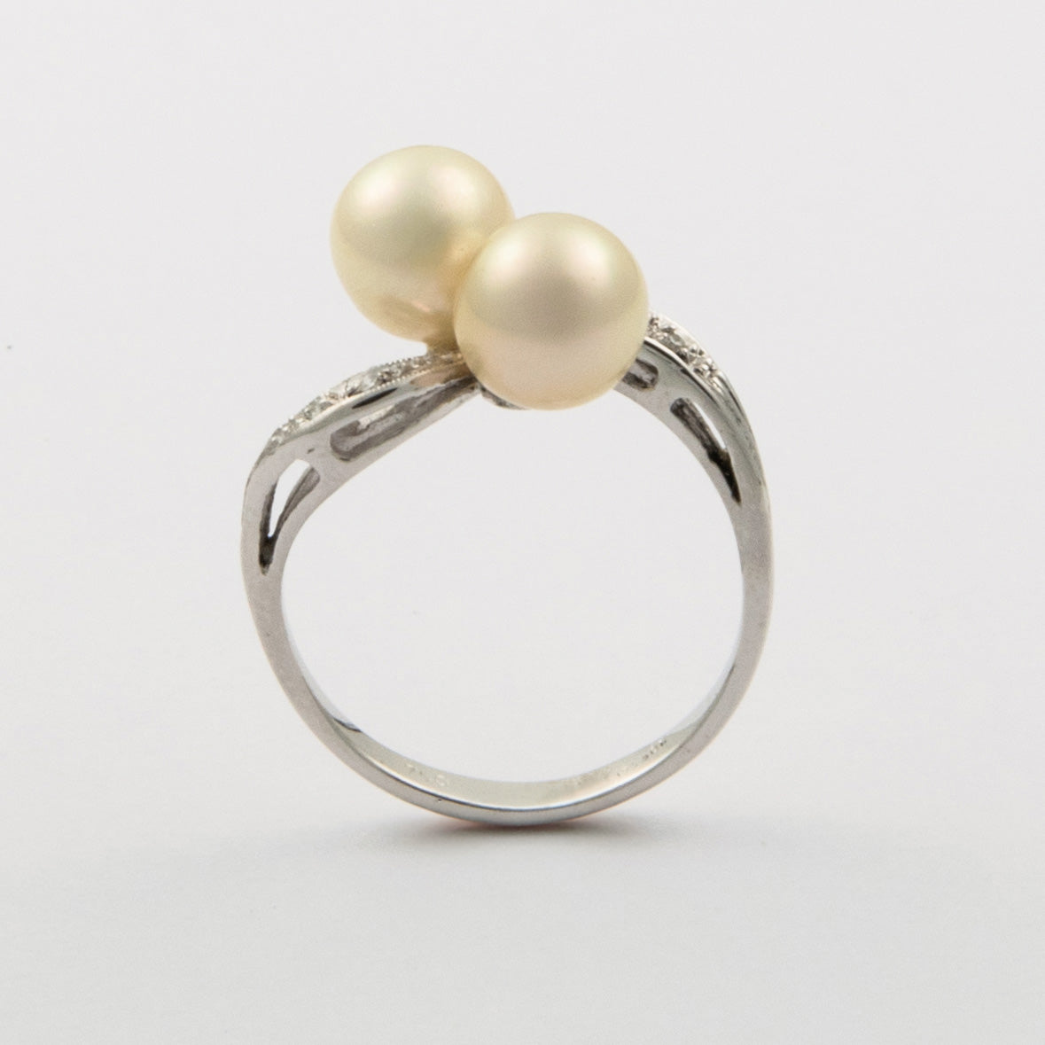 Bei dem Schmuckstück handelt es sich um einen Ring aus 750 Weißgold mit zwei Akoyazuchtperlen und vier Diamanten im 8/8 Schliff.