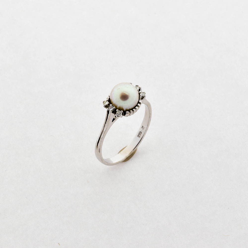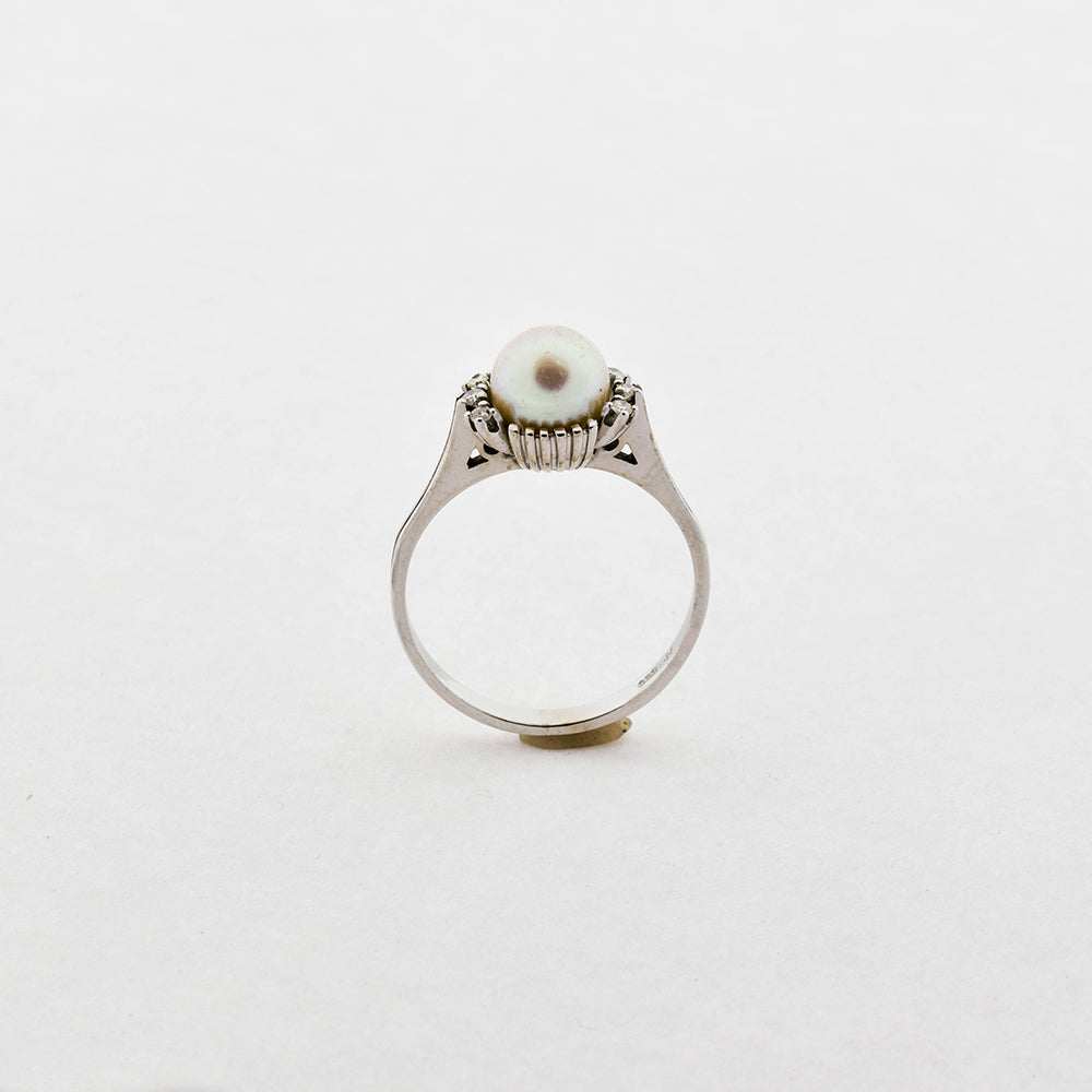 Bei dem Schmuckstück handelt es sich um einen Ring aus 585 Weißgold mit einer Zuchtperle und sechs Diamanten im 8/8 Schliff von zusammen ca. 0,06 ct in der Qualität Weiß mit kleinen Einschlüssen (W/si).