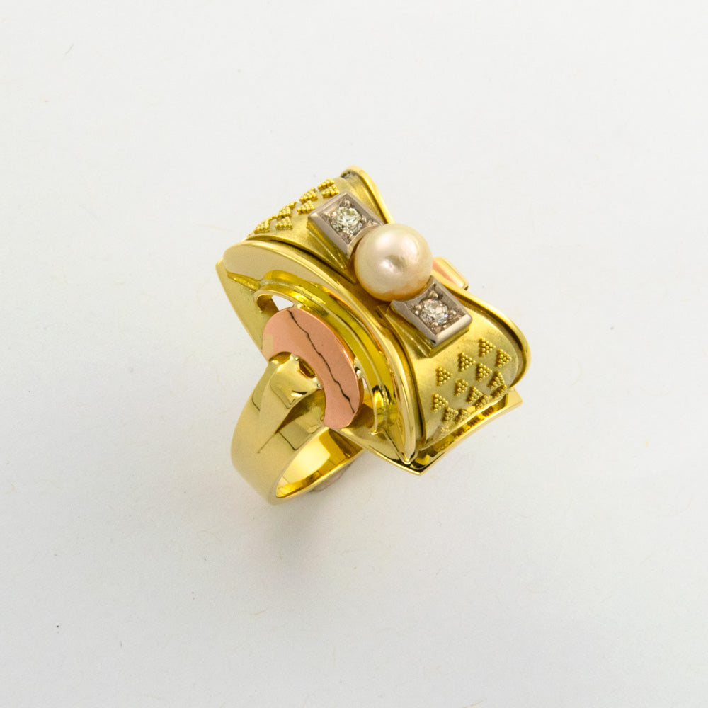 Vintage Perlenring aus Gelb-, Rot- und Weißgold mit Brillant