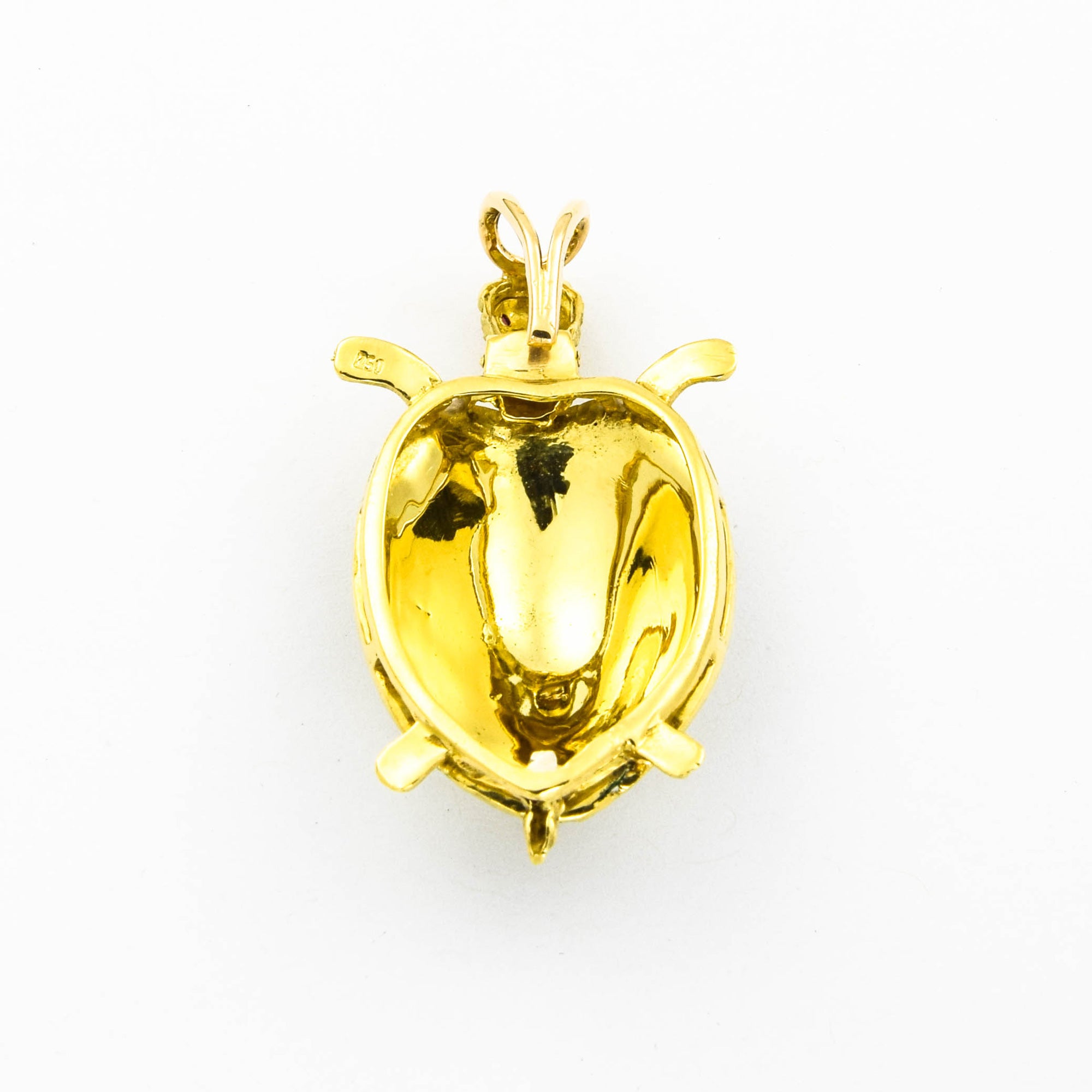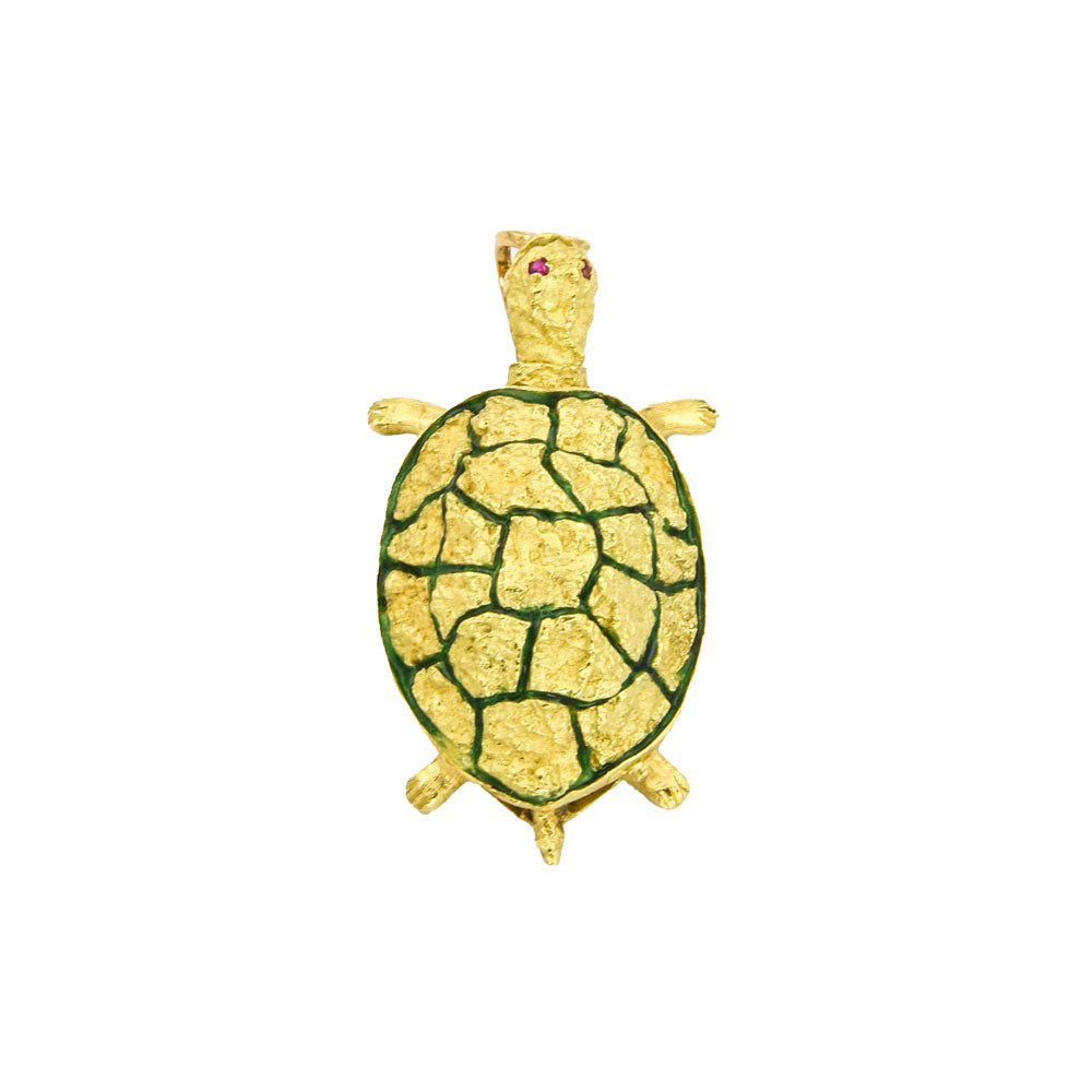 Bei dem Schmuckstück handelt es sich um einen emaillierten Anhänger "Schildkröte" aus 750 Gelbgold mit zwei Rubinen.