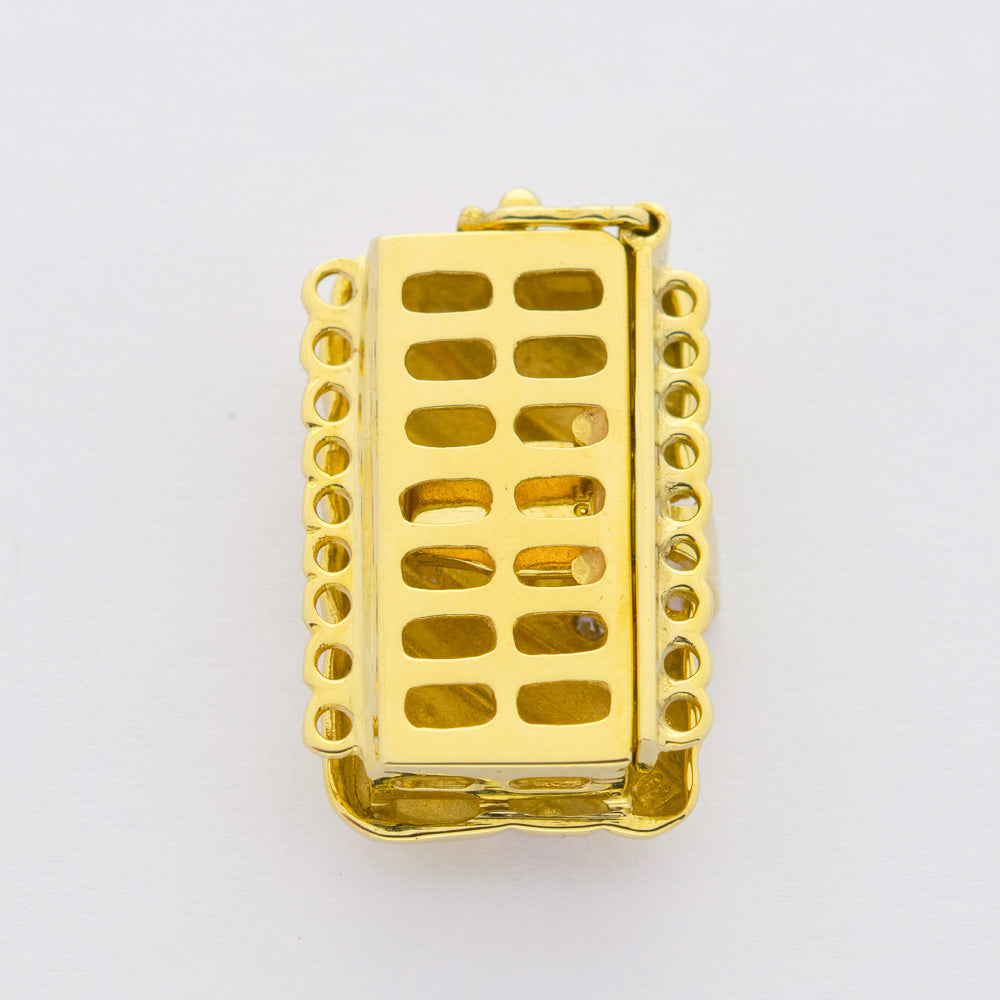 Bei dem Schmuckstück handelt es sich um eine Schließe für neunreihige Kette aus 585 Gelb- und Weißgold mit drei Diamanten im 8/8 Schliff von zusammen ca. 0,015 ct in der Qualität Weiß mit kleinen Einschlüssen (W/si).