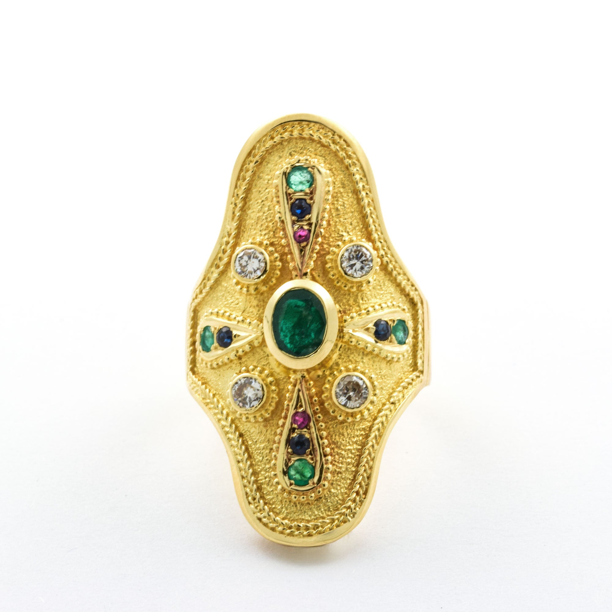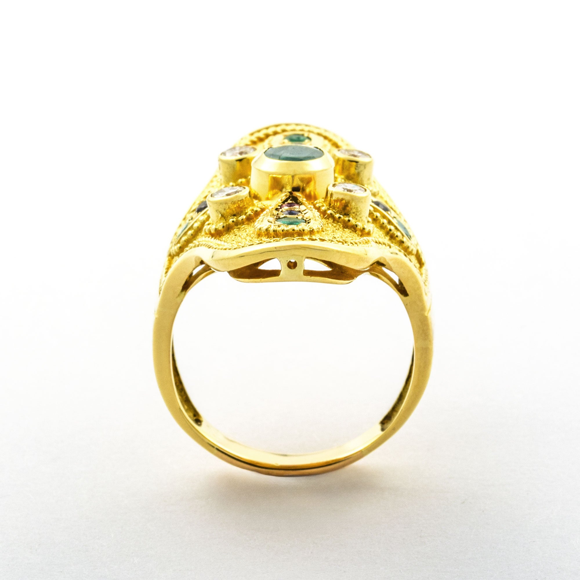 Smaragdring aus Gelbgold mit Saphir und Rubin