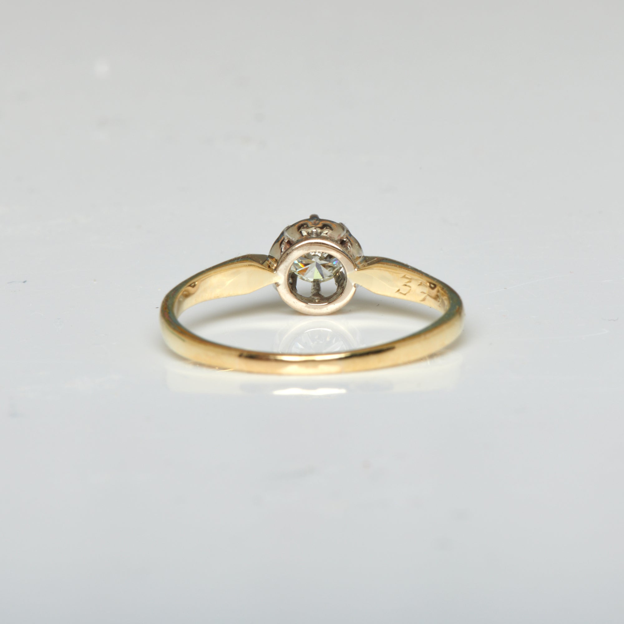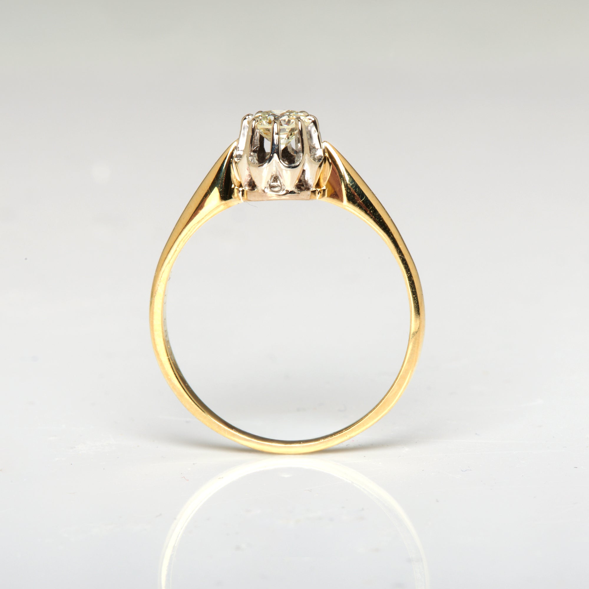 Bei dem Schmuckstück handelt es sich um einen Solitärring aus 585 Gelb- und Weißgold mit einem Brillanten von ca. 0,37 ct in der Qualität getönt 1 mit kleinen Einschlüssen (TCape/si).