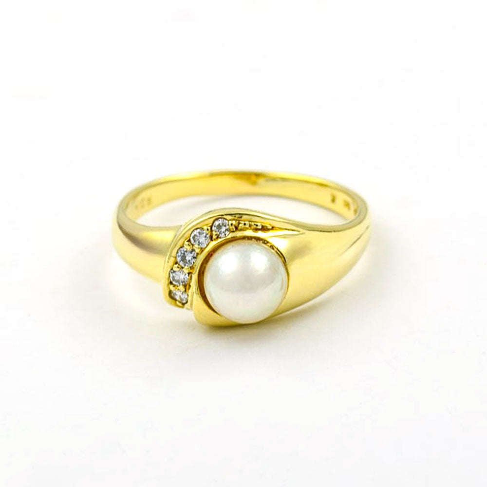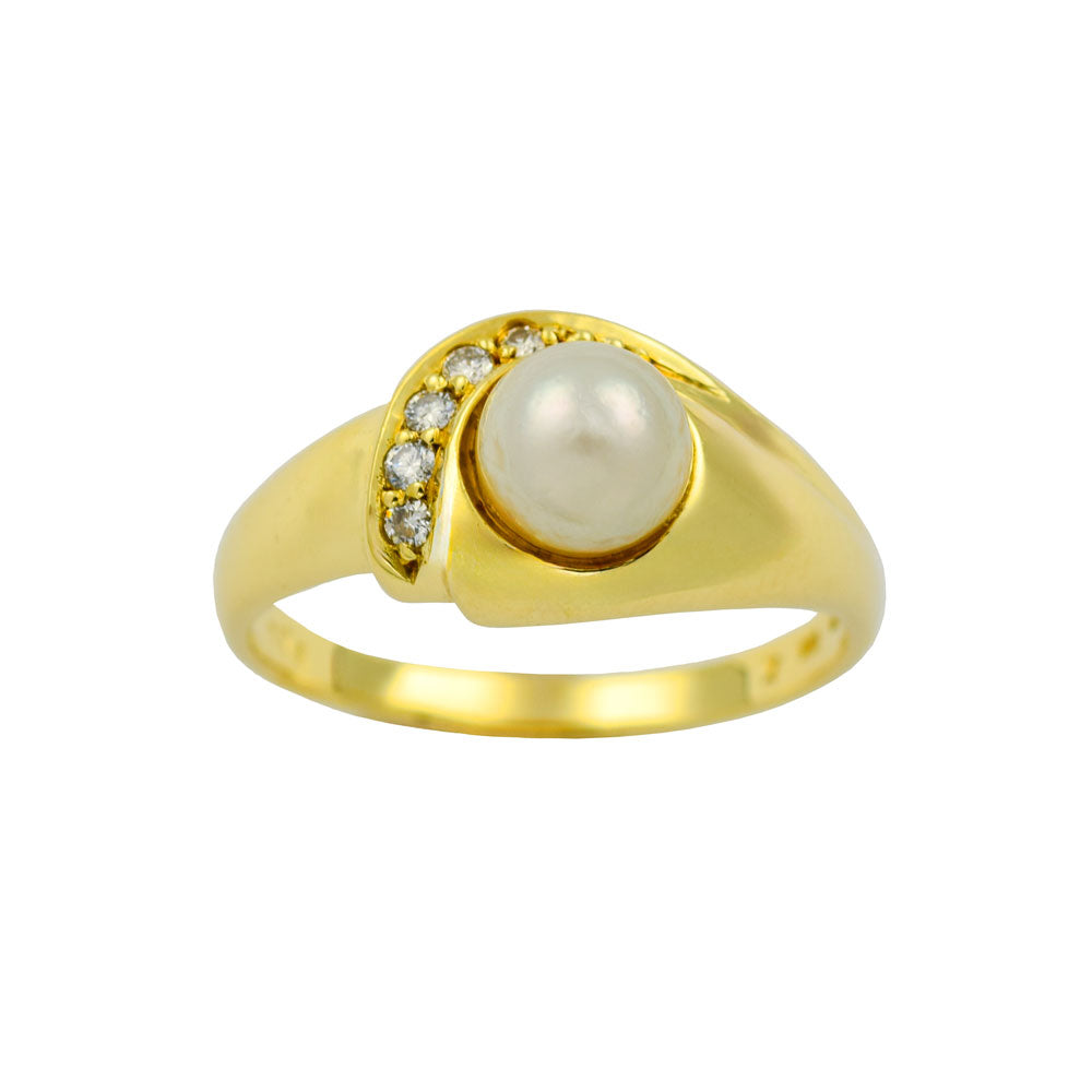 Bei dem Schmuckstück handelt es sich um einen Ring aus 585 Gelbgold mit einer Zuchtperle und fünf Brillanten von zusammen ca. 0,1 ct in der Qualität Weiß mit kleinen Einschlüssen (W/si).