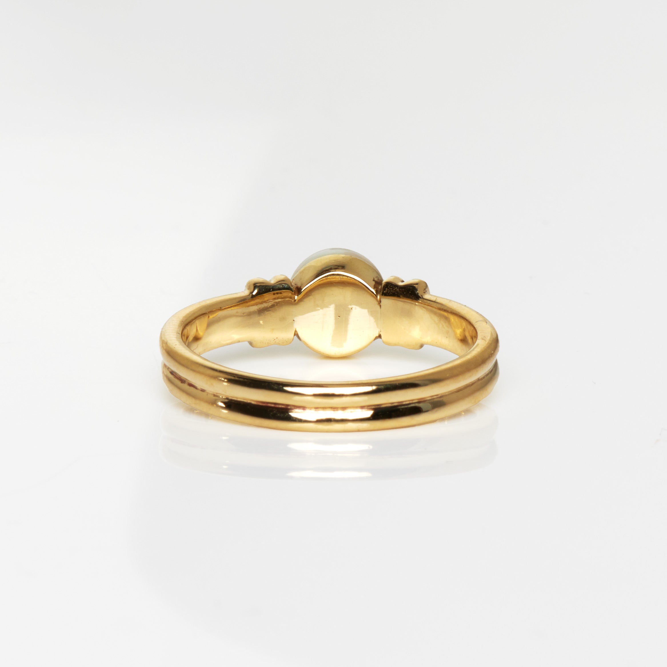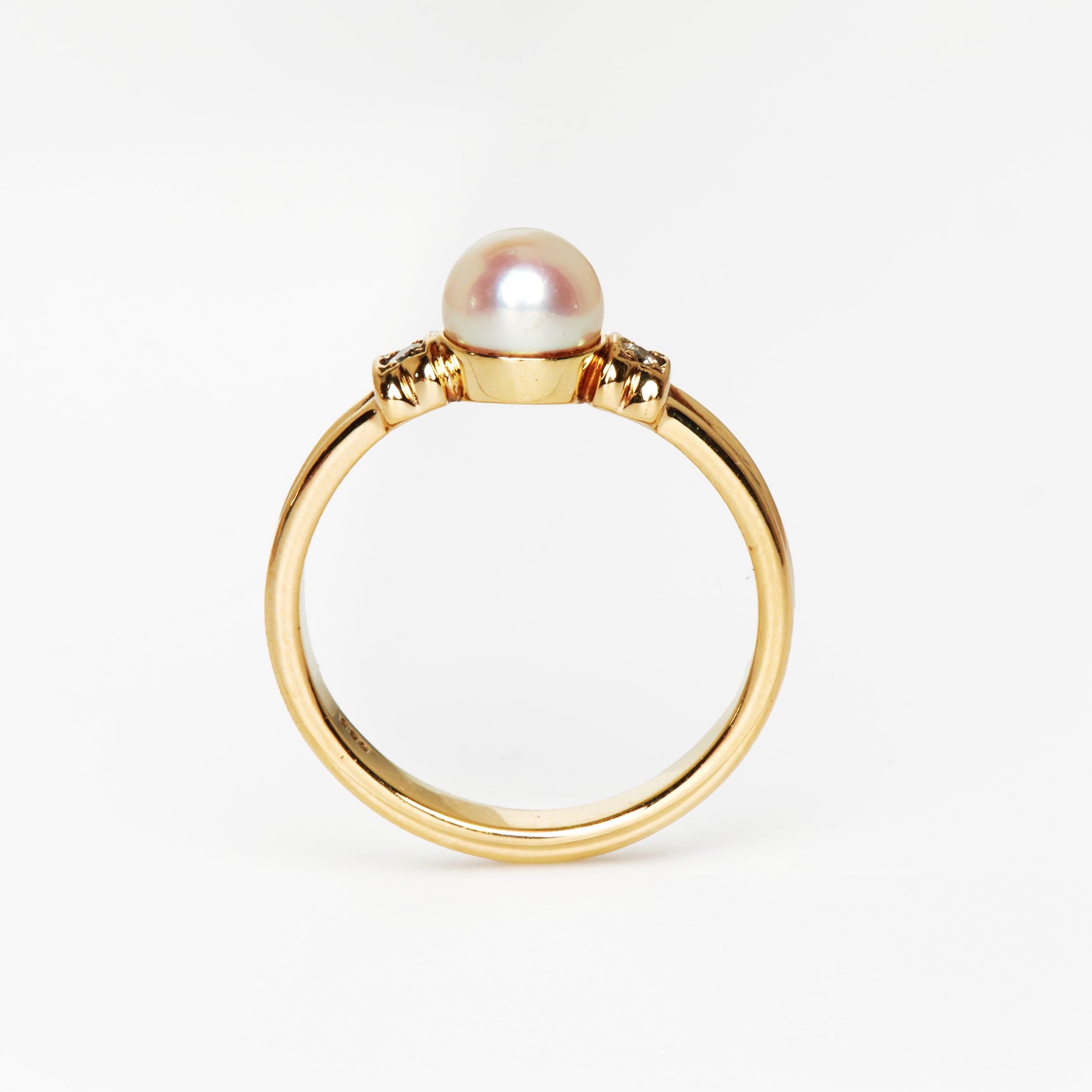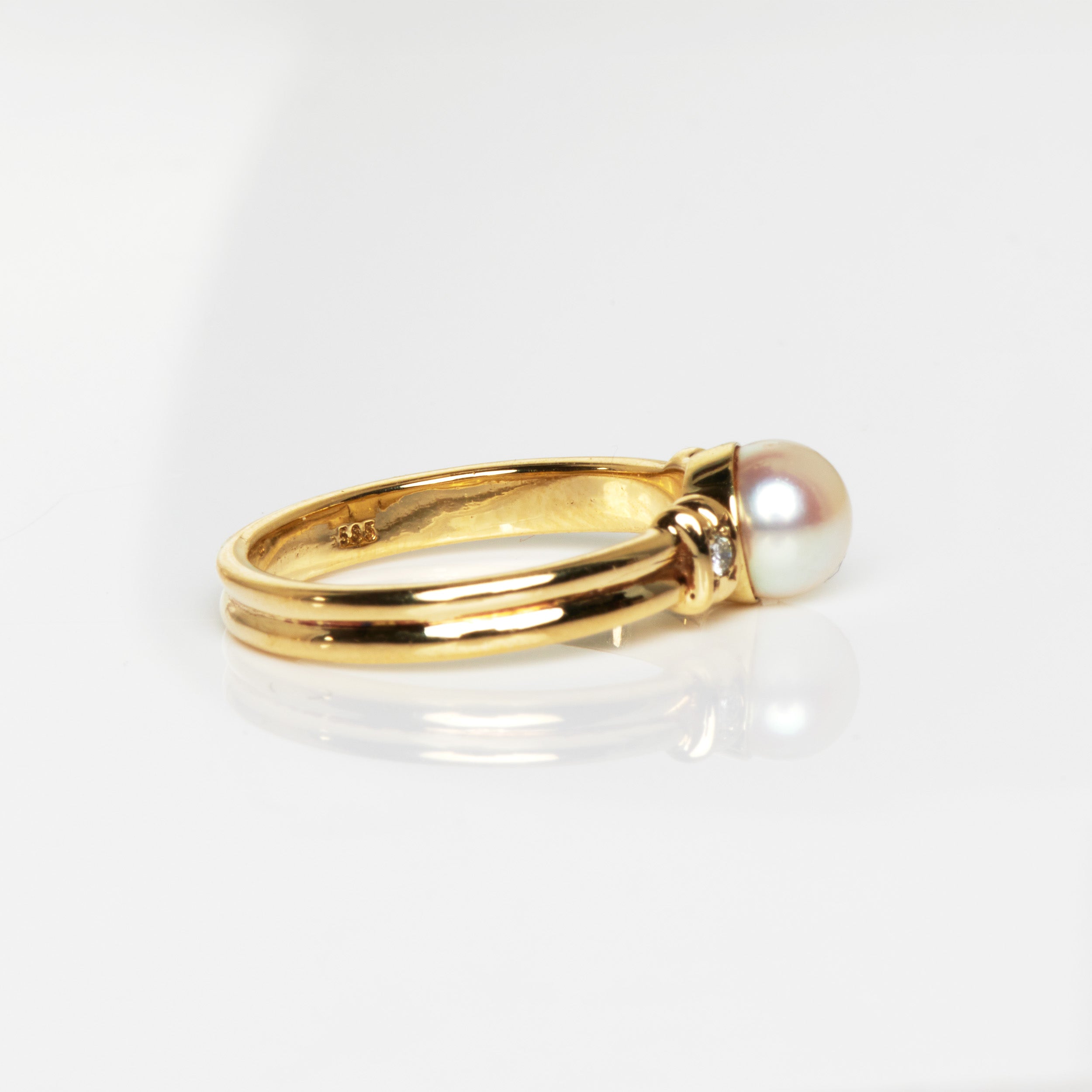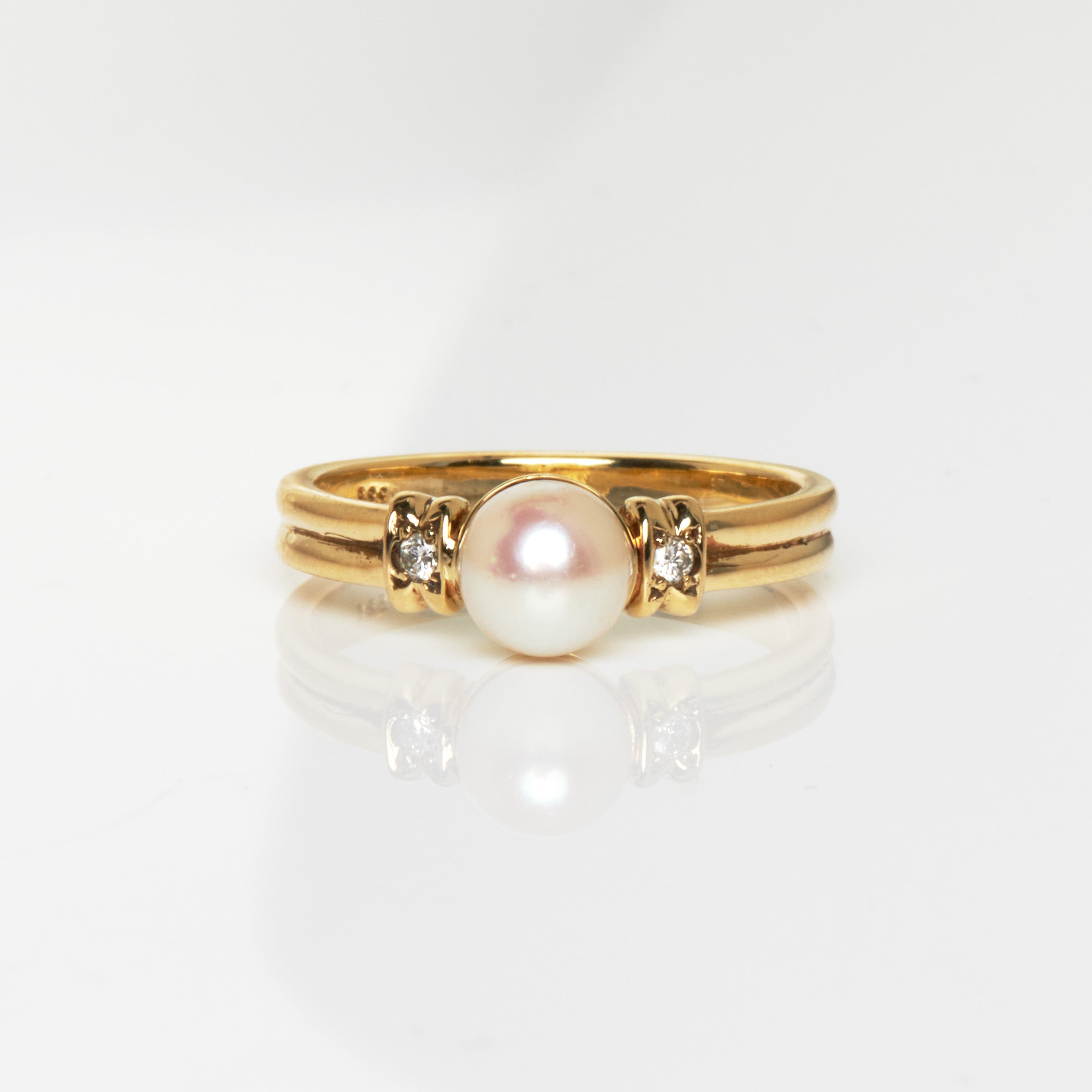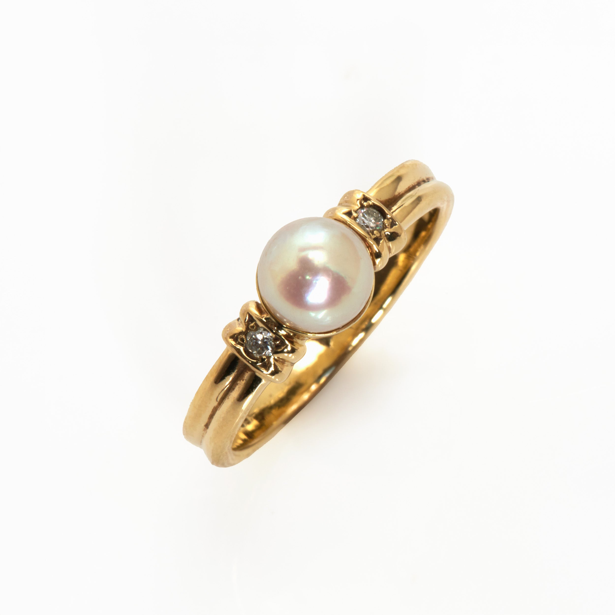Bei dem Schmuckstück handelt es sich um einen Ring aus 585 Gelbgold mit einer Zuchtperle und zwei Brillanten von zusammen ca. 0,01 ct in der Qualität Weiß mit kleinen Einschlüssen (W/si).