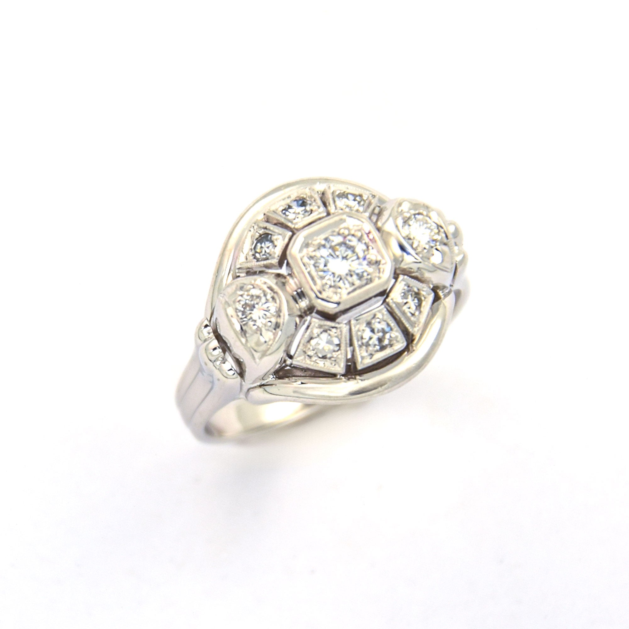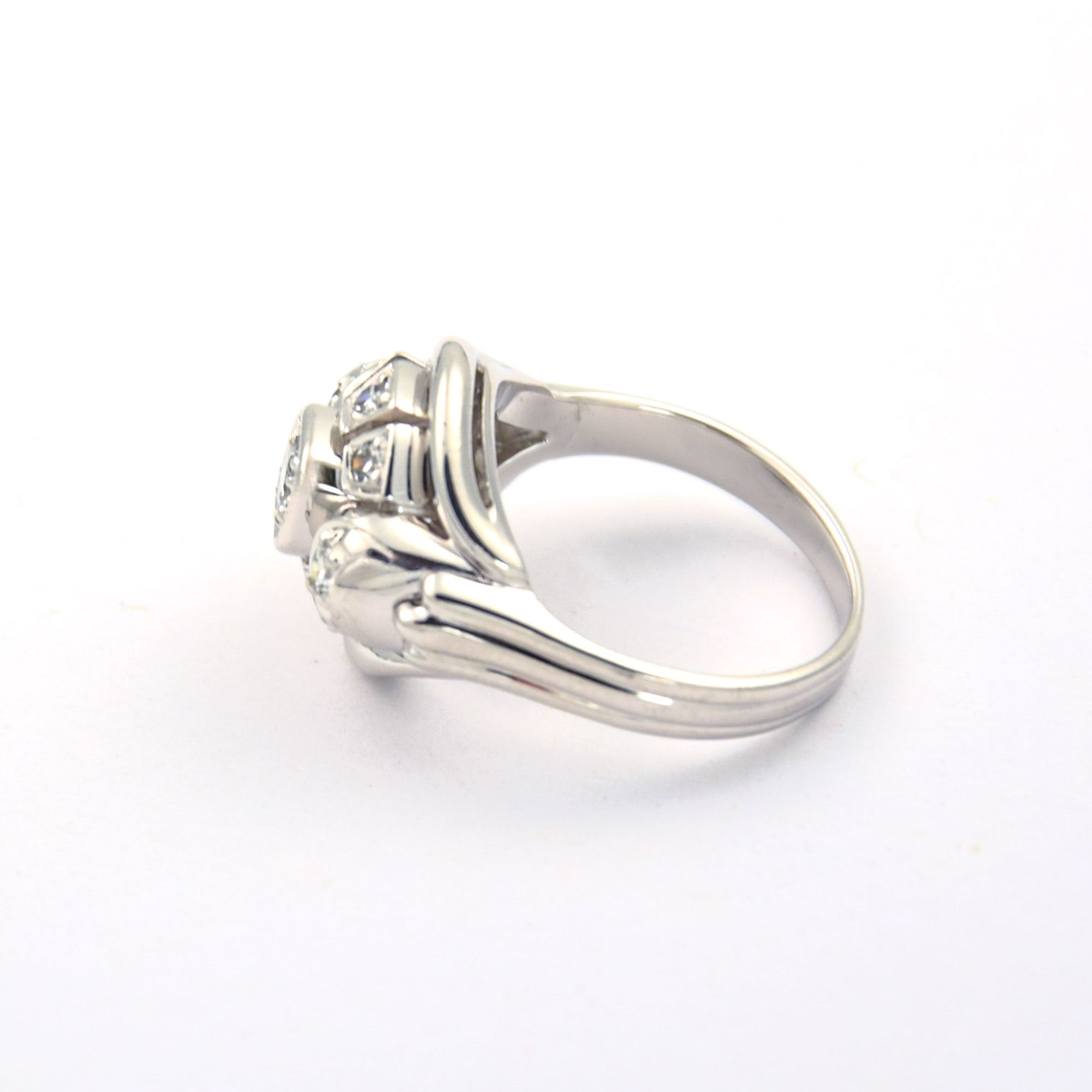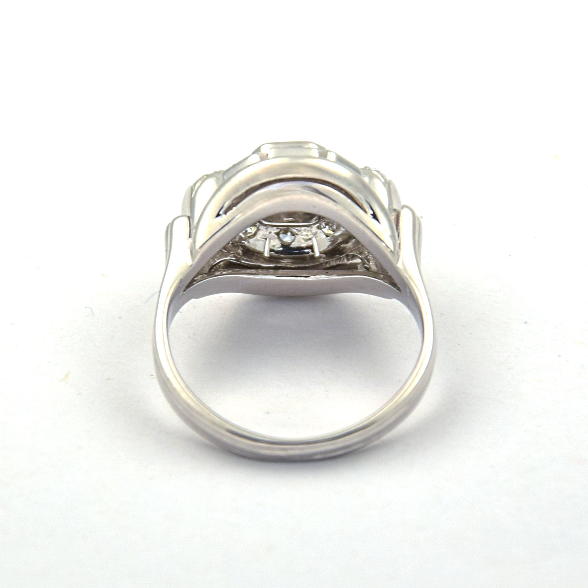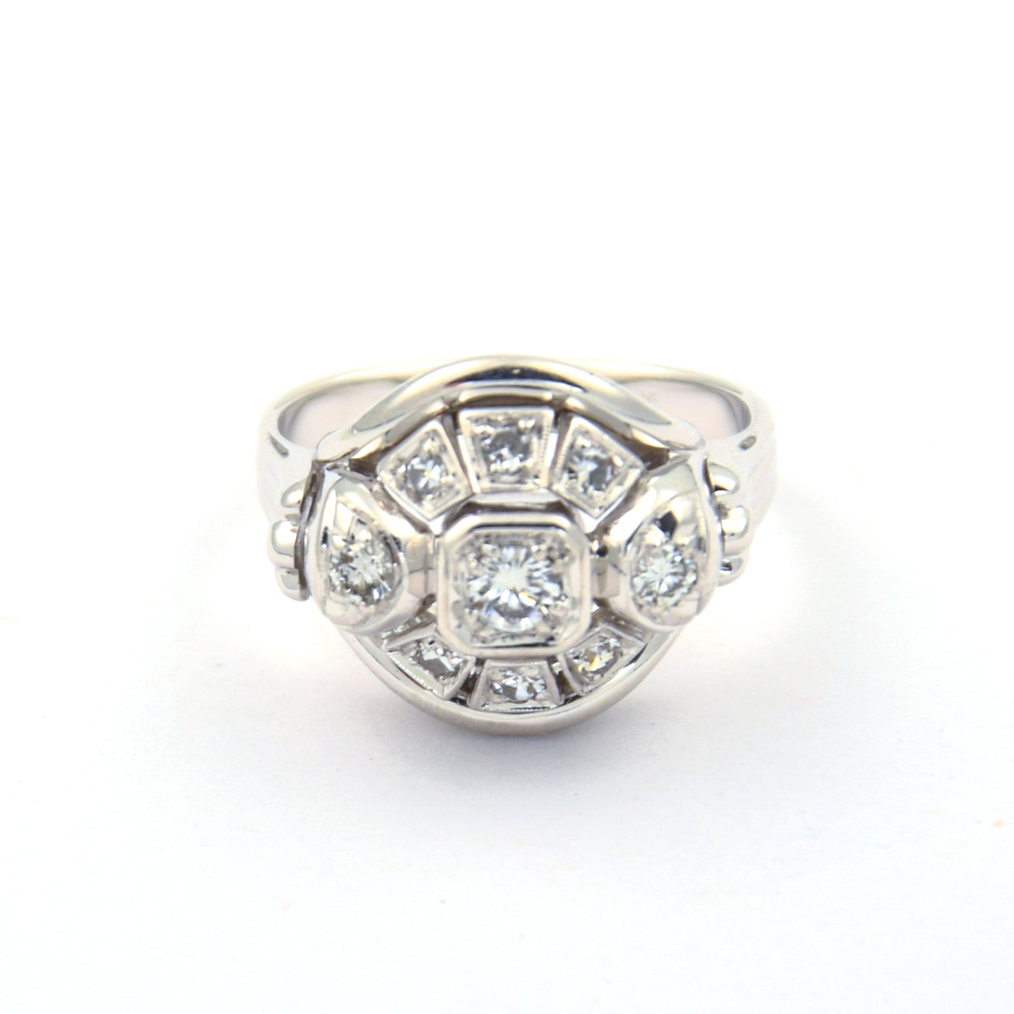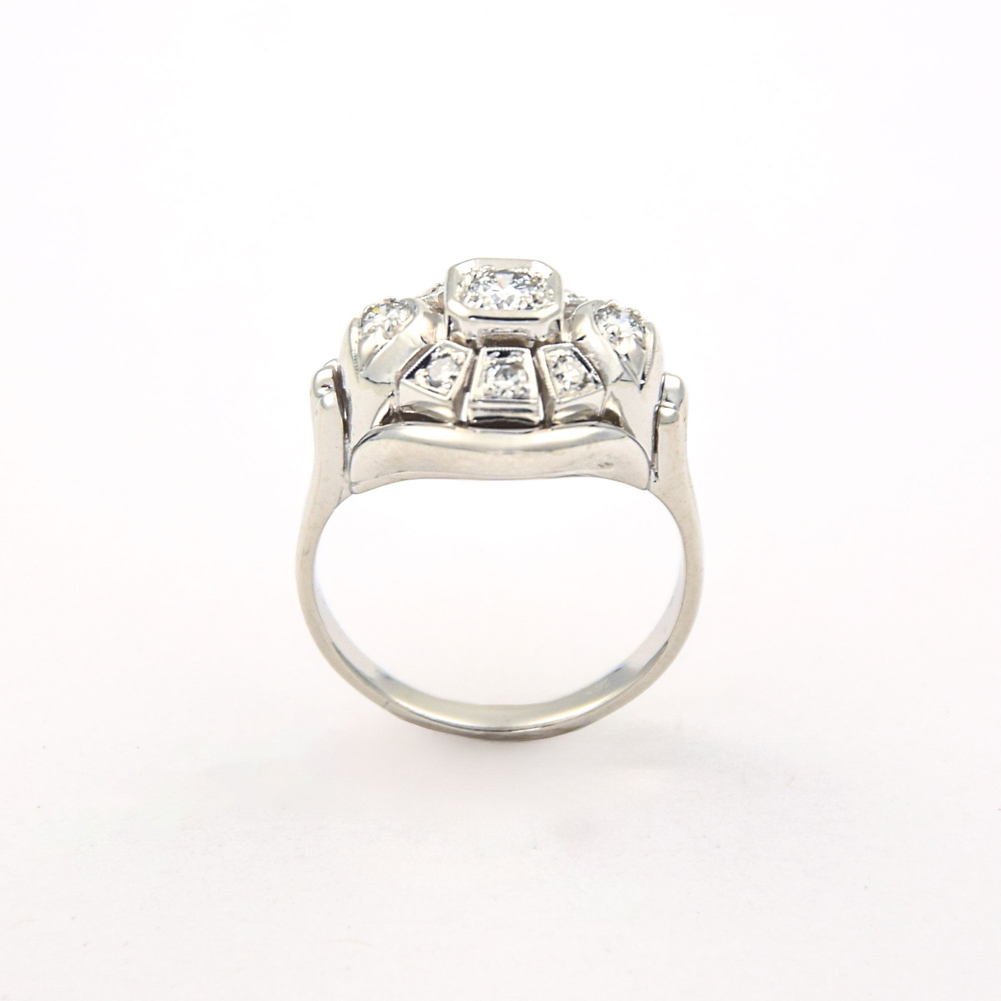 Bei dem Schmuckstück handelt es sich um einen Ring aus 585 Weißgold mit drei Brillanten von zusammen ca. 0,25 ct in der Qualität feines Weiß mit sehr kleinen Einschlüssen (TW/vs) und sechs Diamanten von zusammen ca. 0,12 ct in der Qualität feines Weiß mit sehr kleinen Einschlüssen (TW/vs).