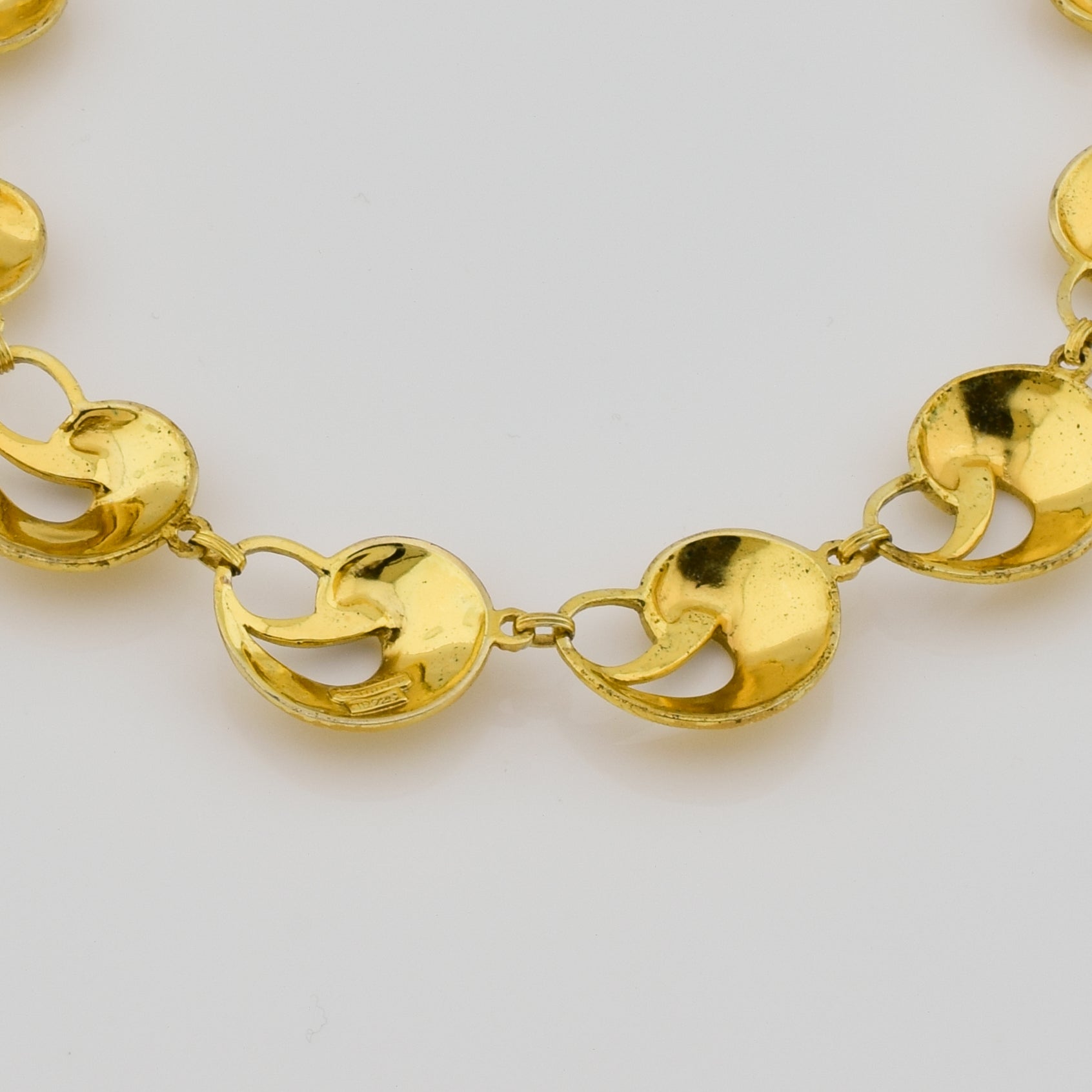 Bei dem Schmuckstück handelt es sich um eine Halskette der Marke Theodor Fahrner aus 925 Silber vergoldet mit 80 Hämatiten. Das Schmuckstück hat eine Gesamtlänge von 41 cm.