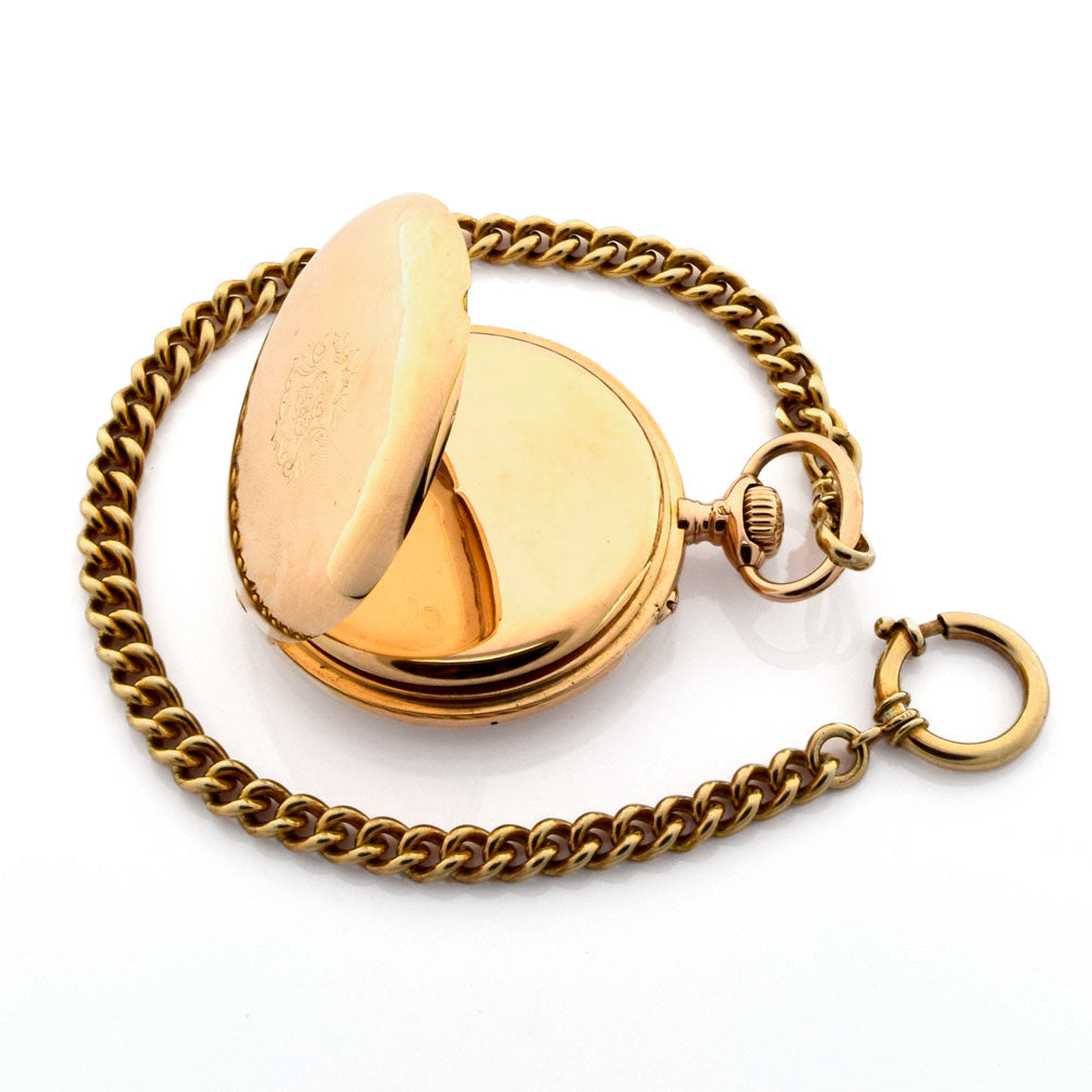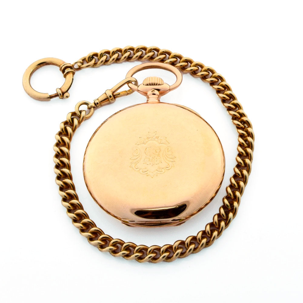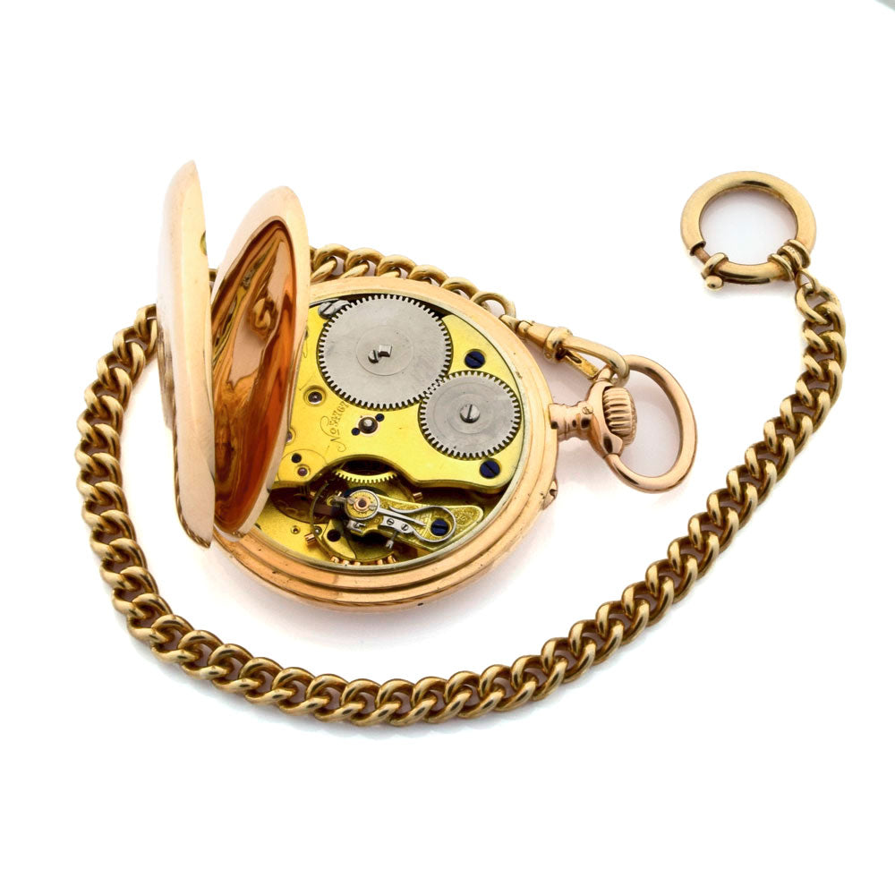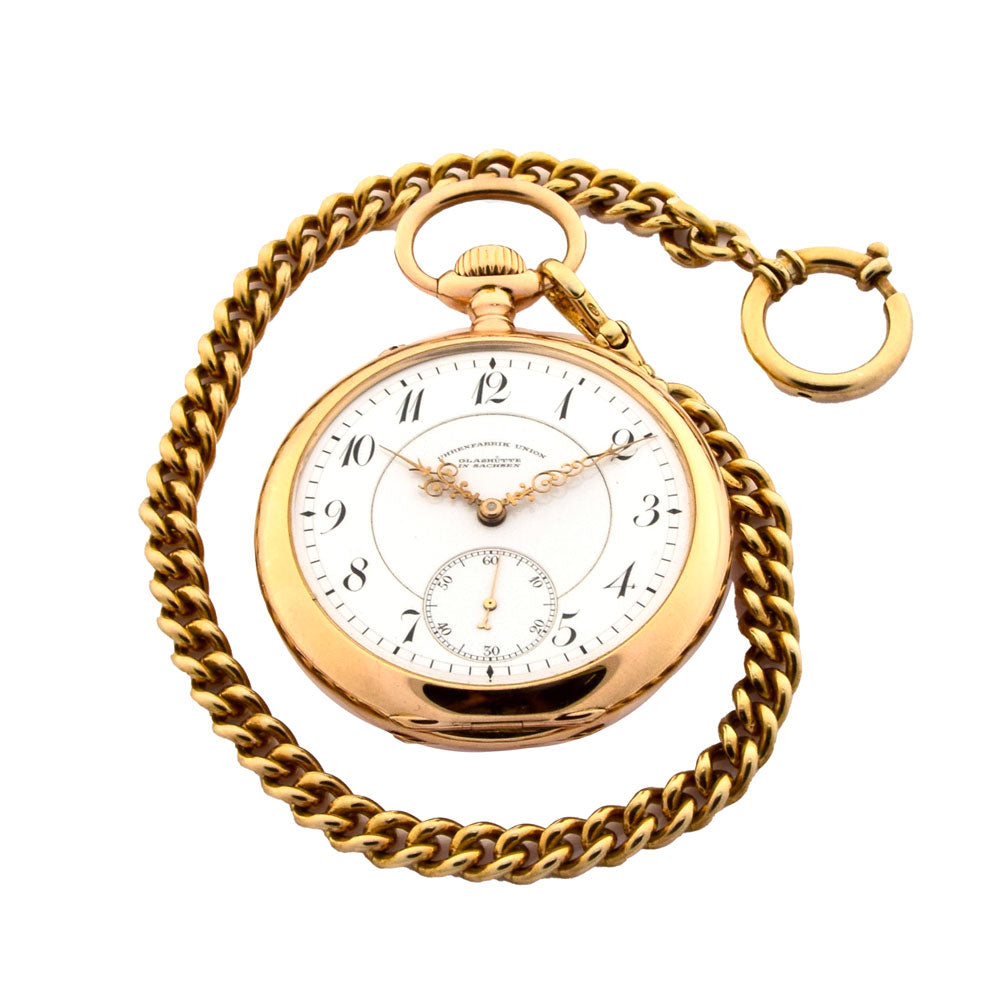 Bei dem Schmuckstück handelt es sich um eine Taschenuhr der Marke Union Glashütte. Das Material der Uhr ist 585 Rotgold. Sie besitzt einen Handaufzug. Die Taschenduhr ist aus der Zeit um 1900. Es erfolgte eine Revision durch Meisterwerkstatt im Jahr 2022.