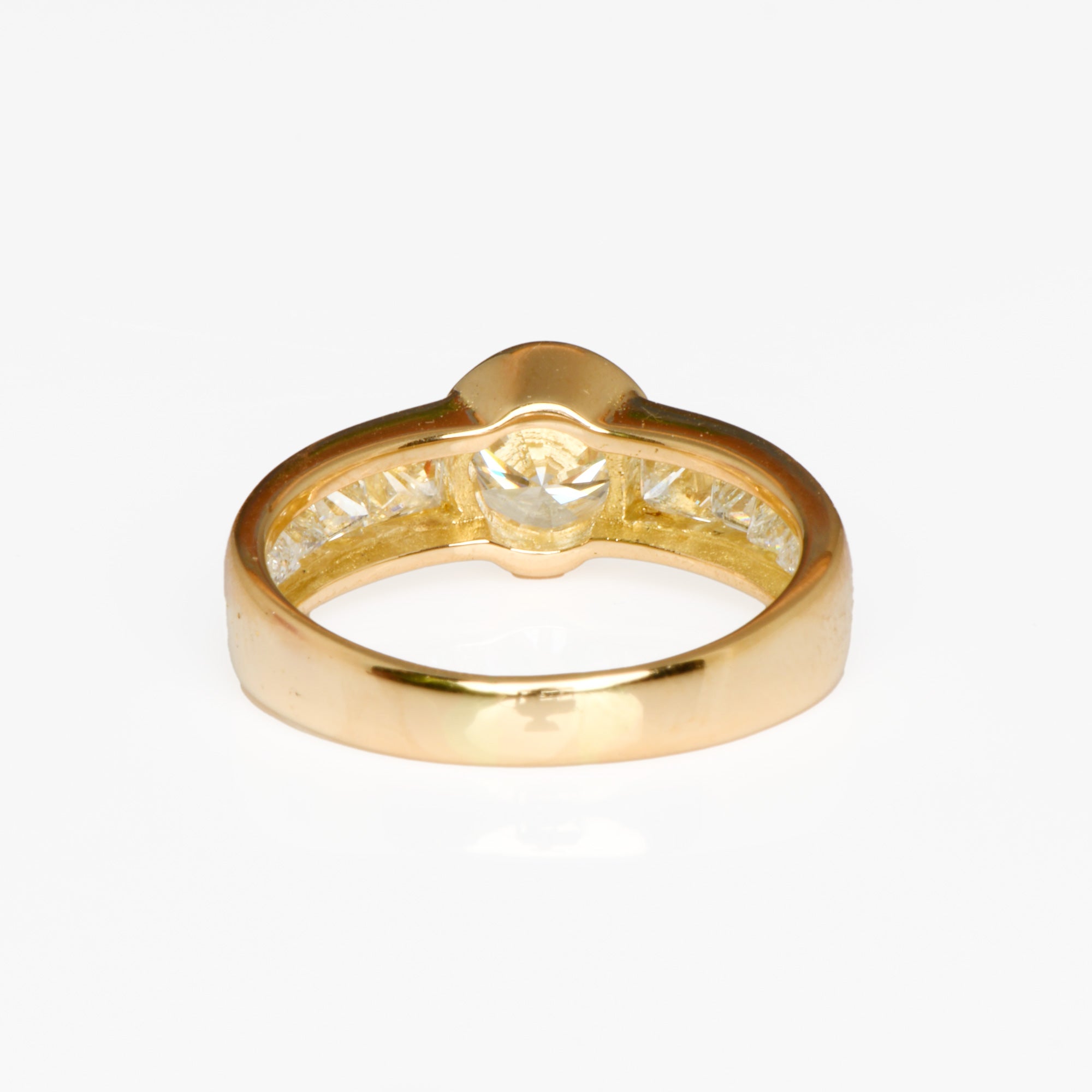 Bei dem Schmuckstück handelt es sich um einen Ring aus 750 Gelbgold mit einem Brillanten von ca. 1,07 ct in der Qualität feines Weiß und piqué 1 (TW/p 1) und acht Diamanten im Princesscut von zusammen ca. 1,12 ct in der Qualität feines Weiß mit sehr kleinen Einschlüssen (TW/vs).