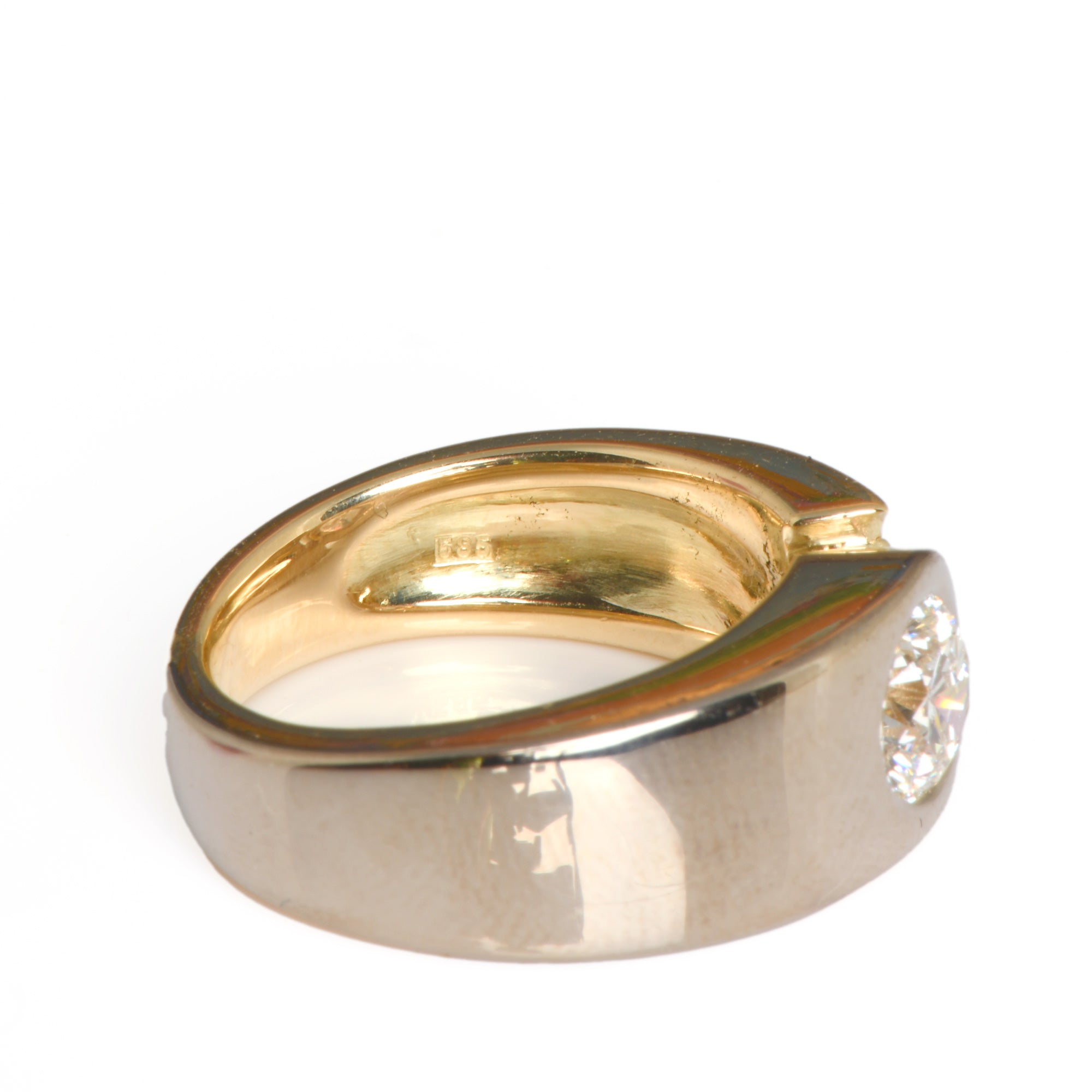 Bei dem Schmuckstück handelt es sich um einen Ring aus 585 Gelb- und Weißgold mit einem Brillanten von ca. 1,23 ct in der Qualität feines Weiß mit kleinen Einschlüssen (TW/si).