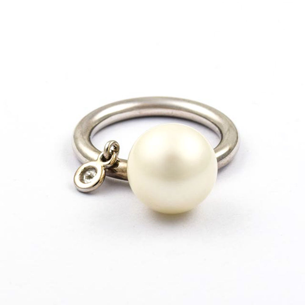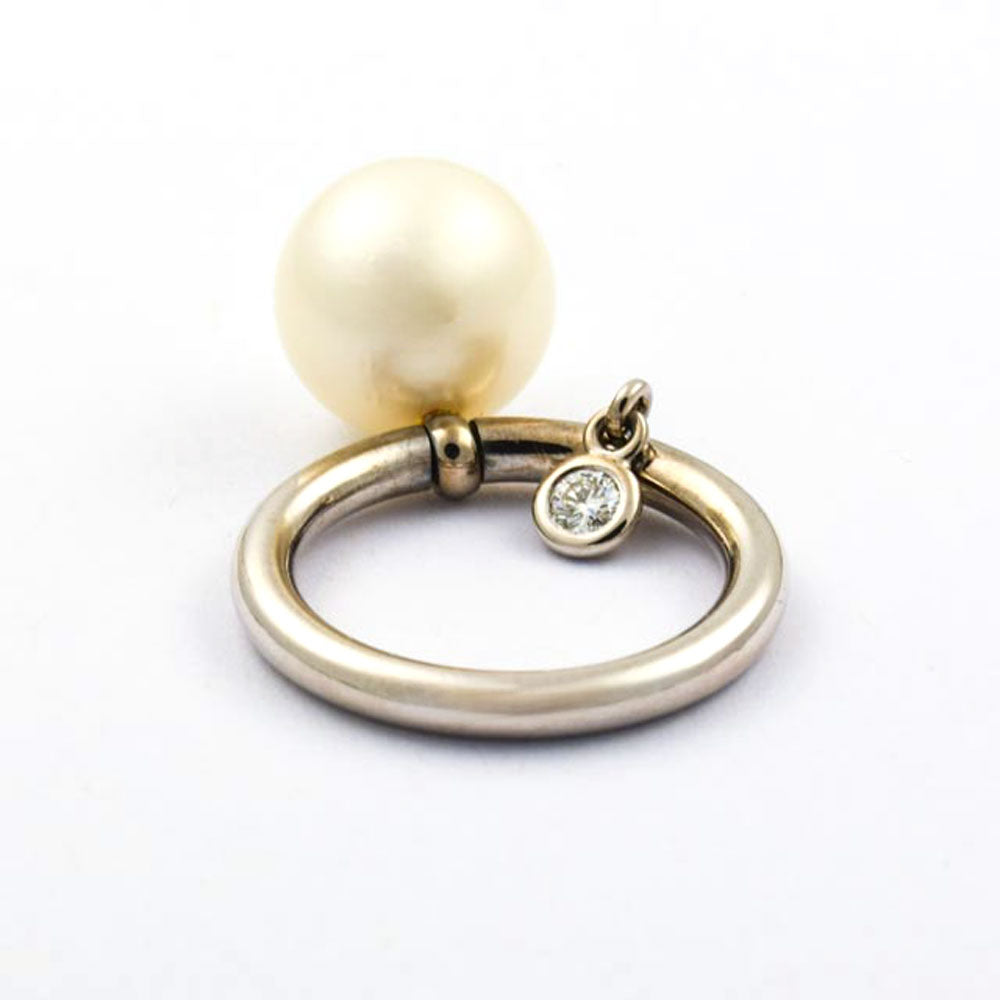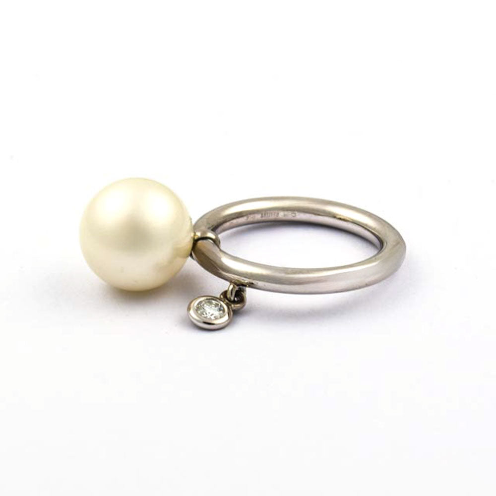 Bei dem Schmuckstück handelt es sich um einen Ring von Juwelier Katzler aus 750 Weißgold mit einer Südseezuchtperle und einem Brillanten von ca. 0,13 ct in der Qualität feines Weiß mit sehr kleinen Einschlüssen (TW/vs).