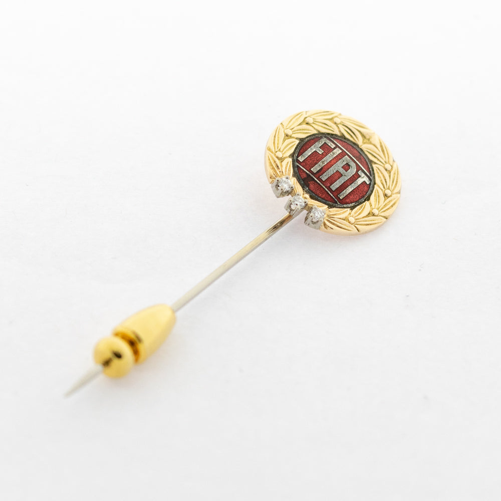 Bei dem Schmuckstück handelt es sich um einen emaillierten Krawattennadel Fiat aus 585 Gelb- und Weißgold mit drei Brillanten von zusammen ca. 0,06 ct.