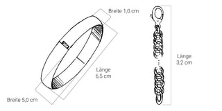 Bei eckigen oder ovalen Armreifen/-spangen messen wir die Innenmaße als Länge und Breite, diese wird in cm angegeben. Bei runden Armreifen/-spangen messen wir den Innendurchmesser, dieser wird in mm angegeben. Die Breite wird in cm angegeben.