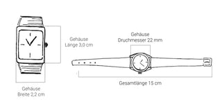 Gesamtlänge: Die Gesamtlänge wird vom ersten Loch des Armbandes bis zum Ende der Schließen inkl. des Gehäuses in cm gemessen.