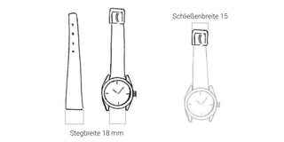 Stegbreite: Die Stegbreite ist die Breite des Armbandes an dem Ende, das an der Uhr befestigt wird. Sie misst den Abstand zwischen den Hörnern am Gehäuse.