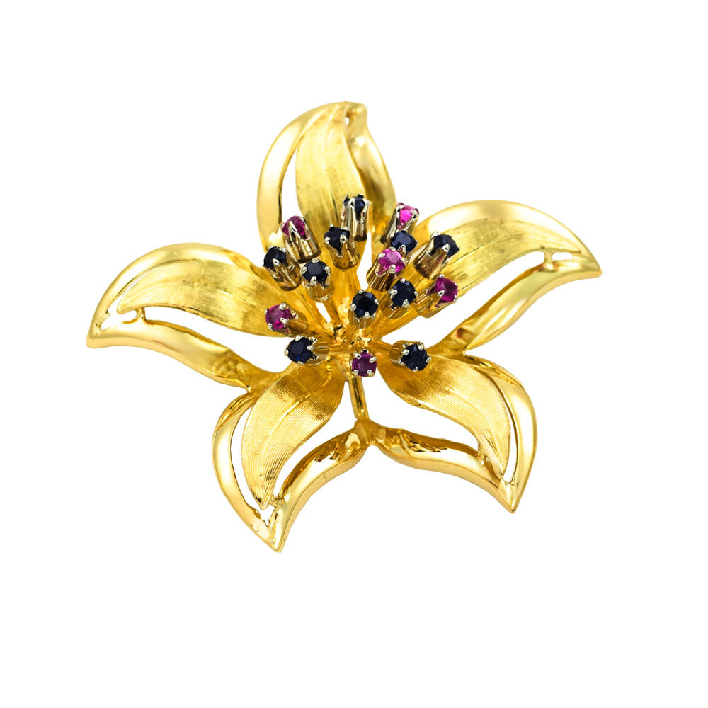 Bei dem Schmuckstück handelt es sich um einen Anhänger aus 750 Gelbgold mit zehn Saphiren und sechs Rubinen.
