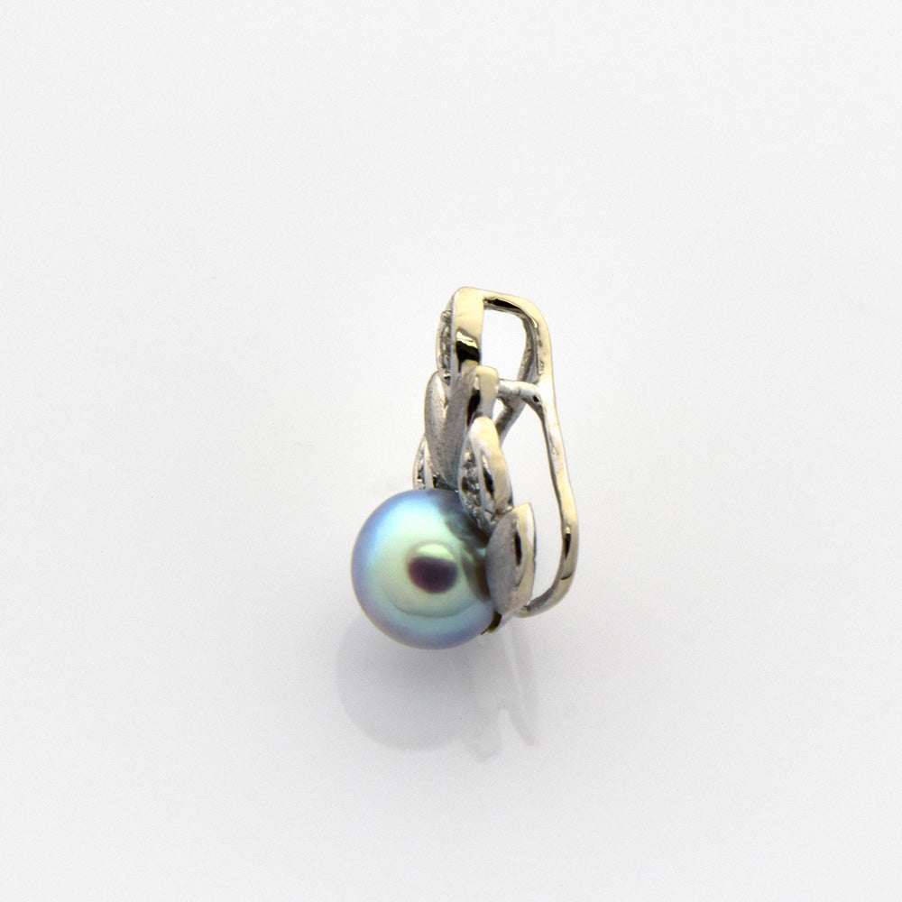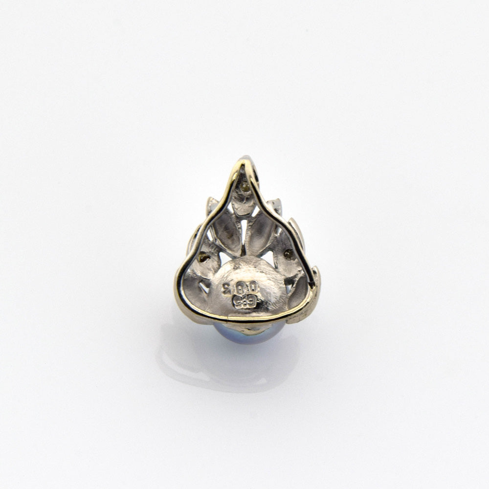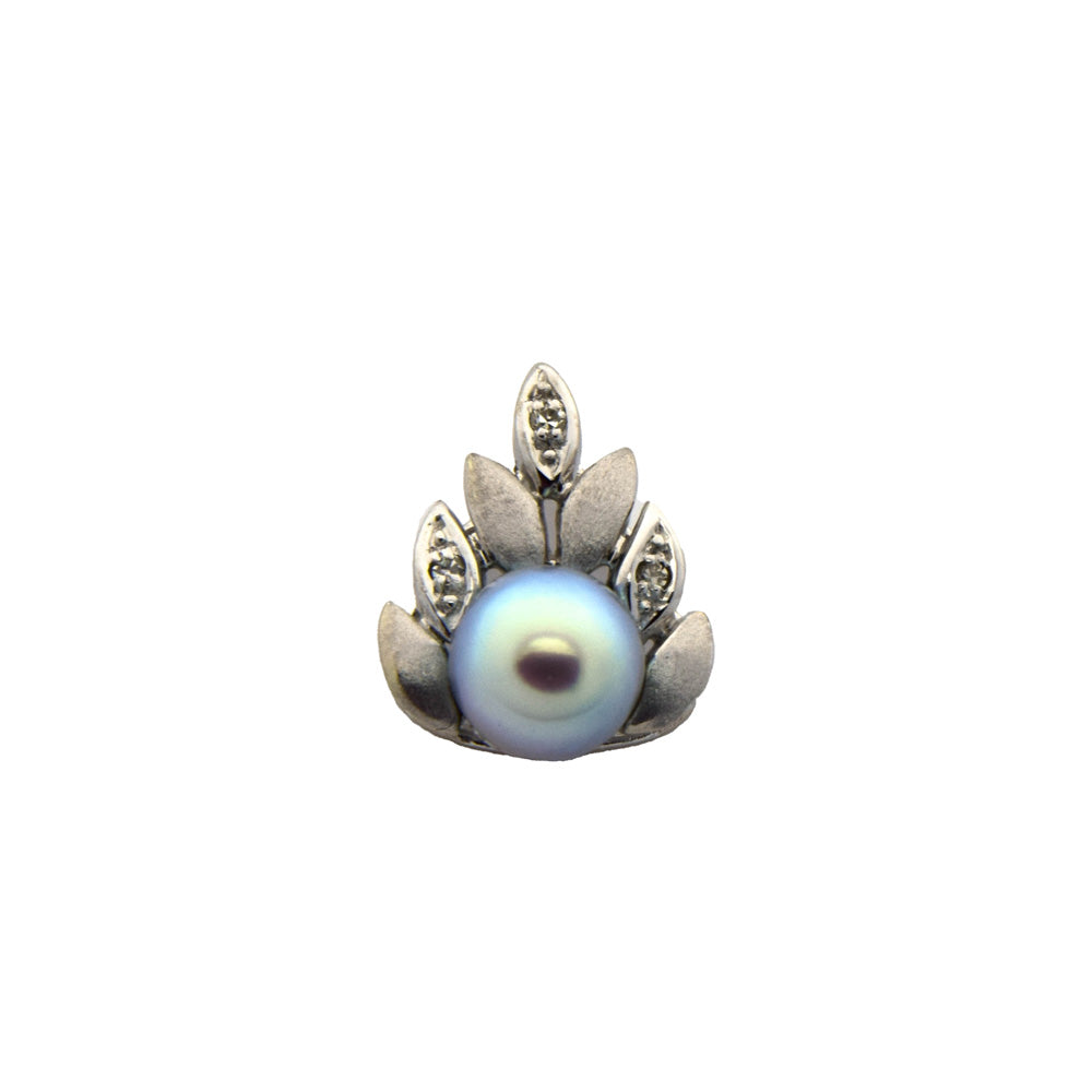 Bei dem Schmuckstück handelt es sich um einen Anhänger aus 585 Weißgold mit einer Zuchtperle und drei Diamanten im 8/8 Schliff von zusammen ca. 0,003 ct in der Qualität Weiß mit kleinen Einschlüssen (W/si).