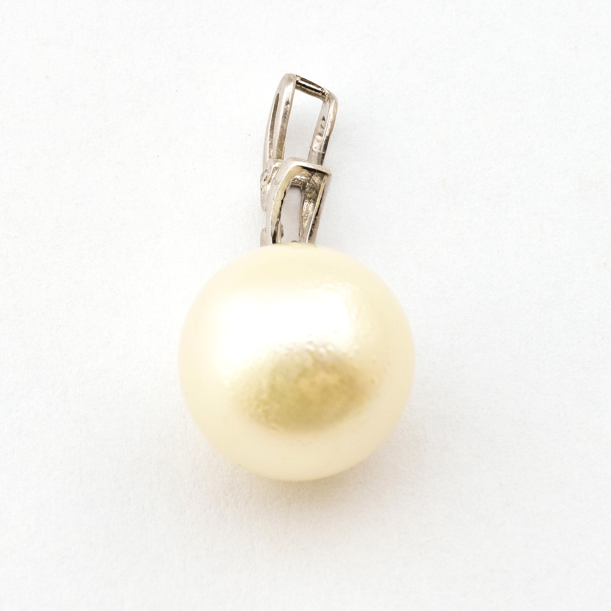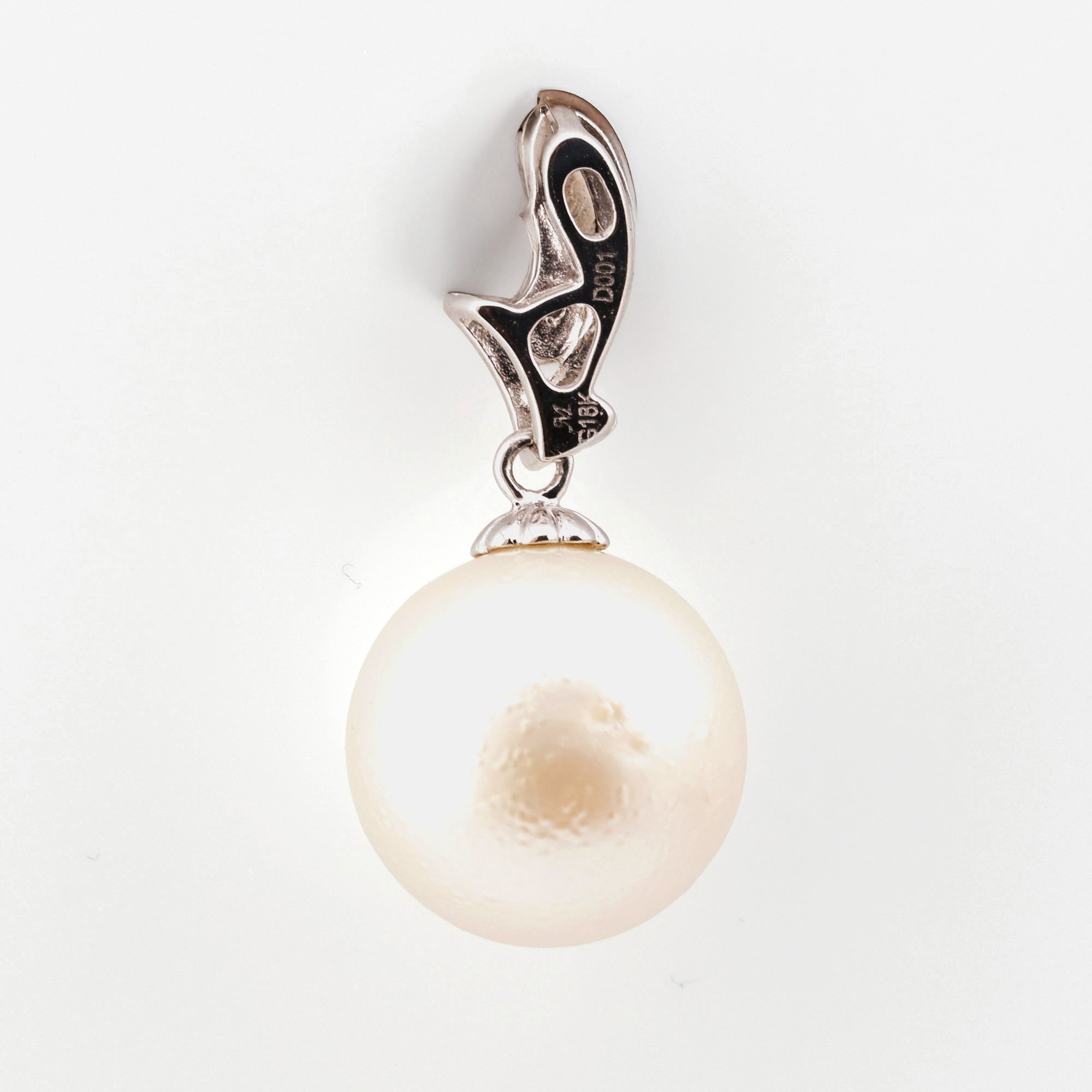Bei dem Schmuckstück handelt es sich um einen Anhänger aus 750 Weißgold mit einer Südseezuchtperle und einem Brillanten von ca. 0,001 ct in der Qualität Weiß mit kleinen Einschlüssen (W/si).
