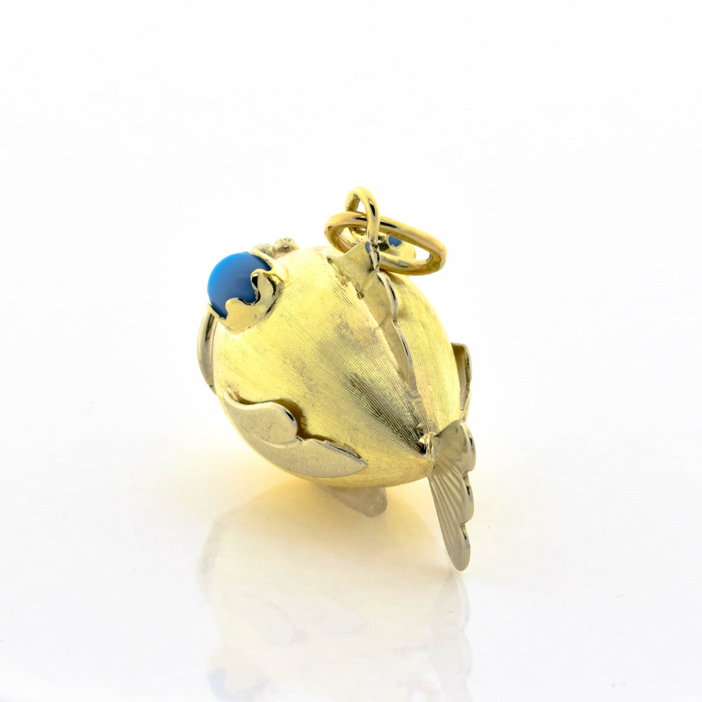Bei dem Schmuckstück handelt es sich um einen Anhänger "Fisch" aus 585 Gelb- und Weißgold mit zwei Türkiscabochons.