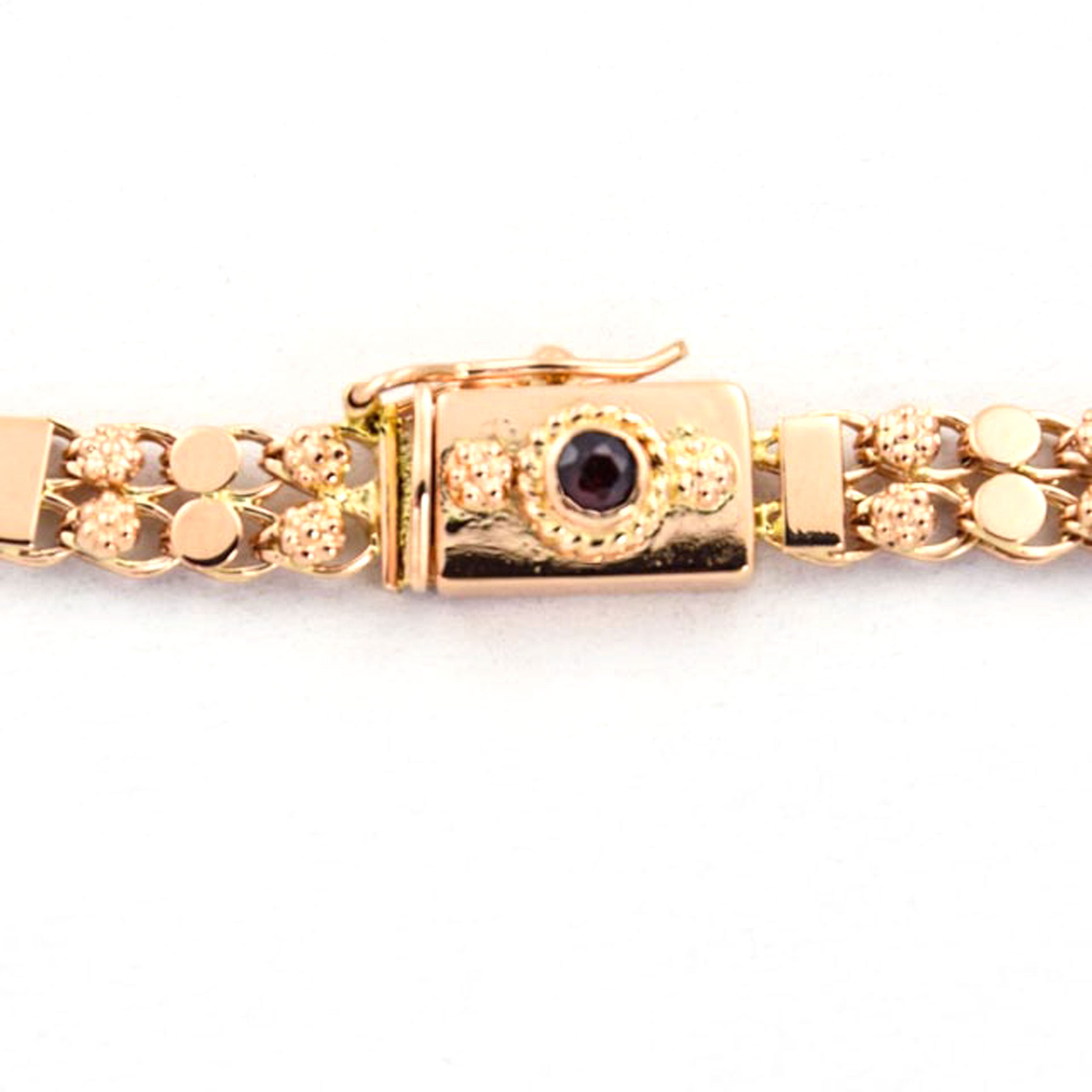 Bei dem Schmuckstück handelt es sich um ein Armband aus 585 Roségold mit einem Granat. Das Schmuckstück hat eine Gesamtlänge von 20,5 cm.