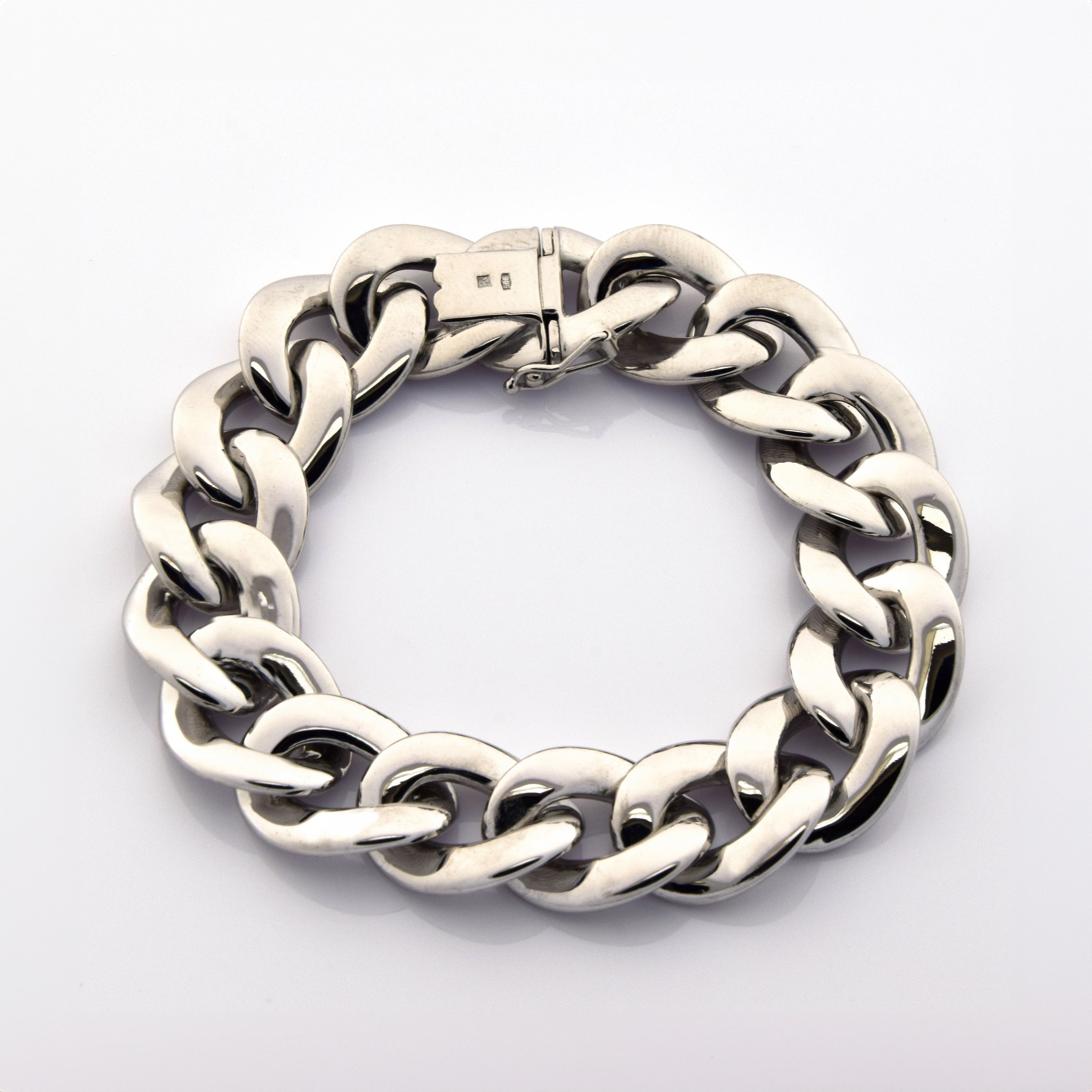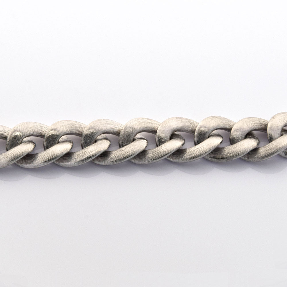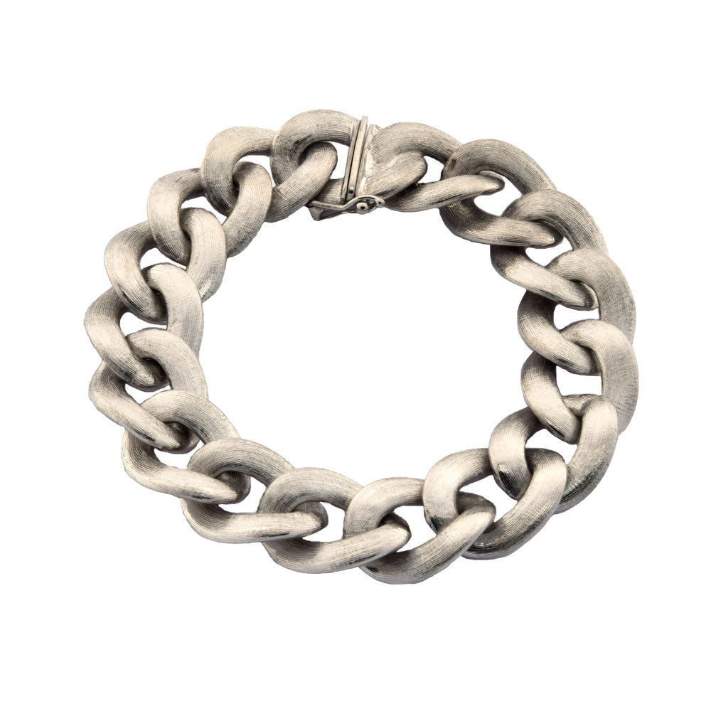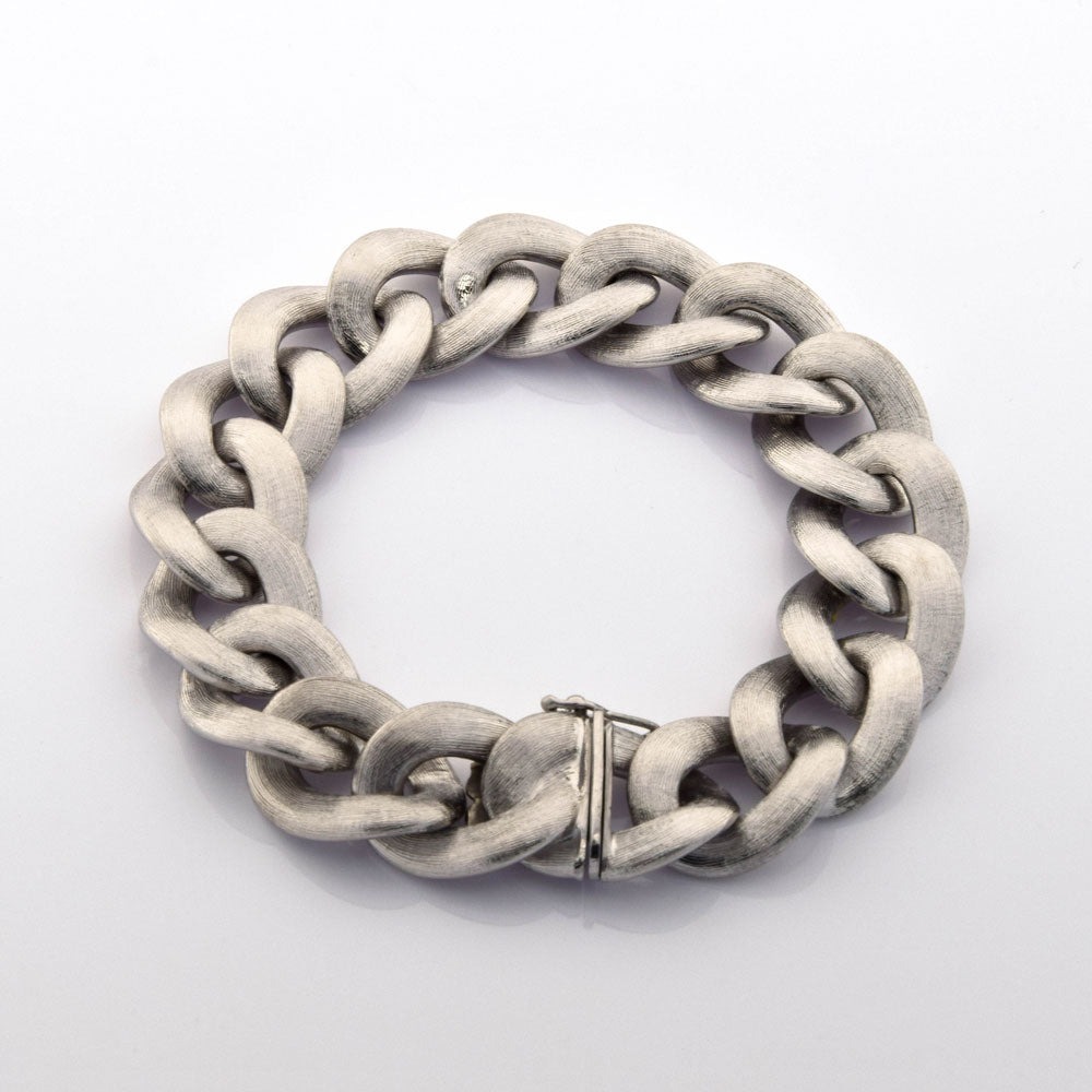 Bei dem Schmuckstück handelt es sich um ein sattiniertes Armband aus 585 Weißgold. Das Schmuckstück hat eine Gesamtlänge von 19 cm.