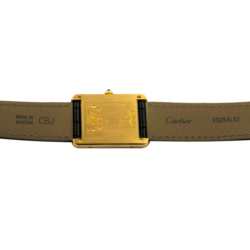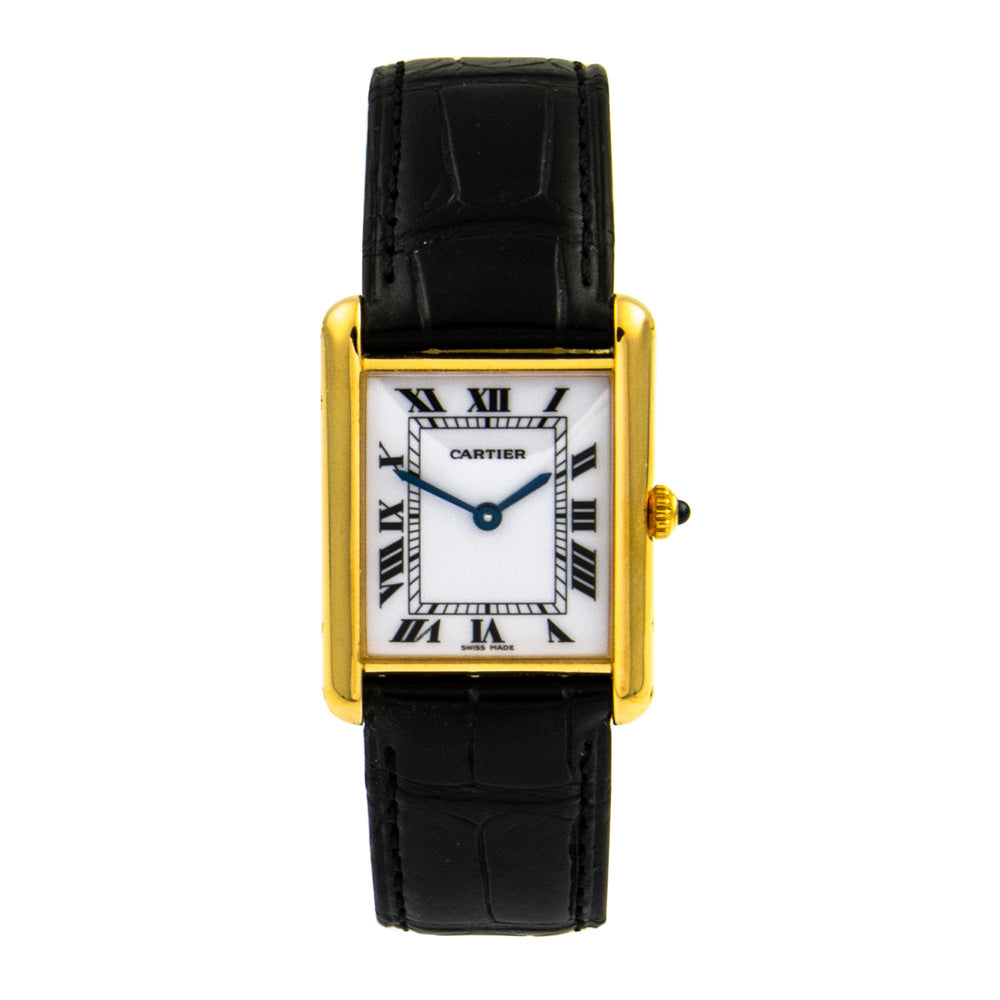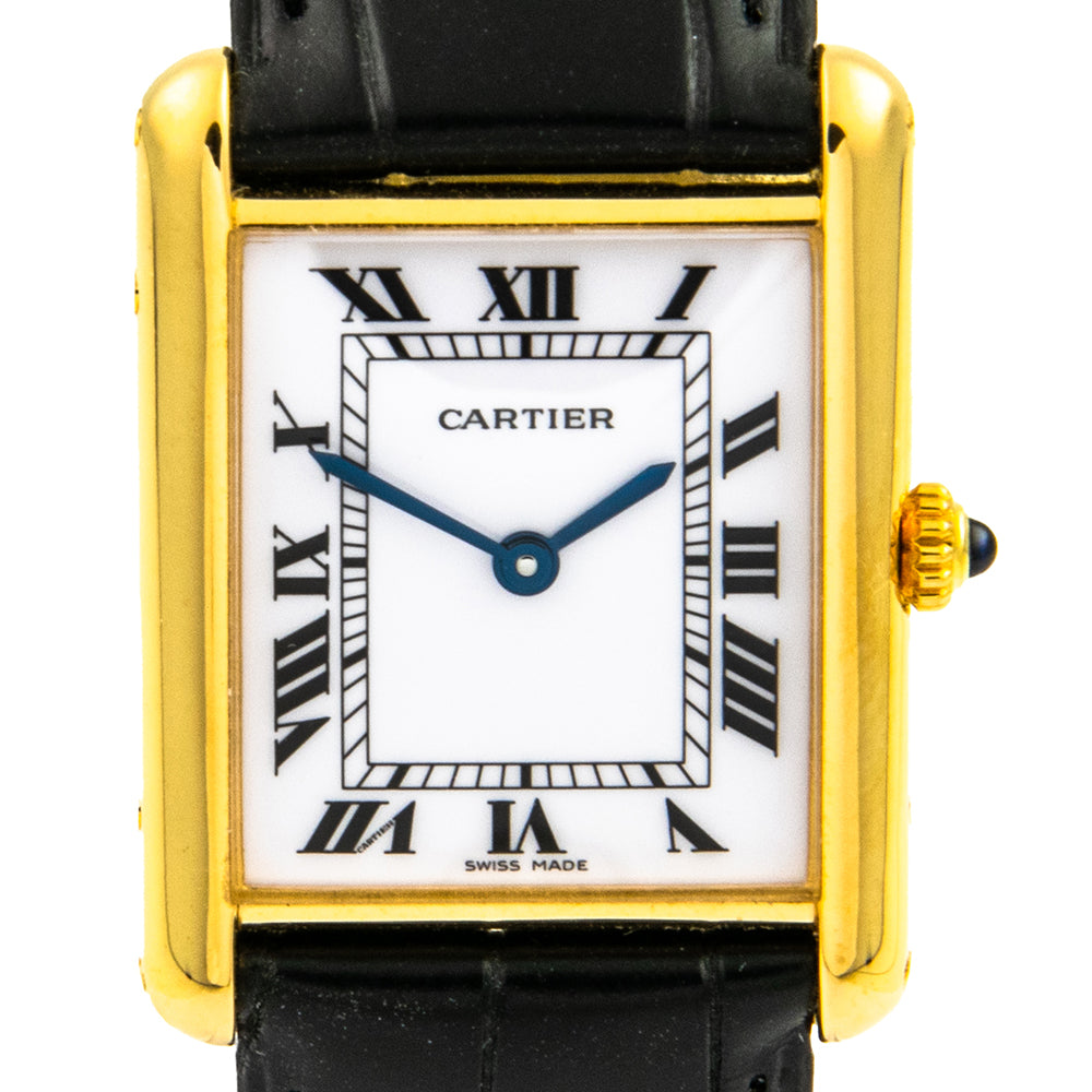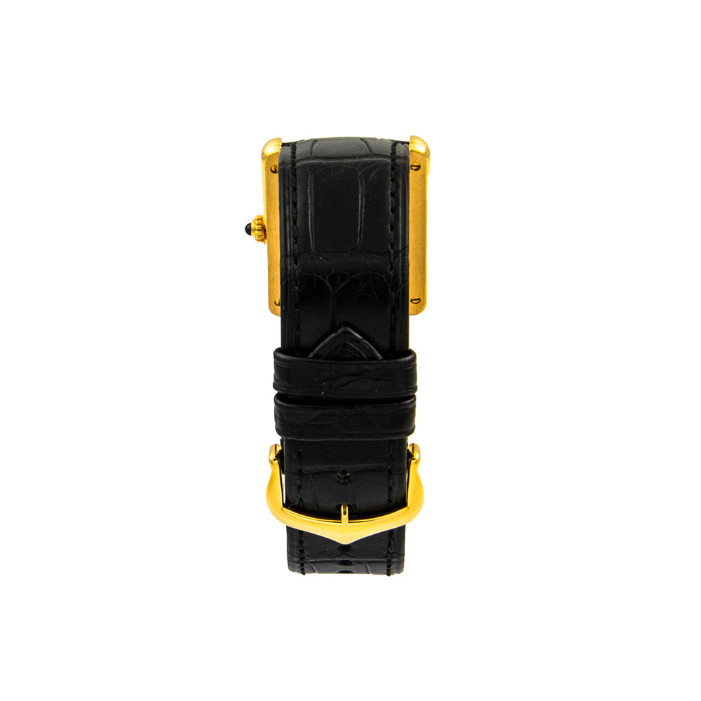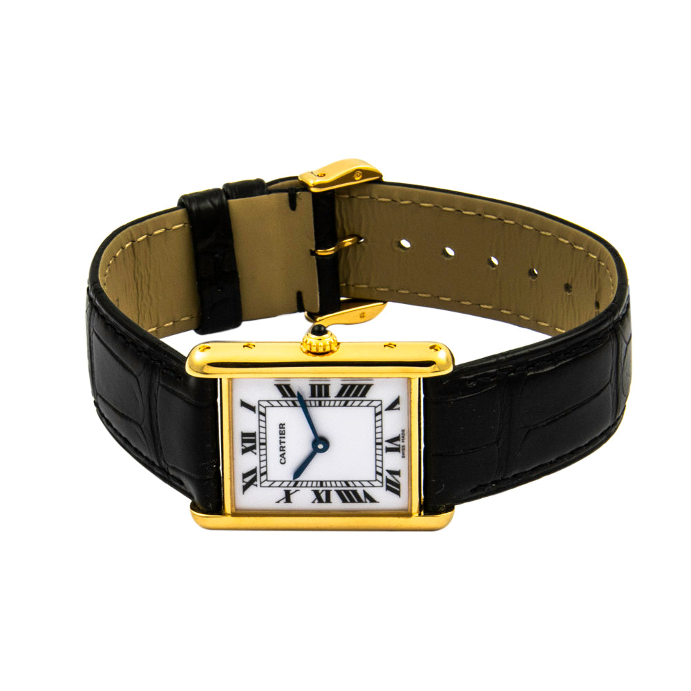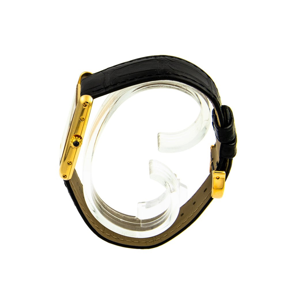 Bei dem Schmuckstück handelt es sich um eine Damenarmbanduhr der Marke Cartier Modell "Tank Quartz" mit der Referenznummer 2385. Das Material der Uhr ist 750 Gelbgold. Sie besitzt ein Quarzwerk Kaliber 81 mit 9 Steinen. Die Uhr verfügt über Zeiger aus gebläutem Stahl und einen Saphir auf der Krone. Es erfolgte eine Revision durch Cartier.