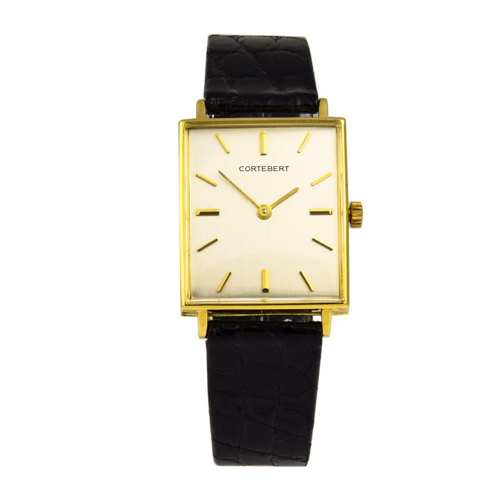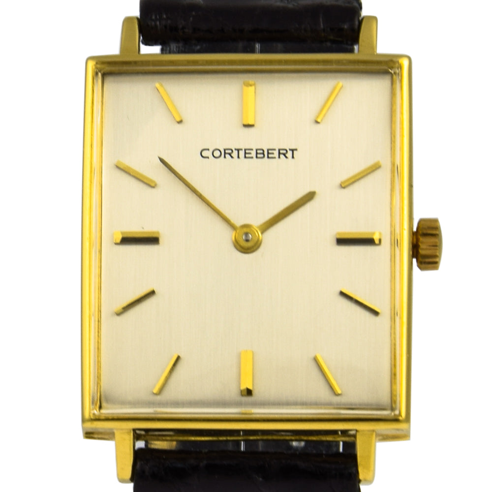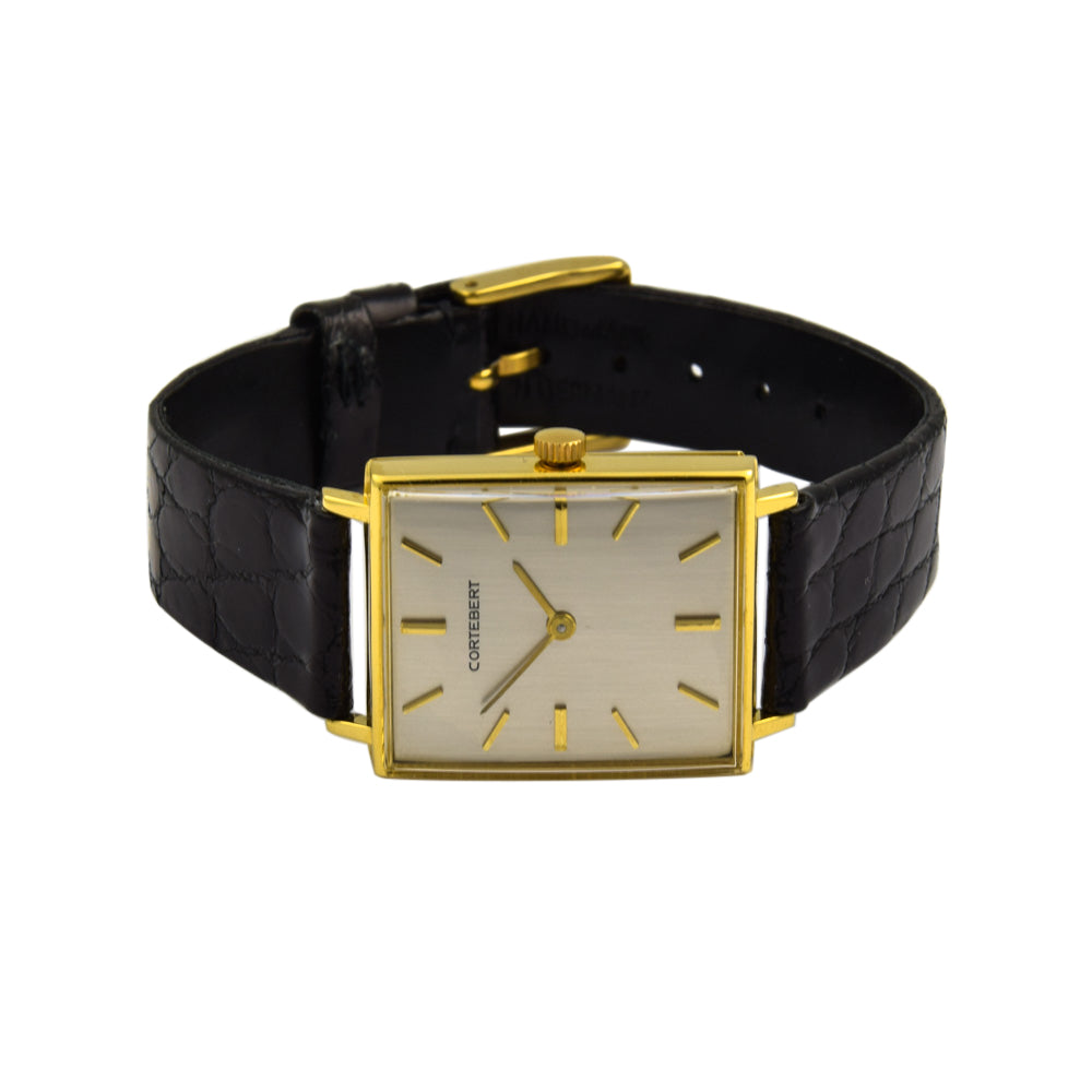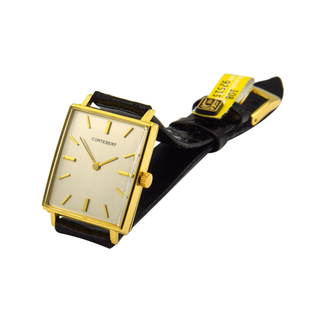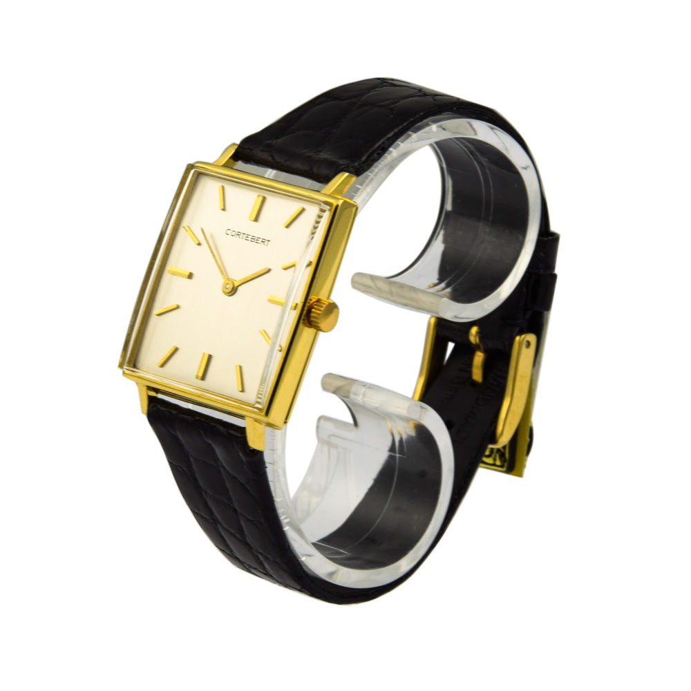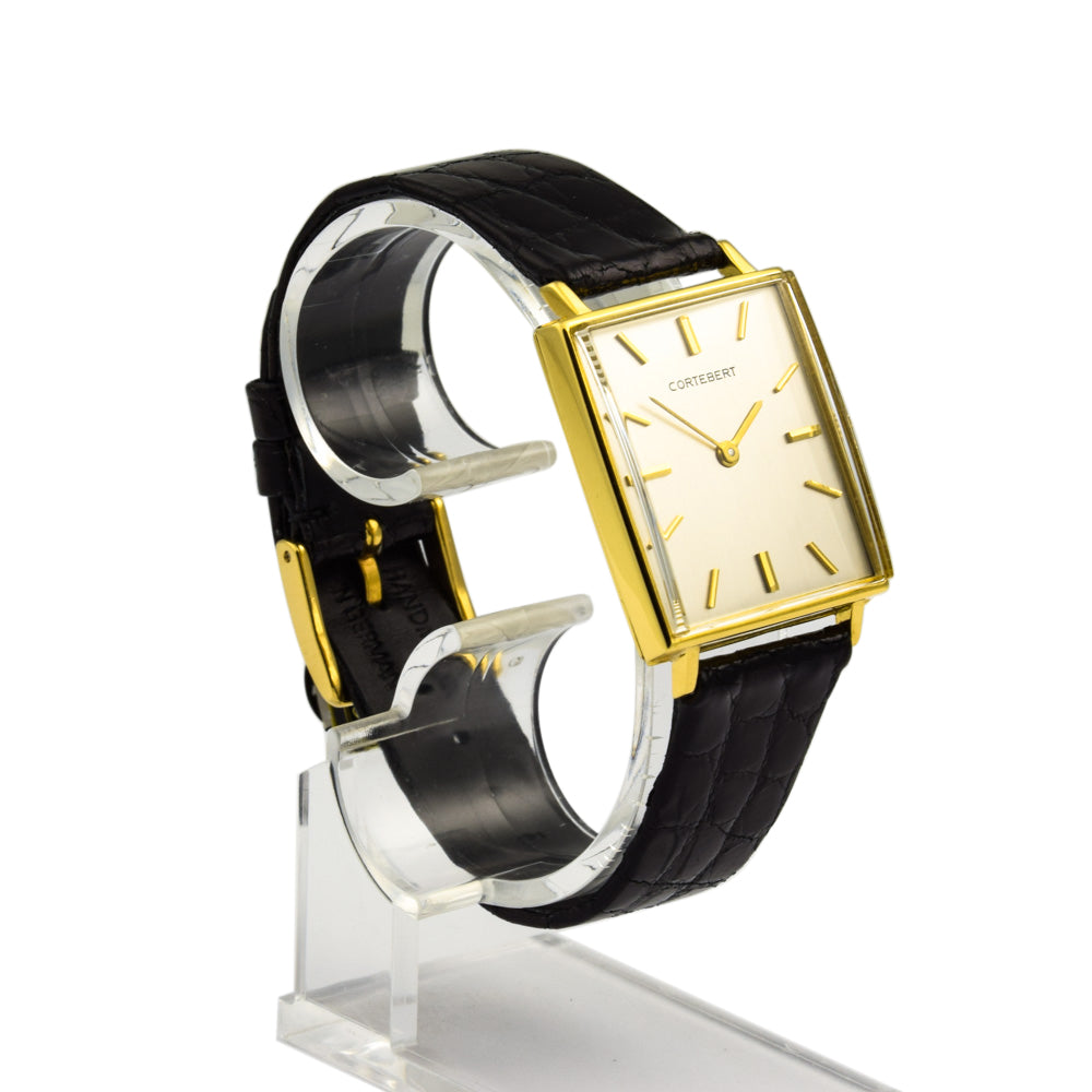Bei dem Schmuckstück handelt es sich um eine Herrenarmbanduhr der Marke Cortebert mit der Referenznummer 5801. Das Material der Uhr ist 750 Gelbgold. Sie besitzt ein Handaufzugswerk Kaliber Aurore-Villeret 423 mit 17 Steinen. Sie hat eine Gangreserve von 42 Stunden. Die Uhr stammt aus der Zeit der 1950er Jahre. Es erfolgte eine Revision durch Meisterwerkstatt.