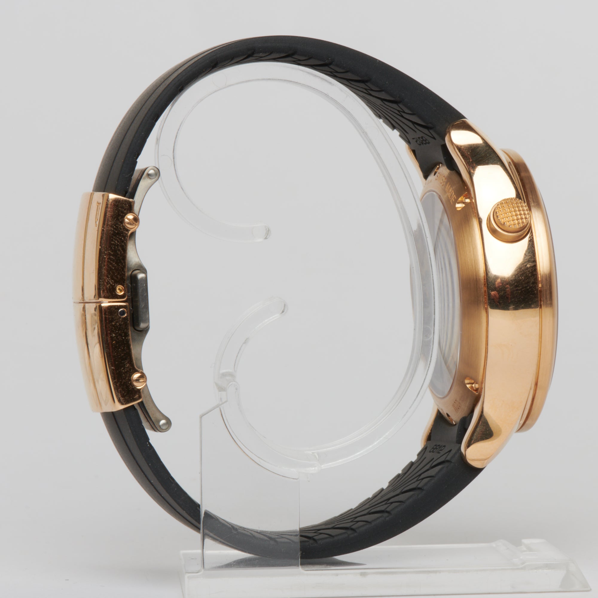 Bei dem Schmuckstück handelt es sich um eine Herrenarmbanduhr der Marke Eterna Modell "Porsche Design PTR Dashboard" mit der Referenznummer P6613.69/1. Das Material der Uhr ist 750 Roségold. Die Uhr ist mit einem Chronographen, Datumsanzeige, Doppelchronograph, Tachymeter, Monatsanzeige und Rattrapante-Chronograph ausgestattet und verfügt über Chronometer, Kleine Sekunde, Leuchtindizes, Leuchtzeiger, Sichtboden und verschraubte Krone. Es erfolgte eine Revision durch Meisterwerkstatt im Jahr 2024.
