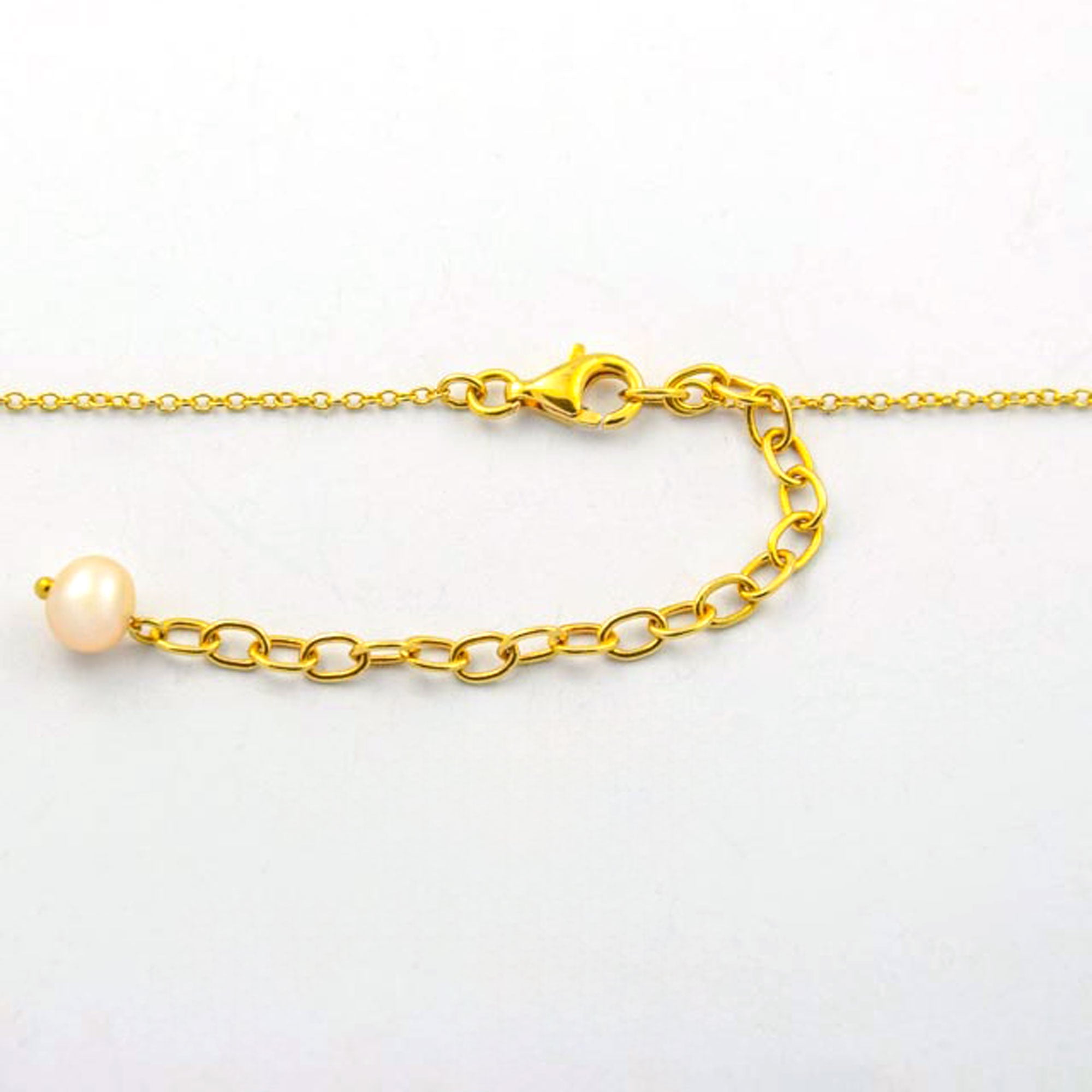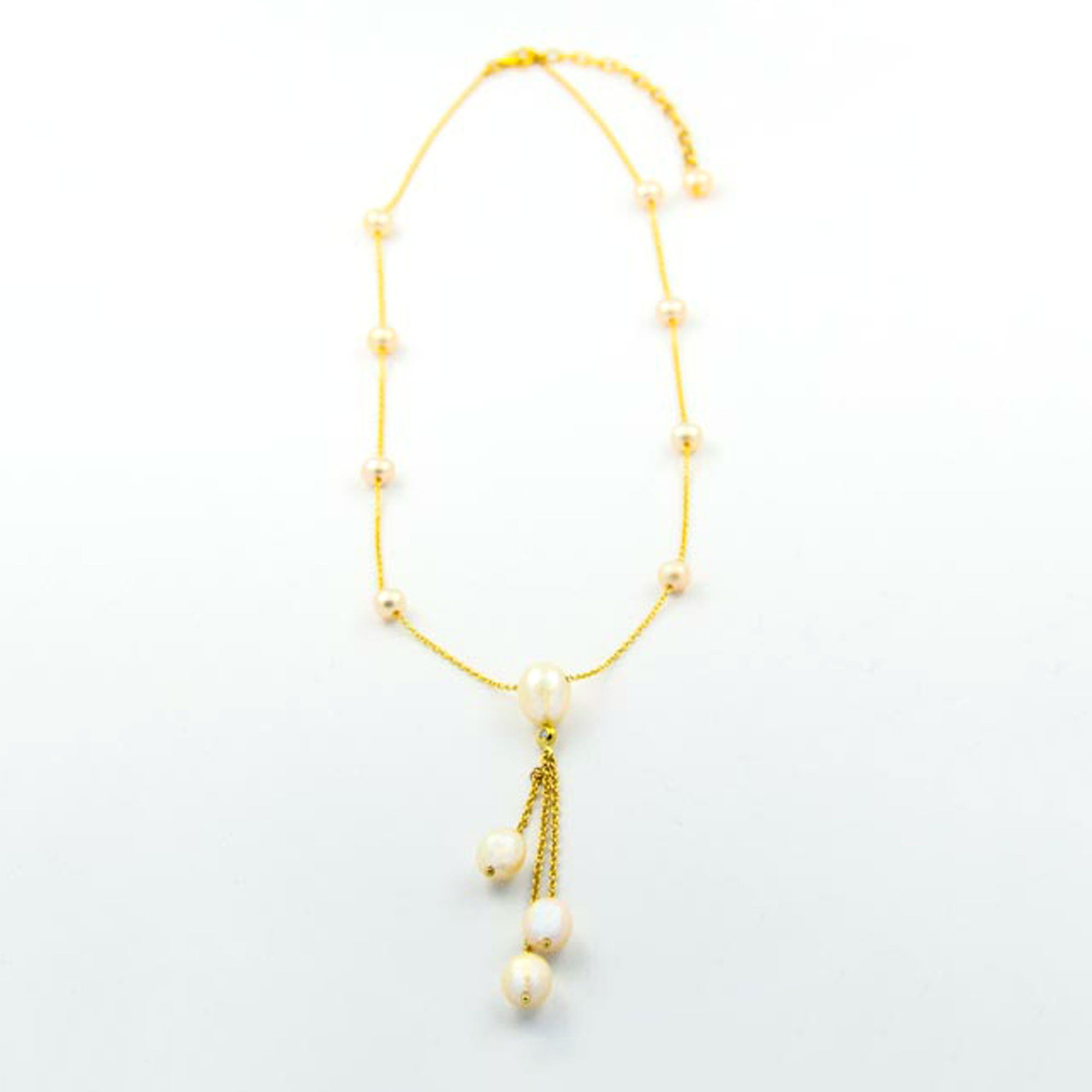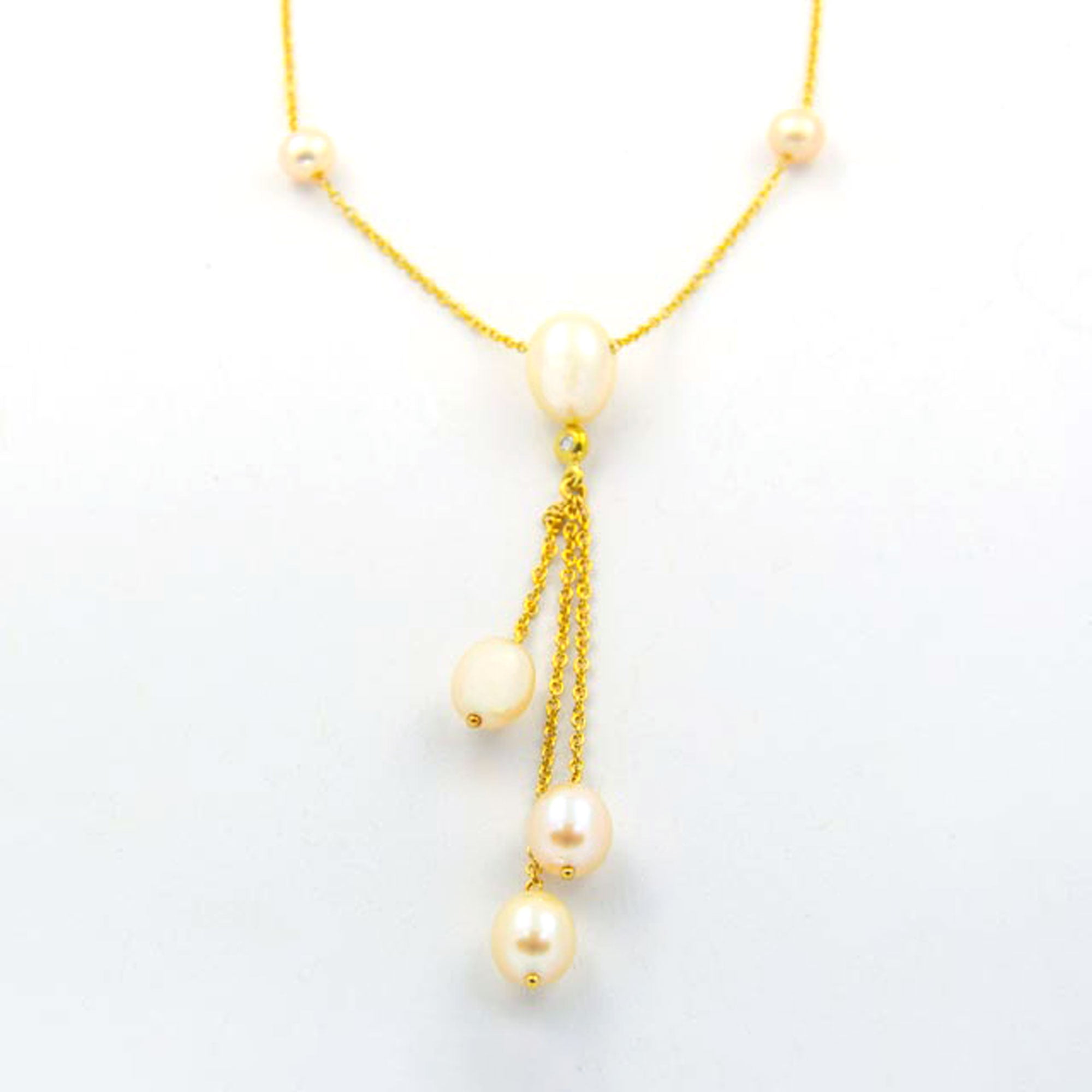 Bei dem Schmuckstück handelt es sich um eine Halskette aus 750 Gelbgold mit 13 Zuchtperlen und einem Brillanten von ca. 0,02 ct in der Qualität Weiß mit kleinen Einschlüssen (W/si). Das Schmuckstück hat eine Gesamtlänge von 40 cm.