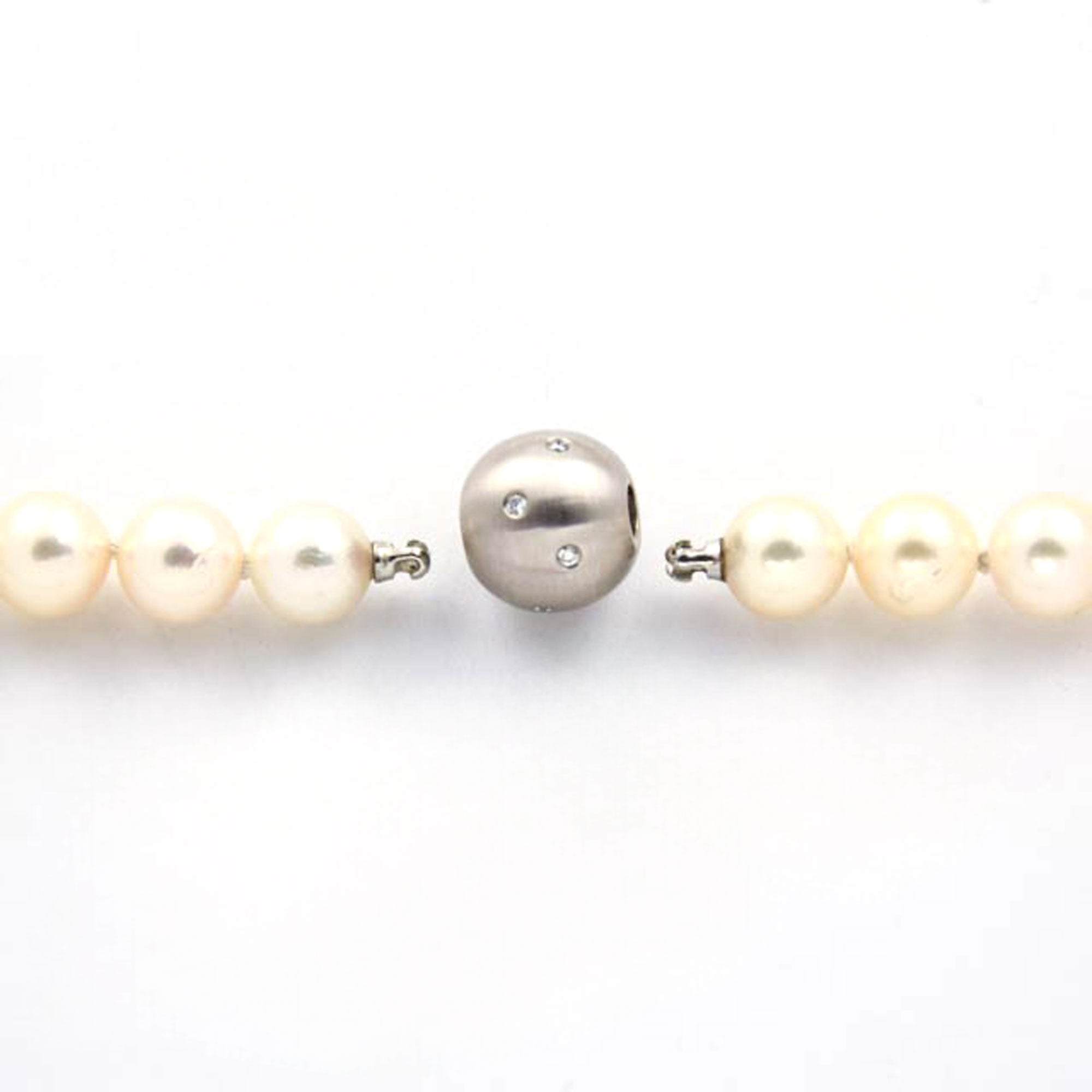 Bei dem Schmuckstück handelt es sich um eine Halskette aus Akoyazuchtperlen mit Schließe aus 750 Weißgold mit acht Brillanten von zusammen ca. 0,08 ct in der Qualität Weiß und piqué 1 (W/p 1). Das Schmuckstück hat eine Gesamtlänge von 46 cm.