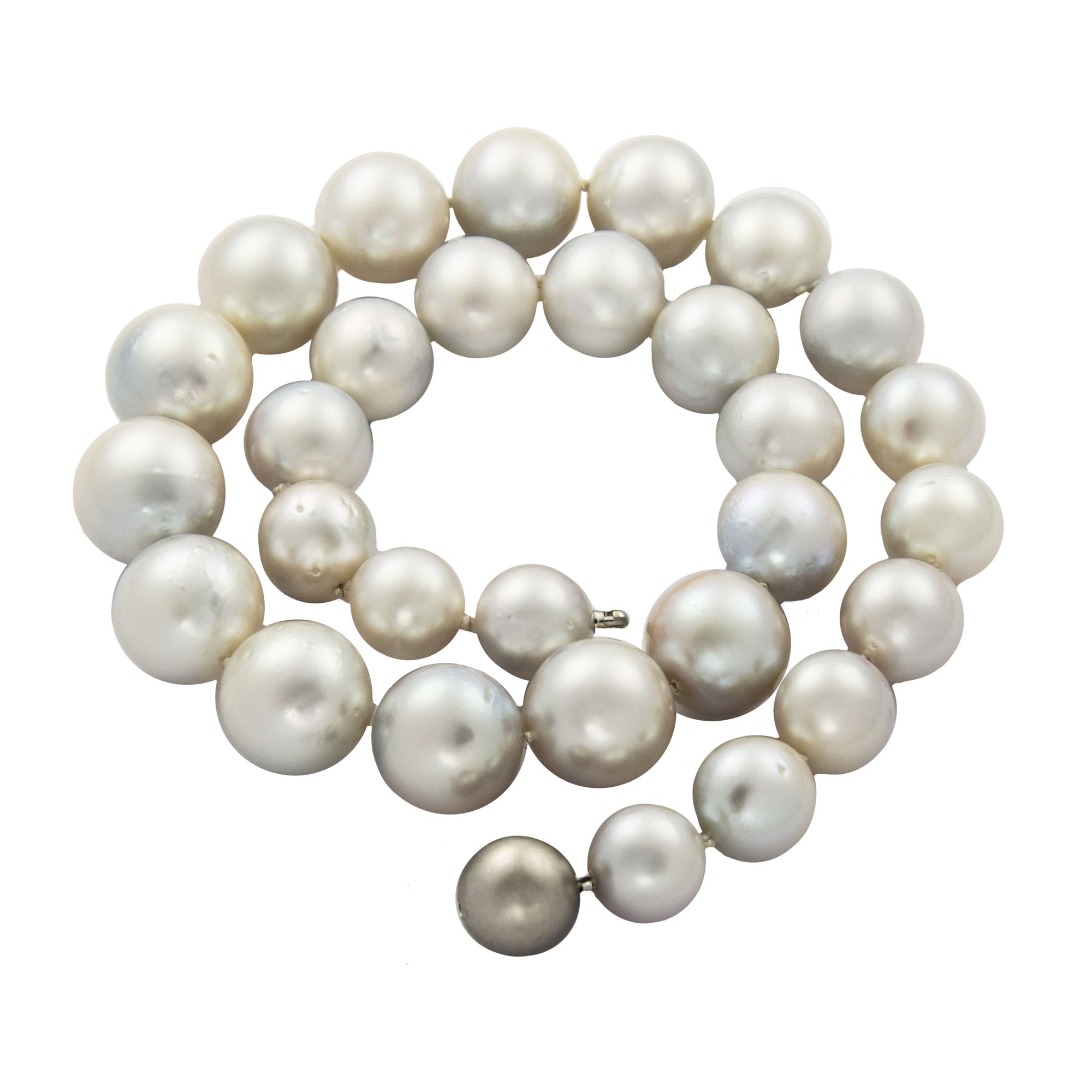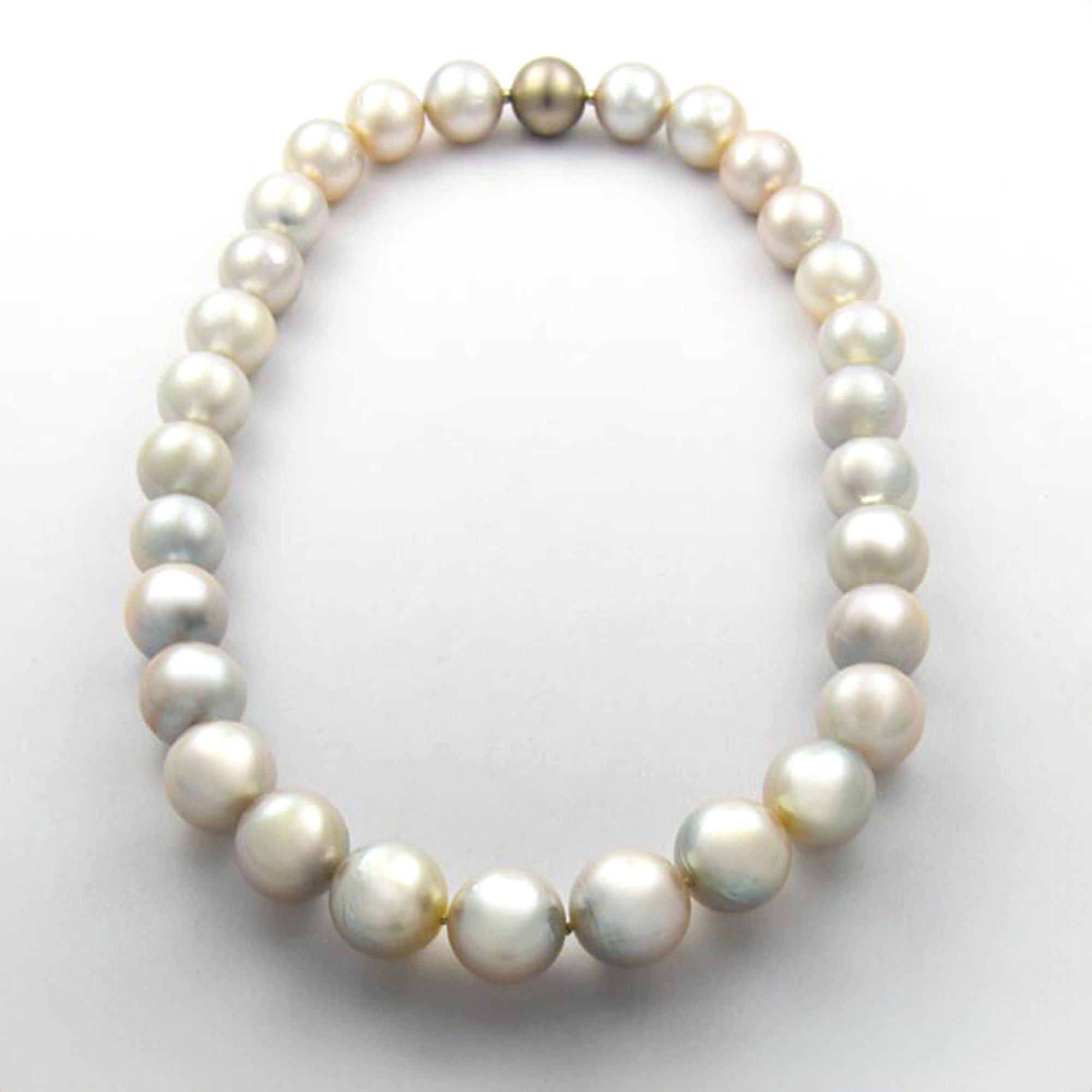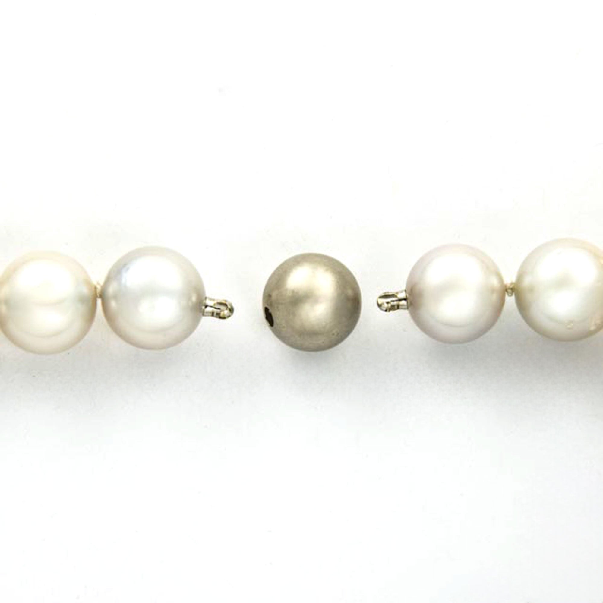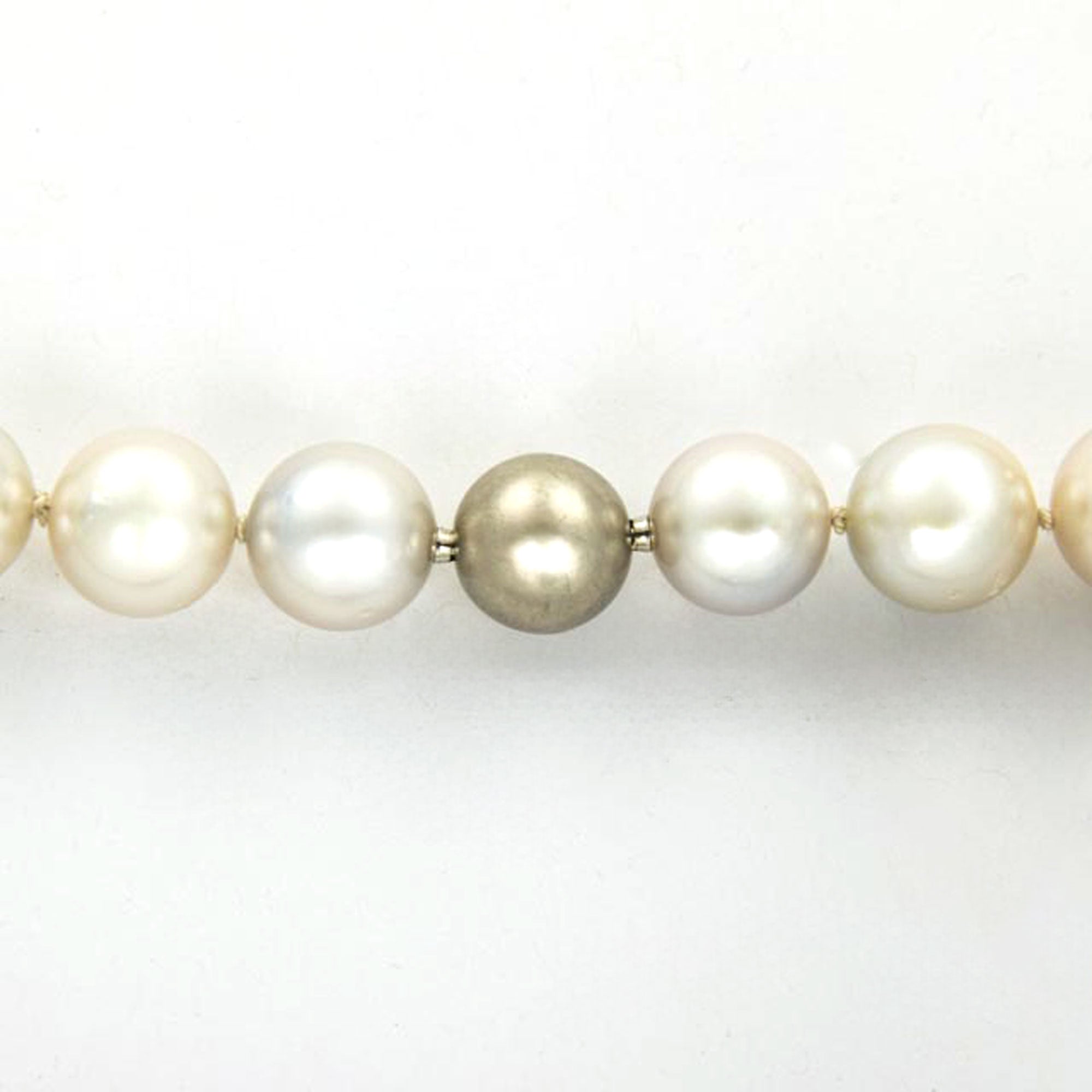 Bei dem Schmuckstück handelt es sich um eine Südseeperlenkette mit Wechselschließe aus 950 Platin. Das Schmuckstück hat eine Gesamtlänge von 47 cm.