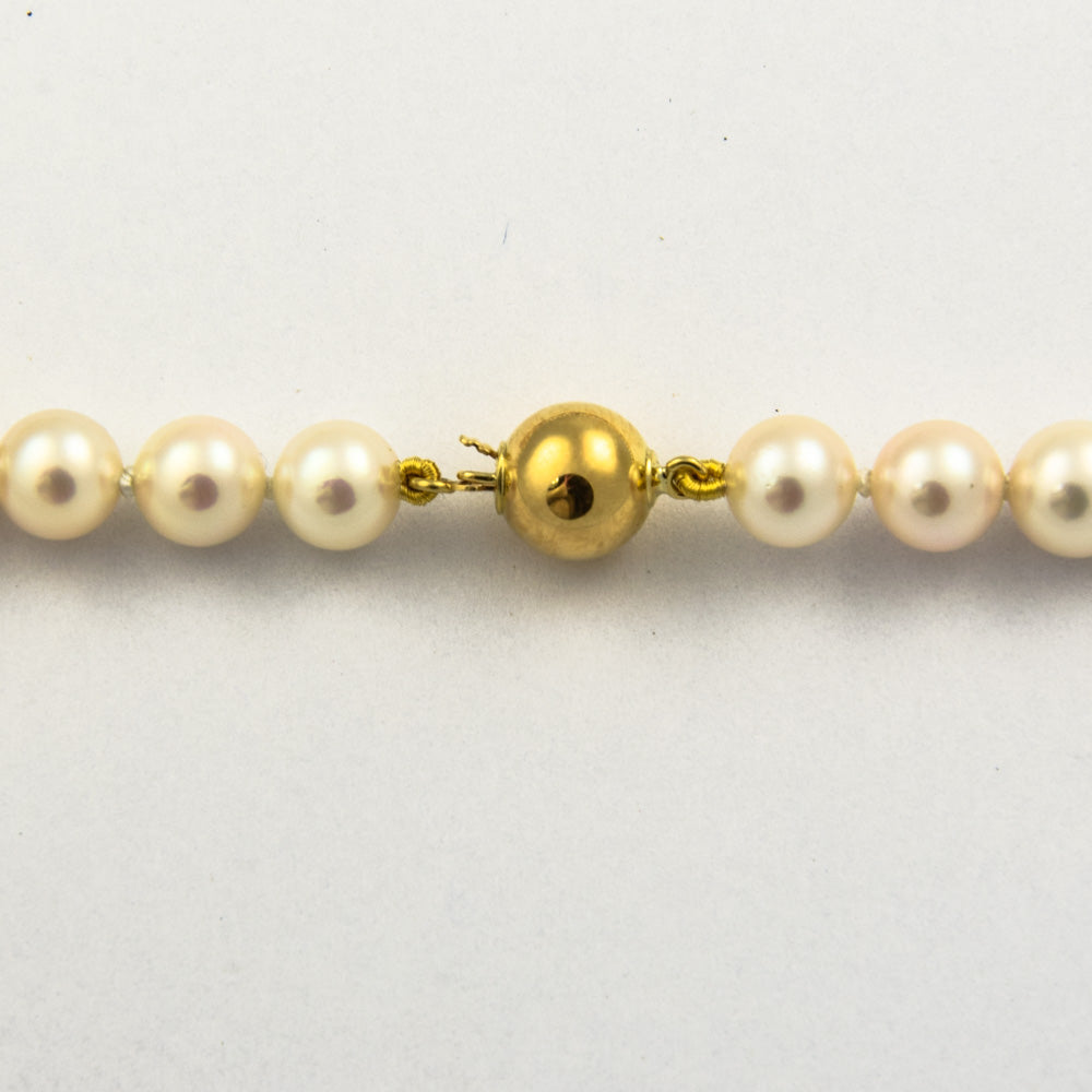 Bei dem Schmuckstück handelt es sich um eine Zuchtperlenkette mit Kugelschließe und Zwischenteilen aus 750 Gelbgold. Das Schmuckstück hat eine Gesamtlänge von 45 cm.