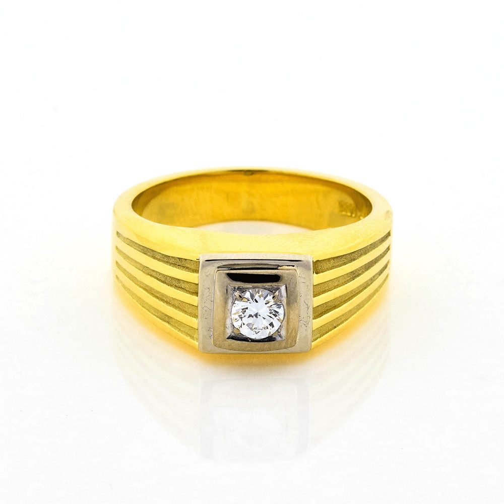 Bei dem Schmuckstück handelt es sich um einen Herrenring aus 750 Gelb- und Weißgold mit einem Brillanten von ca. 0,33 ct in der Qualität feines Weiß mit kleinen Einschlüssen (TW/si).