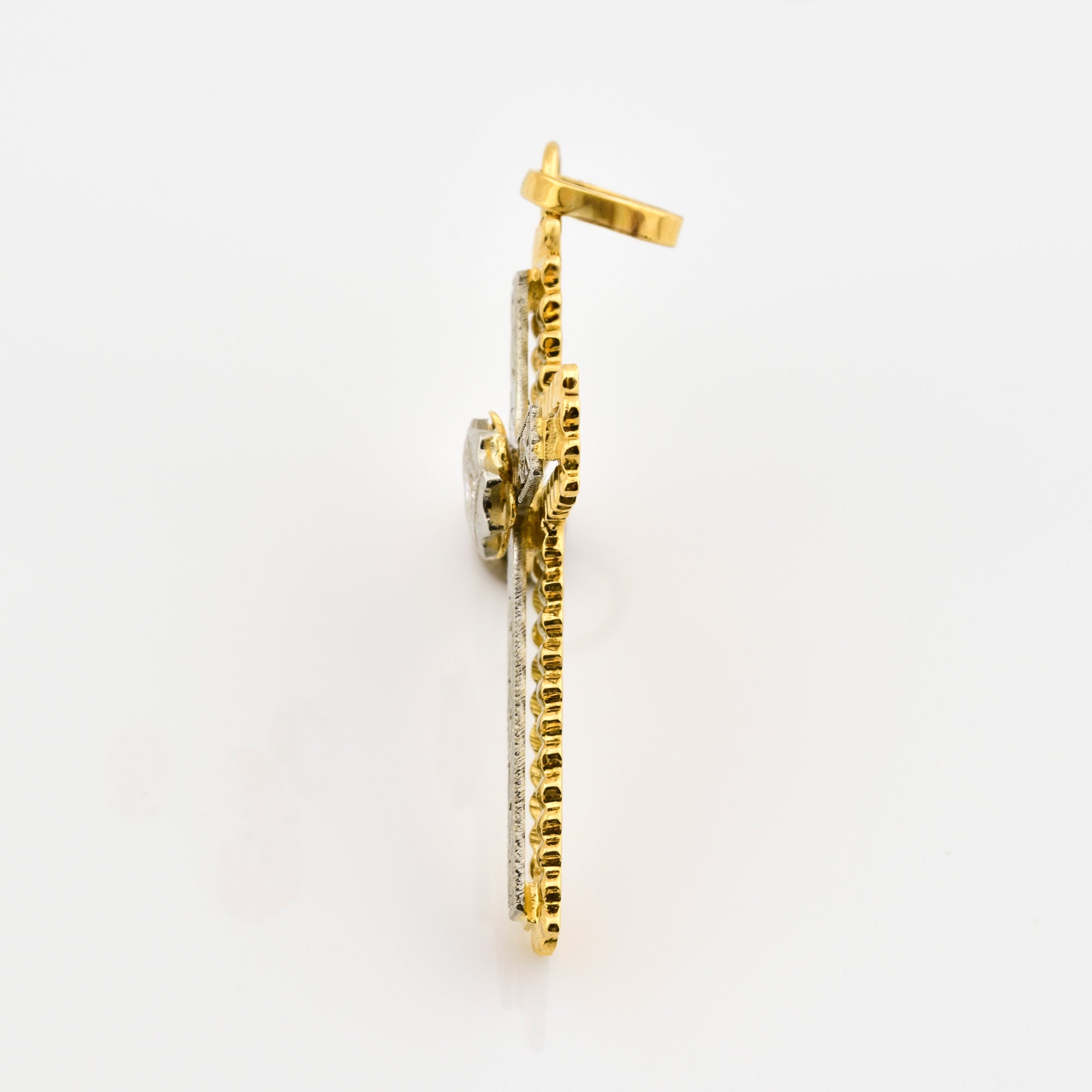Bei dem Schmuckstück handelt es sich um einen Kreuzanhänger aus 750 Gelb- und Weißgold mit einem Brillanten im Altschliff von ca. 0,06 ct in der Qualität Weiß mit kleinen Einschlüssen (W/si).
