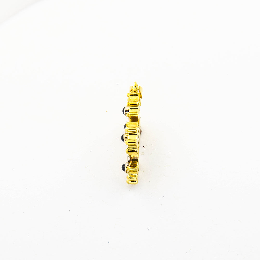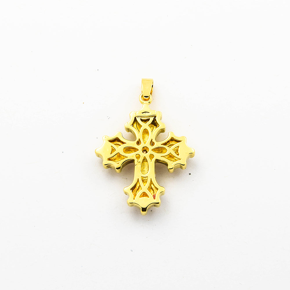 Bei dem Schmuckstück handelt es sich um einen russischen Kreuzanhänger aus 750 Gelb- und Weißgold mit vier Saphircabochons.