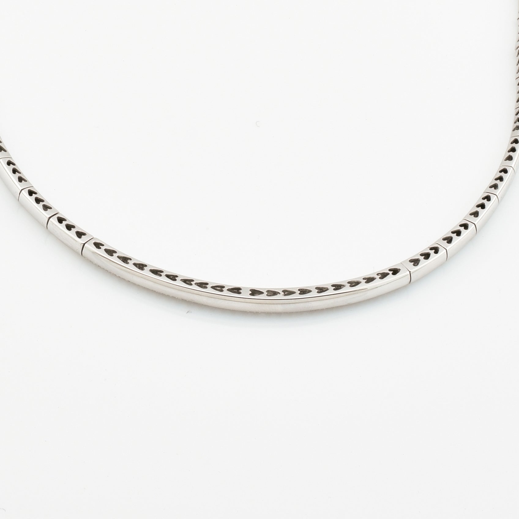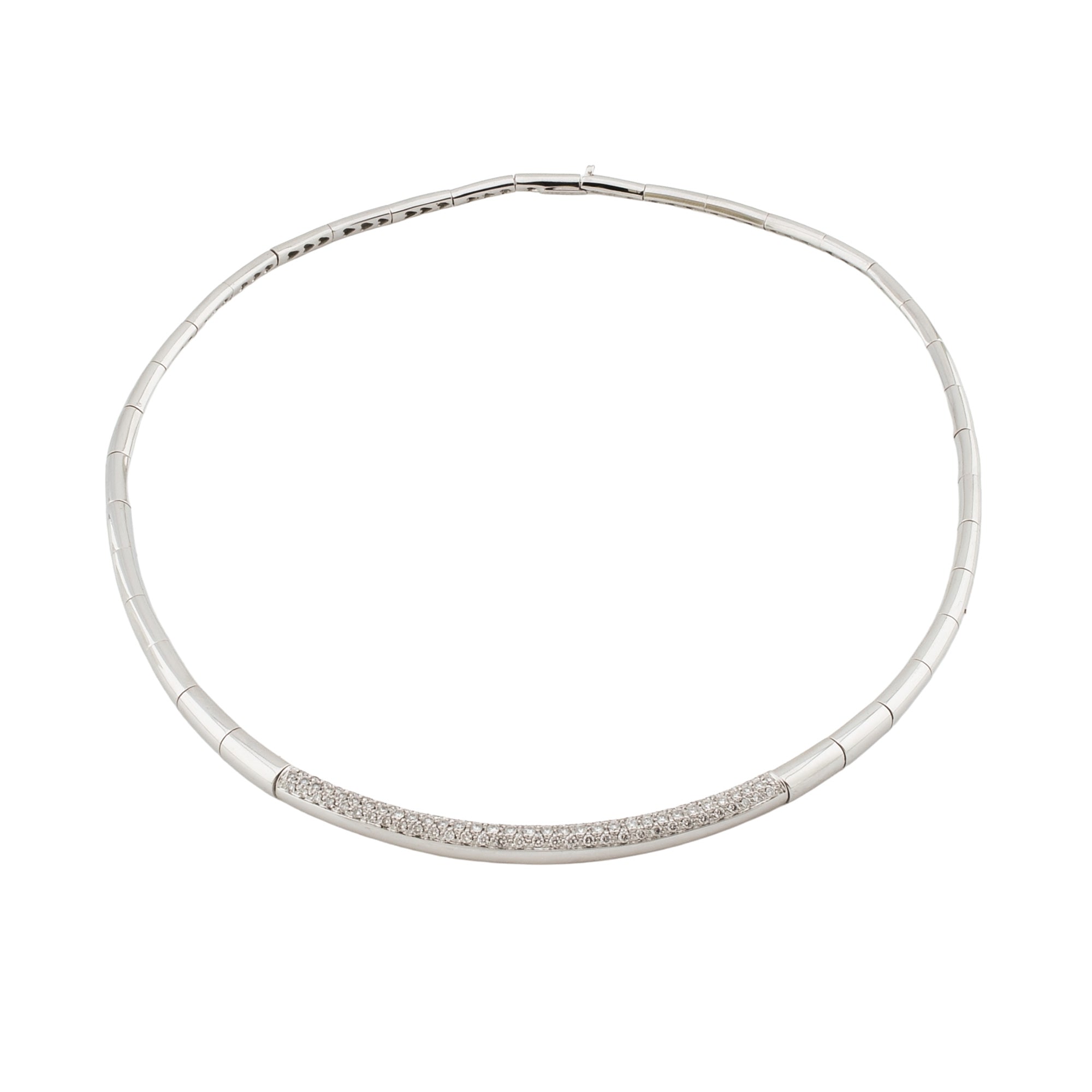 Bei dem Schmuckstück handelt es sich um ein Collier der Marke Leo Pizzo aus 750 Weißgold mit 97 Brillanten von zusammen ca. 1,455 ct in der Qualität feines Weiß mit sehr kleinen Einschlüssen (TW/vs). Das Schmuckstück hat eine Gesamtlänge von 40 cm.