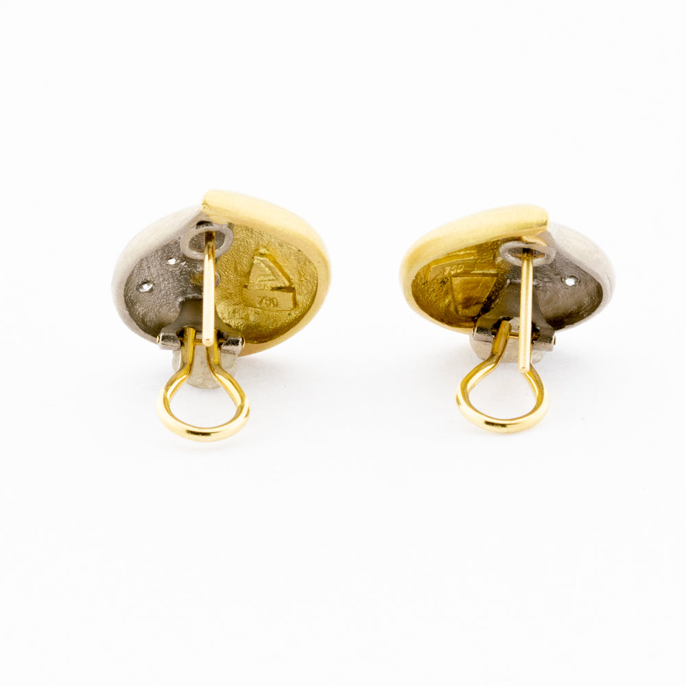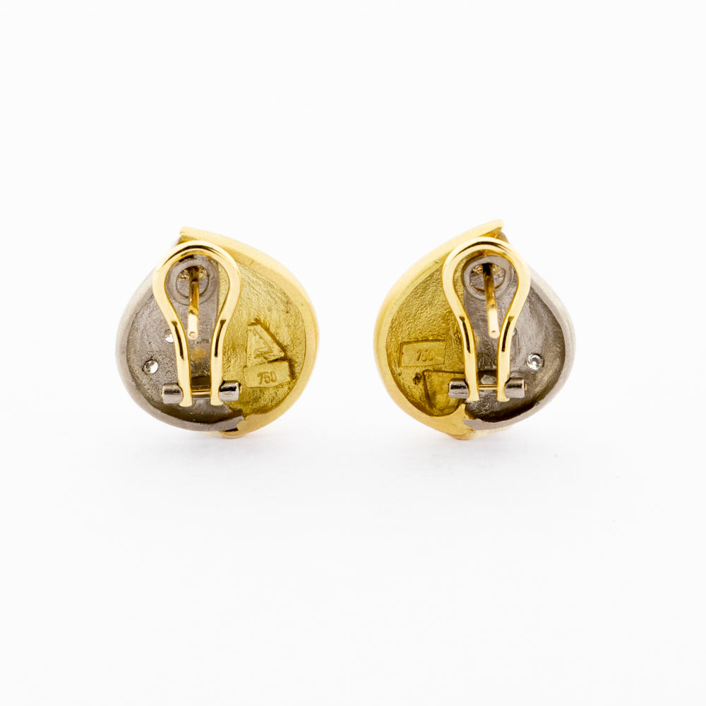 Bei dem Schmuckstück handelt es sich um ein Paar Ohrstecker mit Clipmechanik aus 750 Gelb- und Weißgold mit sechs Brillanten von zusammen ca. 0,12 ct in der Qualität Weiß mit kleinen Einschlüssen (W/si).