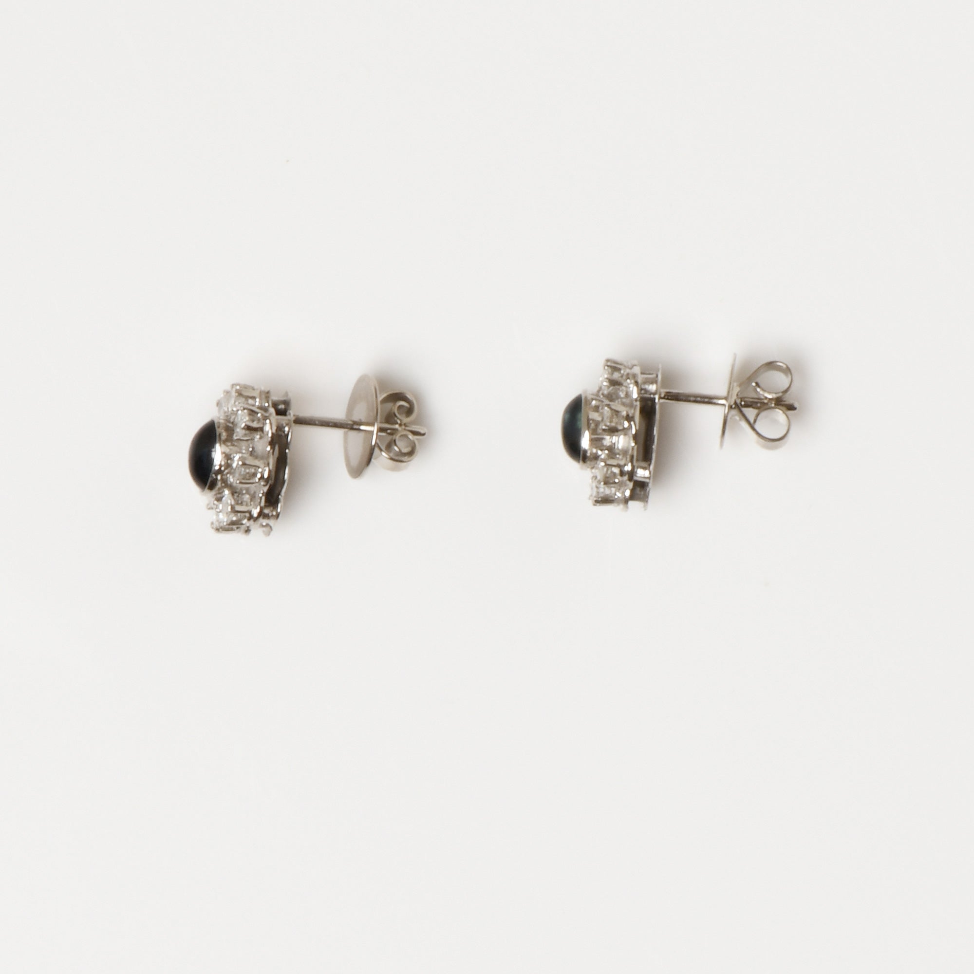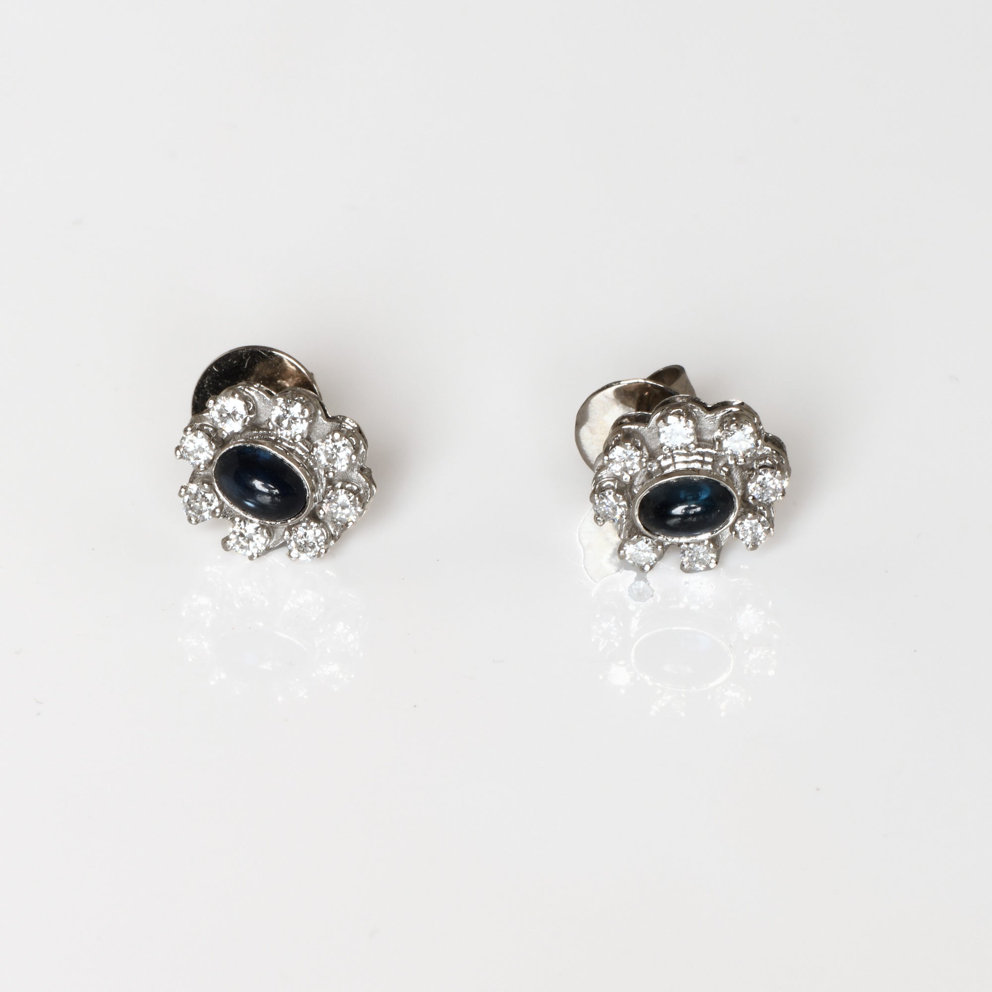 Bei dem Schmuckstück handelt es sich um ein Paar Ohrstecker aus 585 Weißgold mit zwei Saphircabochons und 16 Brillanten von zusammen ca. 0,52 ct in der Qualität Weiß mit kleinen Einschlüssen (W/si).