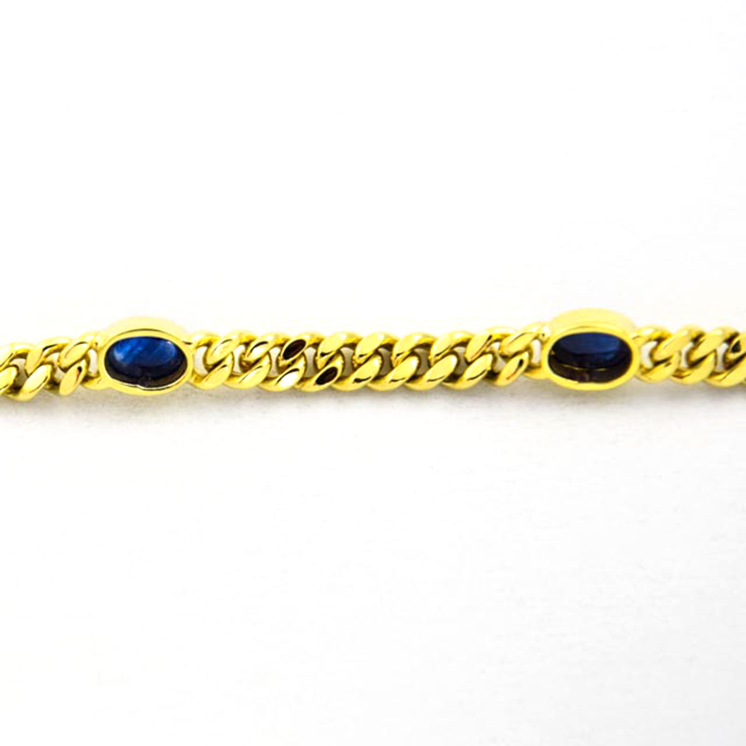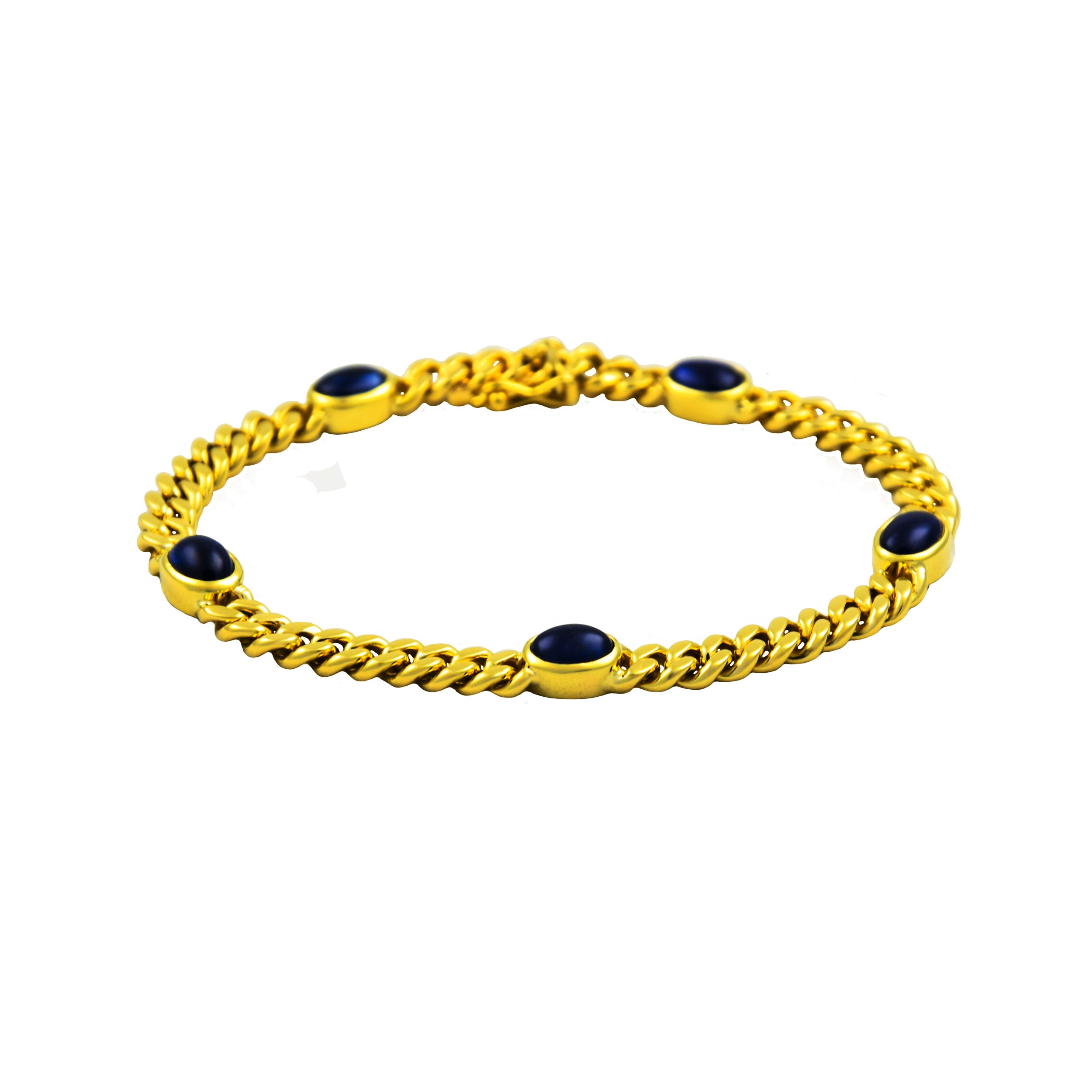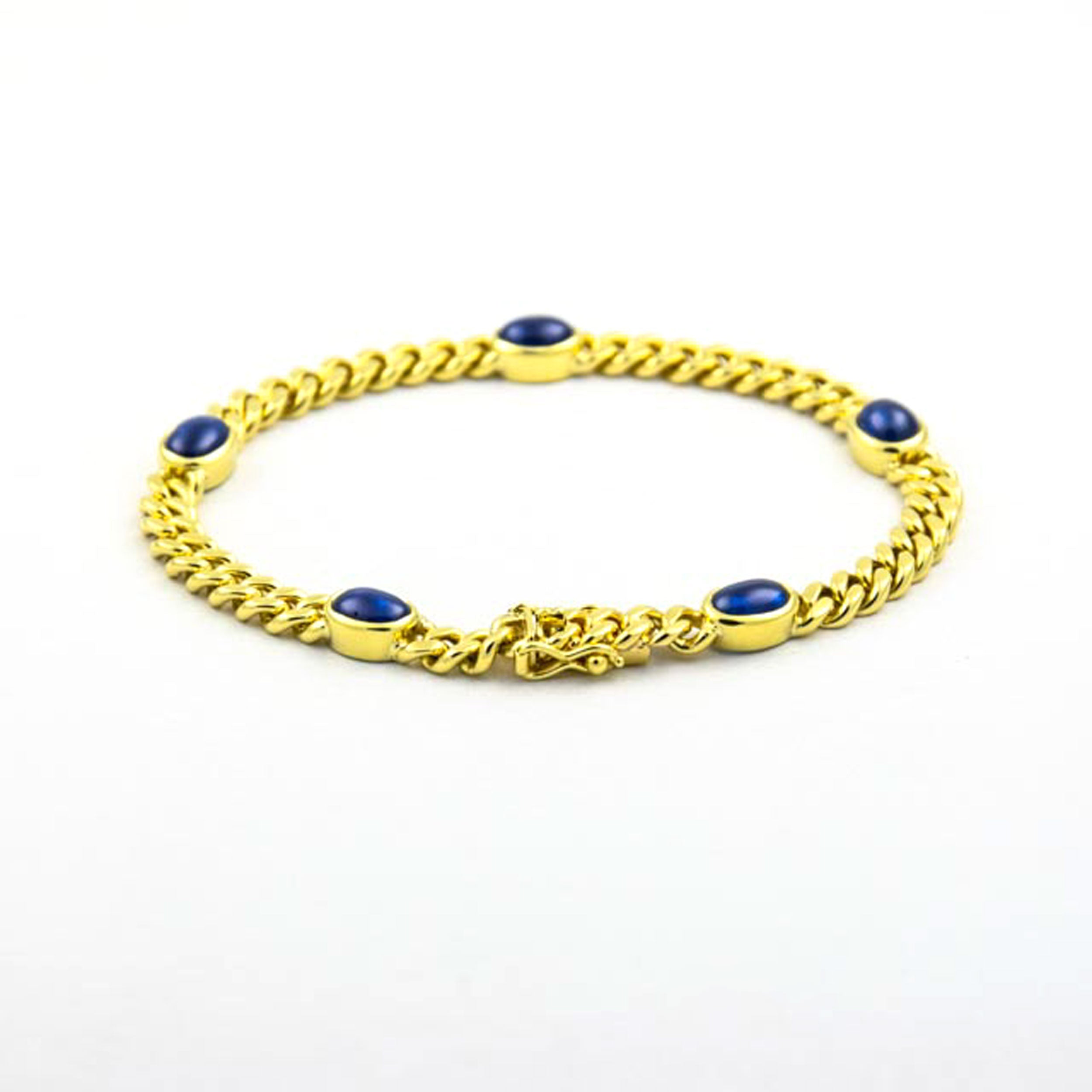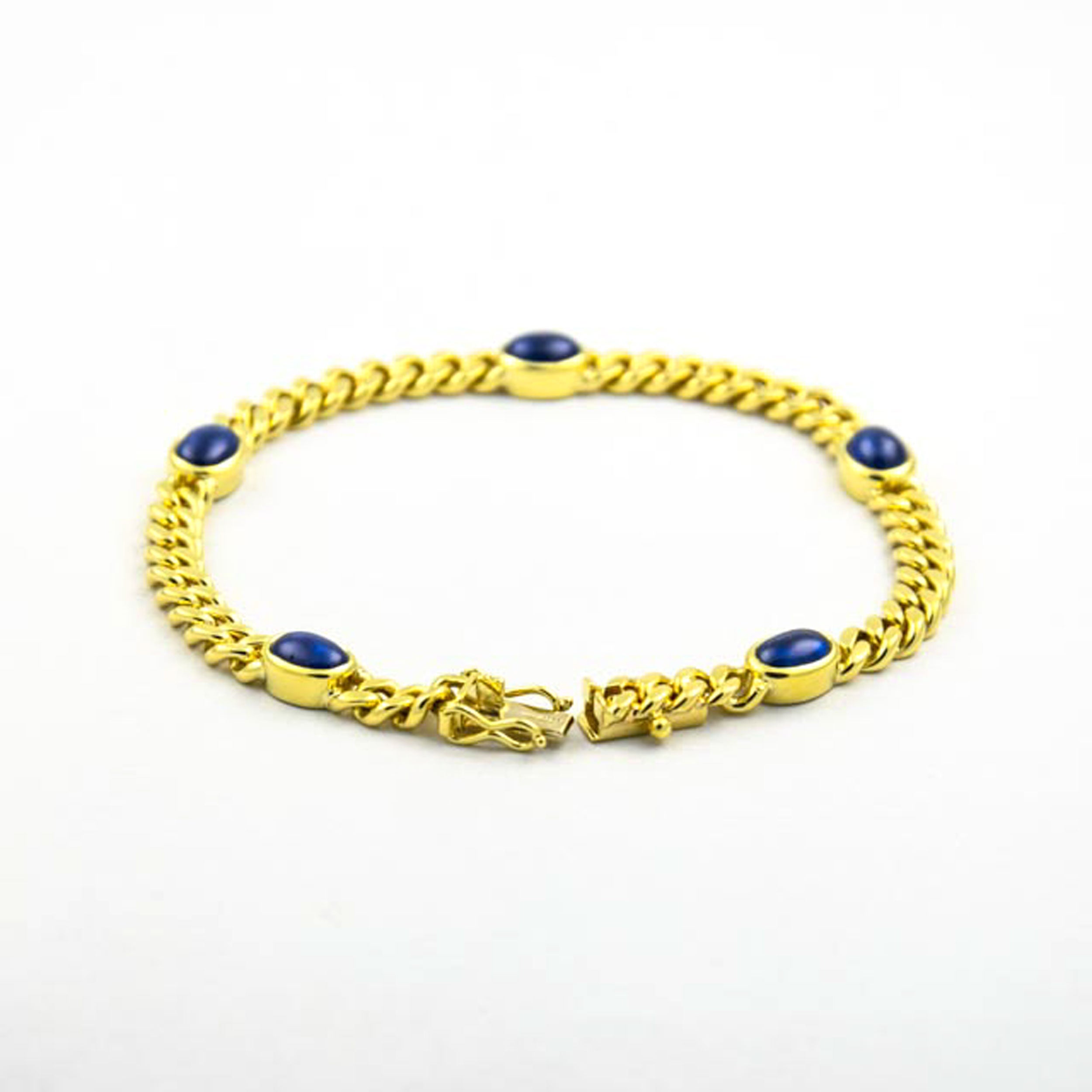 Bei dem Schmuckstück handelt es sich um ein in Handarbeit gefertigtes Panzerarmband aus 585 Gelbgold mit fünf Saphircabochons. Das Schmuckstück hat eine Gesamtlänge von 18,5 cm.