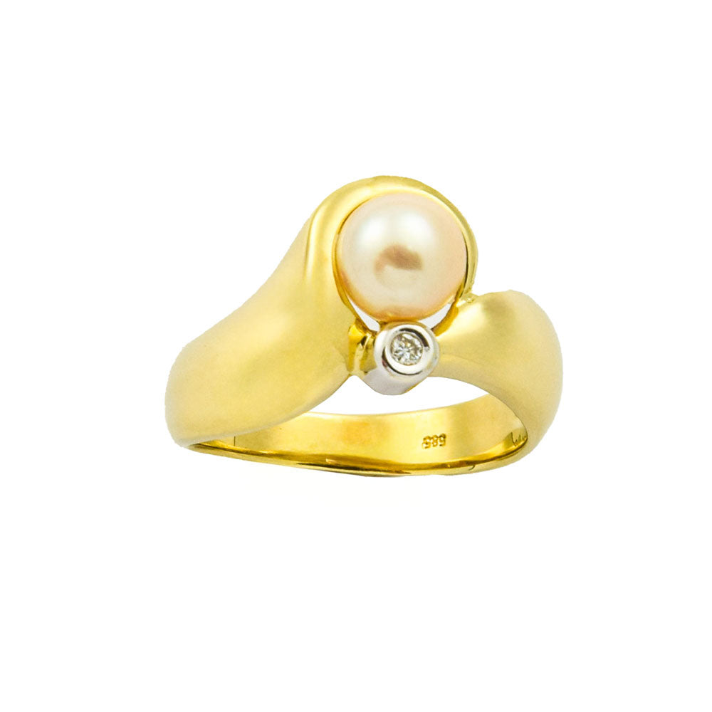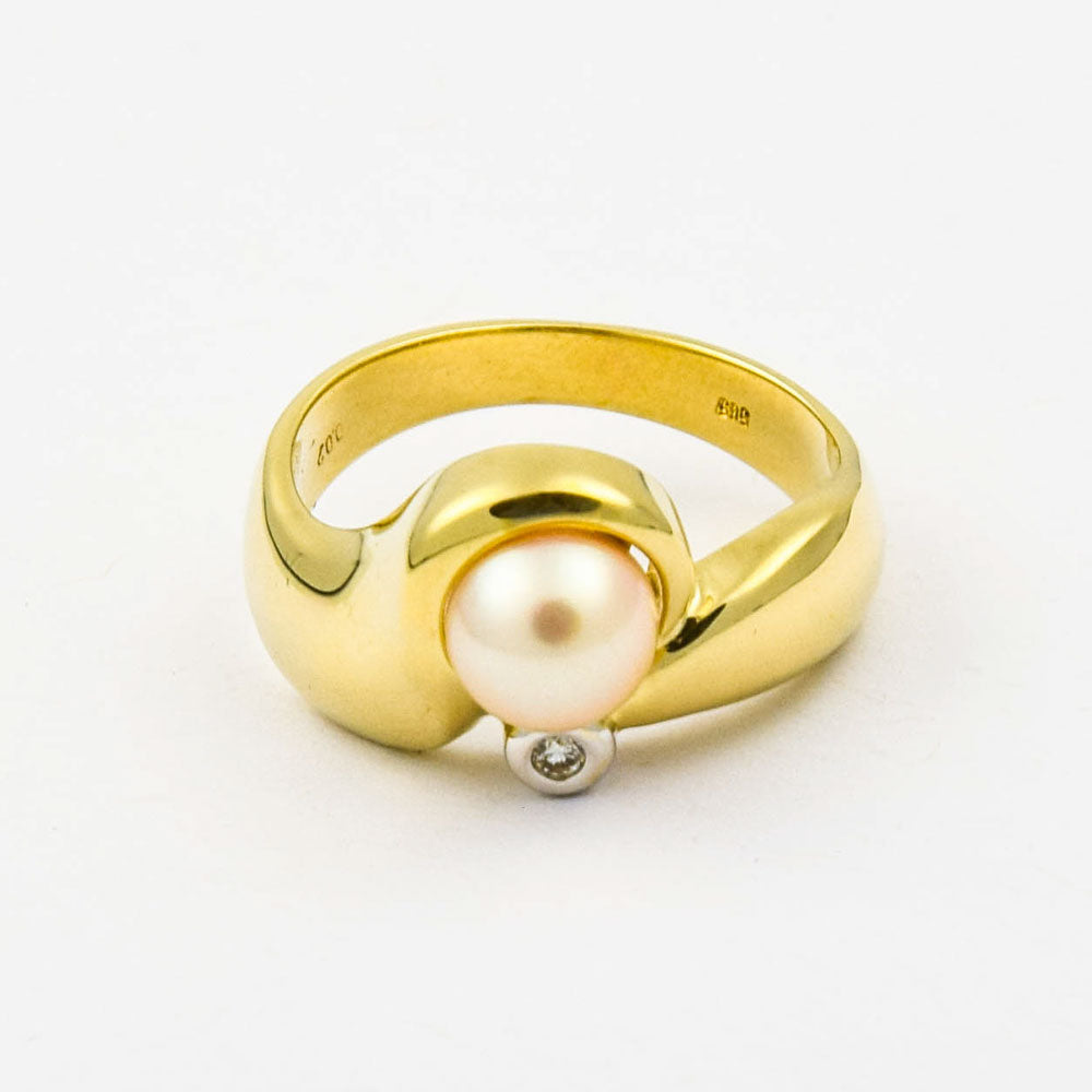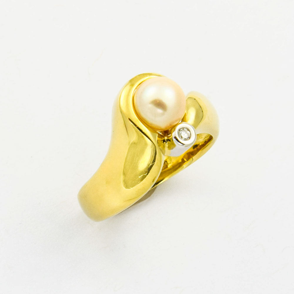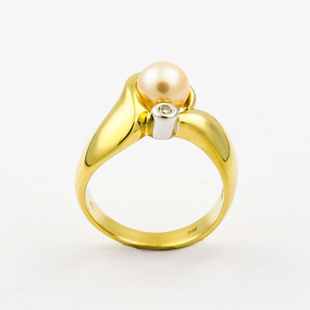 Bei dem Schmuckstück handelt es sich um einen Ring aus 585 Gelb- und Weißgold mit einer Zuchtperle und einem Brillanten von ca. 0,007 ct in der Qualität leicht getöntes Weiß mit kleinen Einschlüssen (TCr/si).