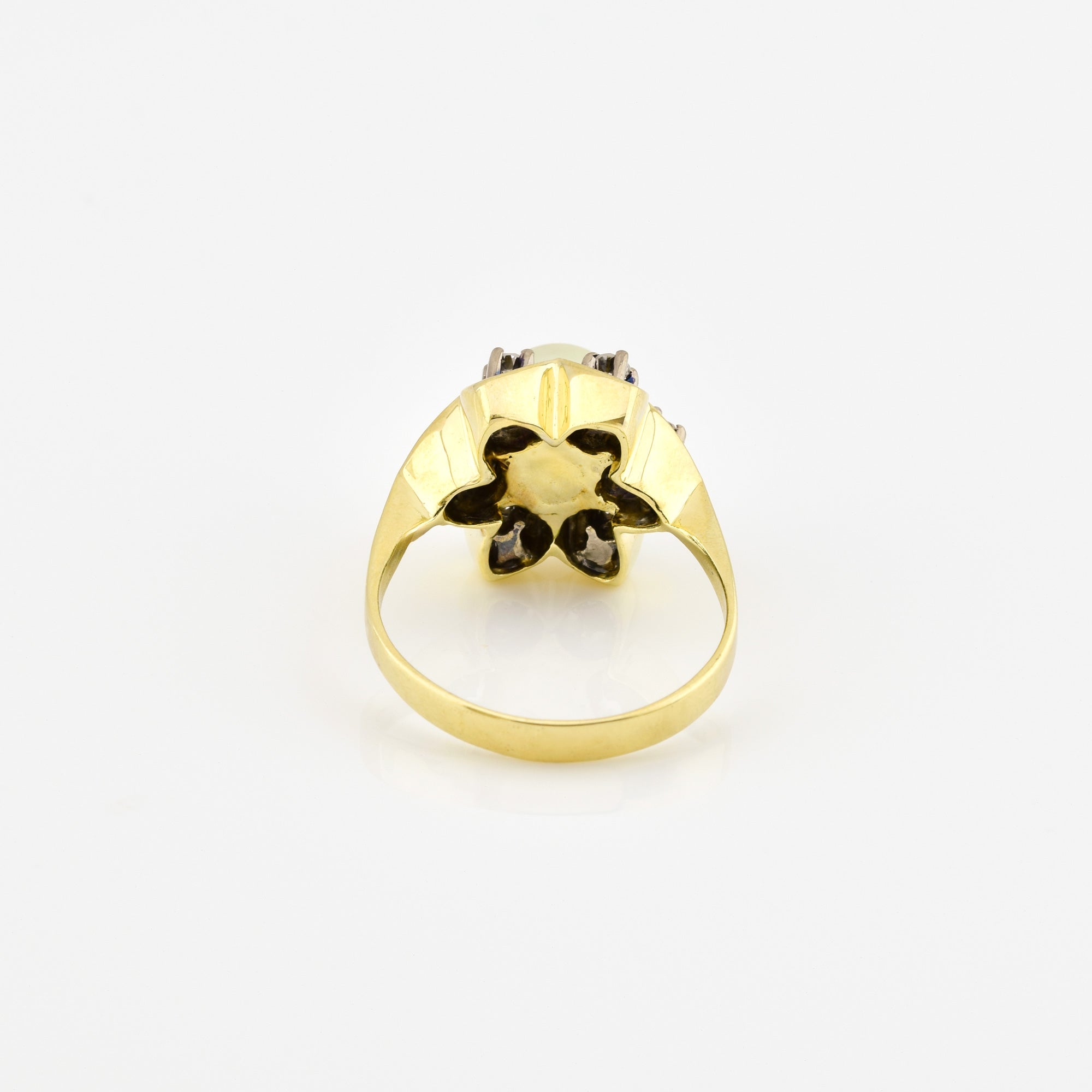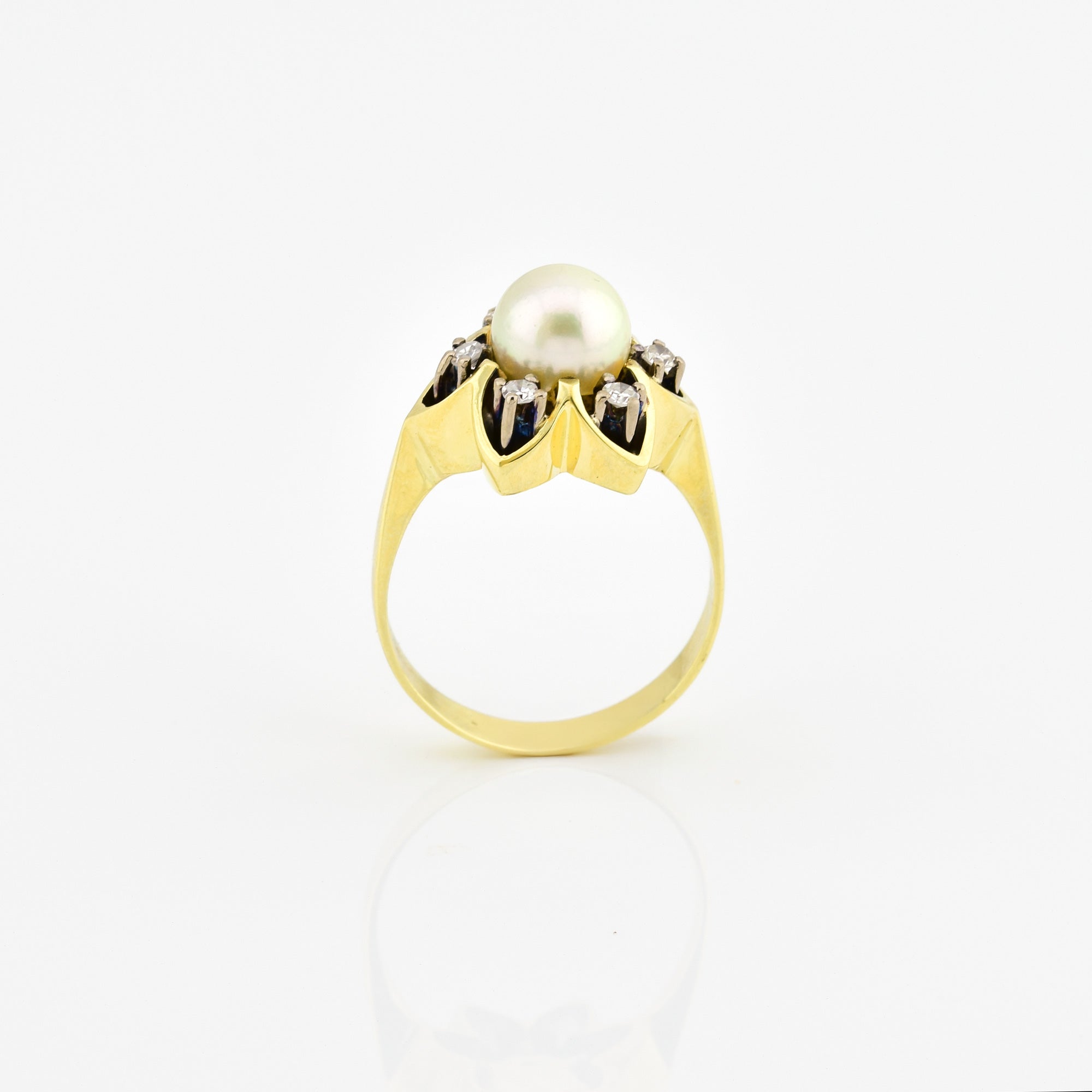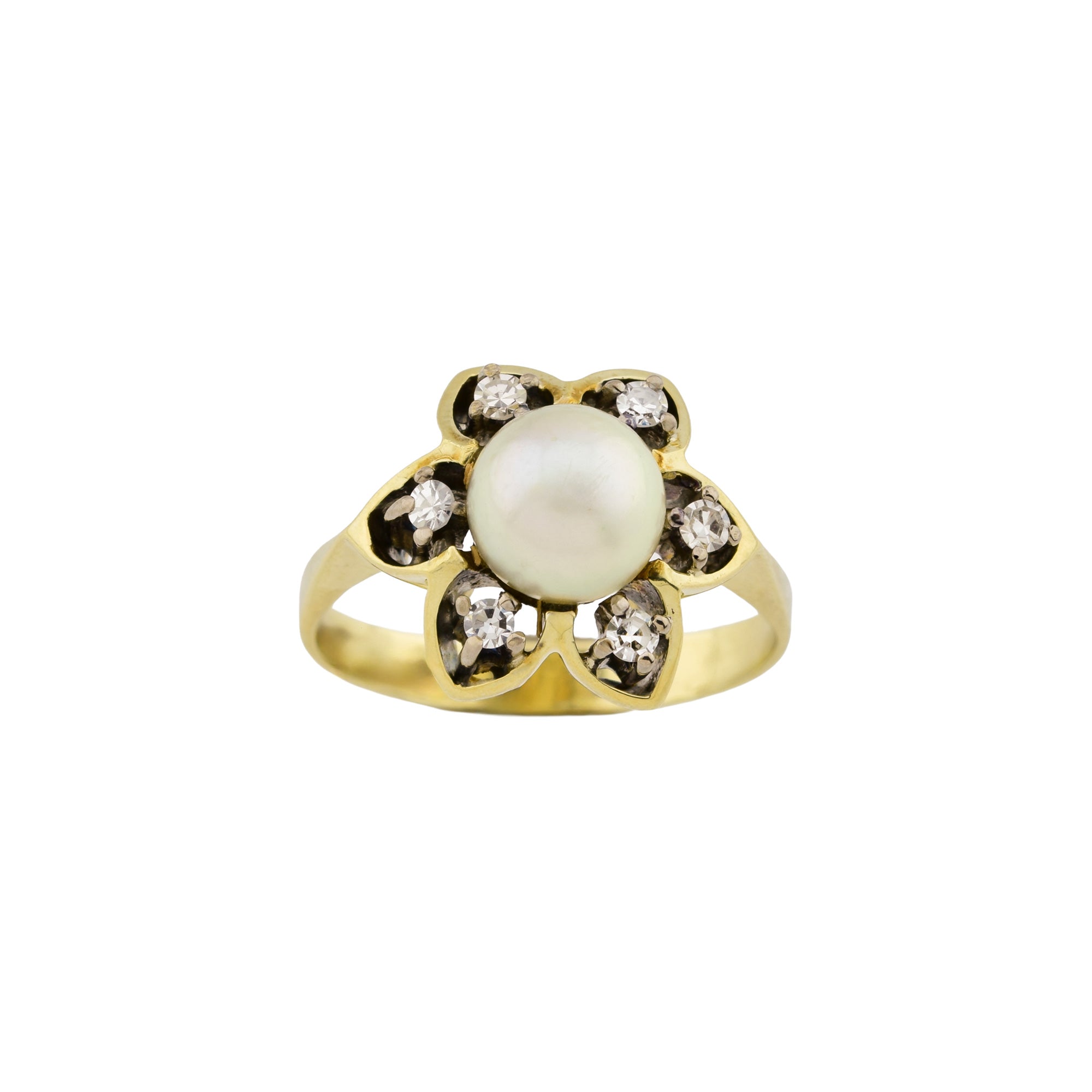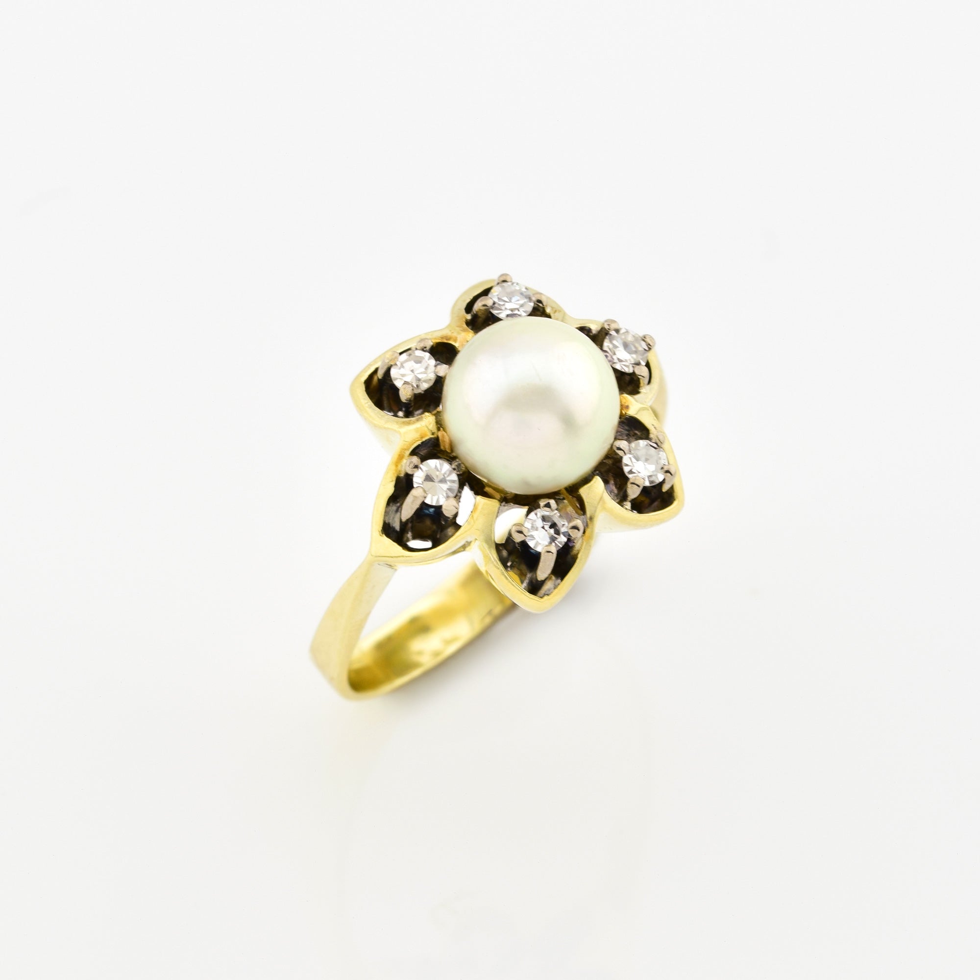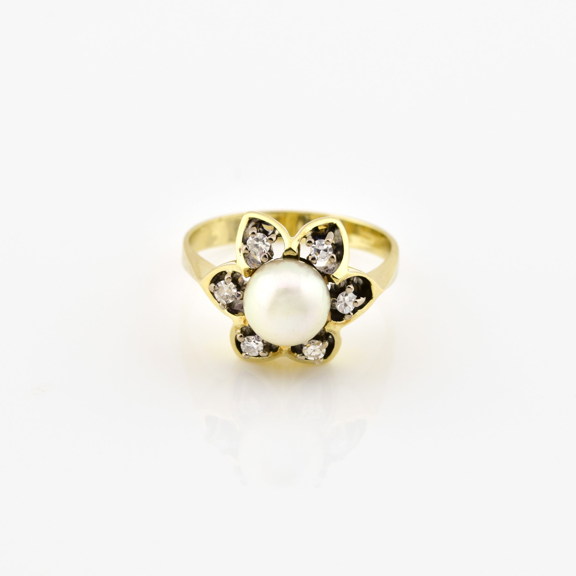 Bei dem Schmuckstück handelt es sich um einen Ring aus 585 Gelb- und Weißgold mit einer Zuchtperle und sechs Brillanten von zusammen ca. 0,18 ct in der Qualität Weiß mit kleinen Einschlüssen (W/si).