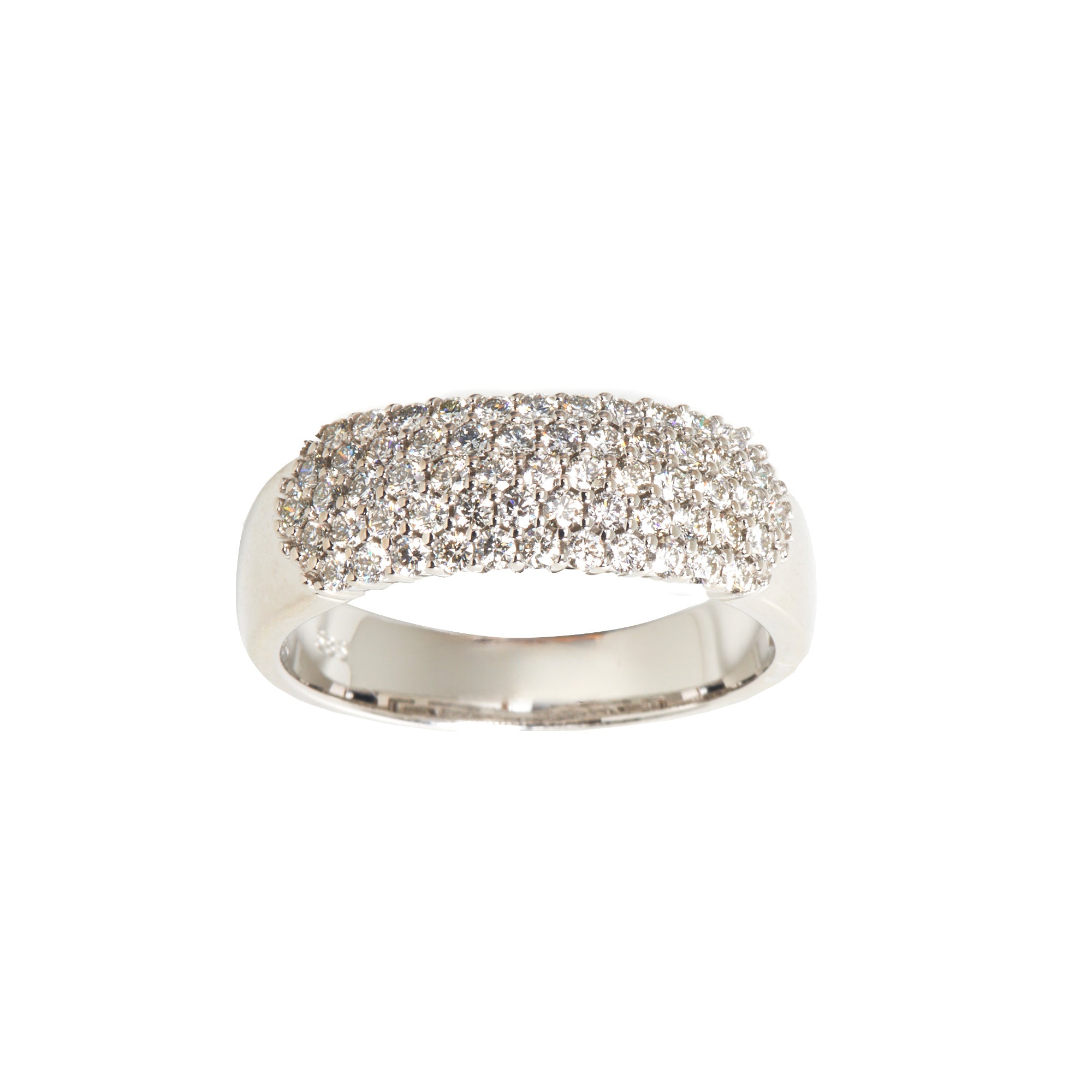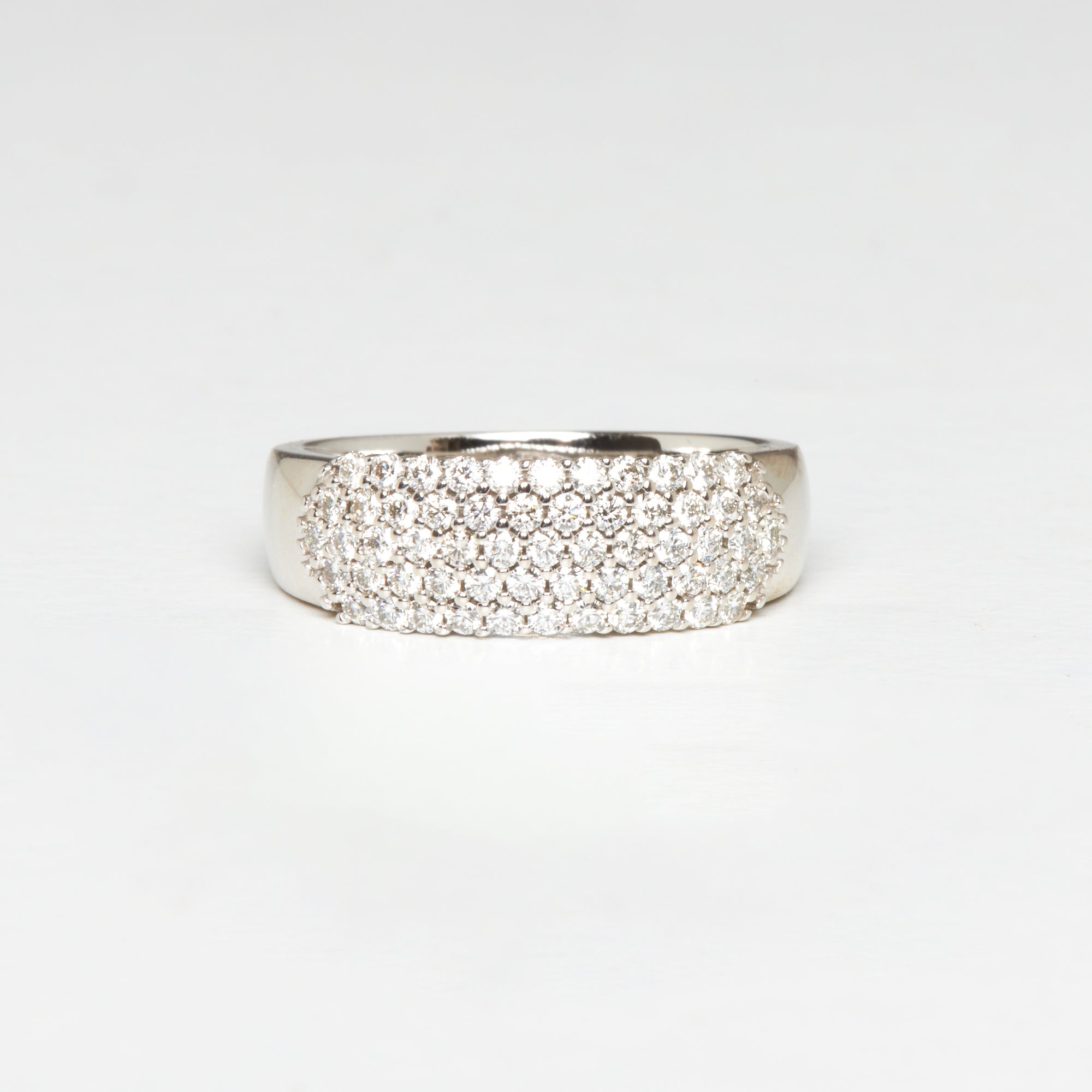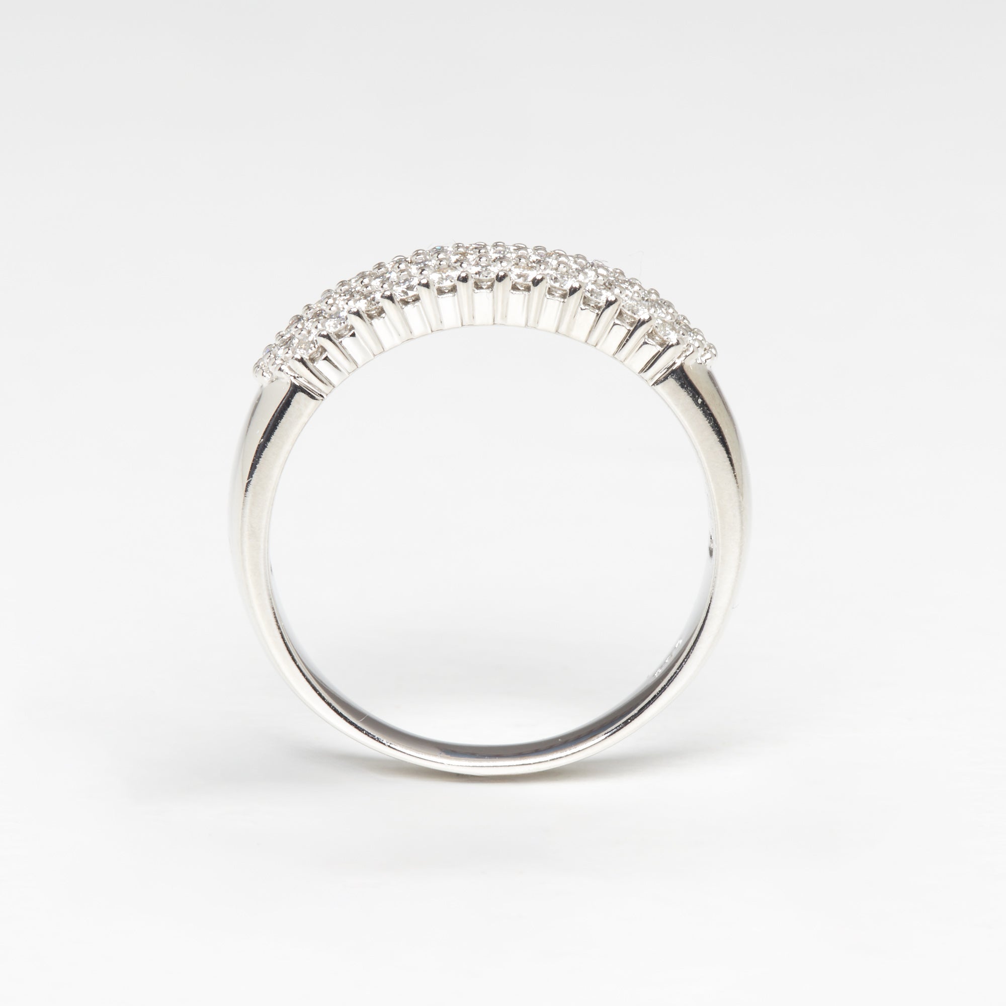 Bei dem Schmuckstück handelt es sich um einen Ring aus 585 Weißgold mit 59 Brillanten von zusammen ca. 0,59 ct in der Qualität Weiß und lupenrein (W/lupenrein).