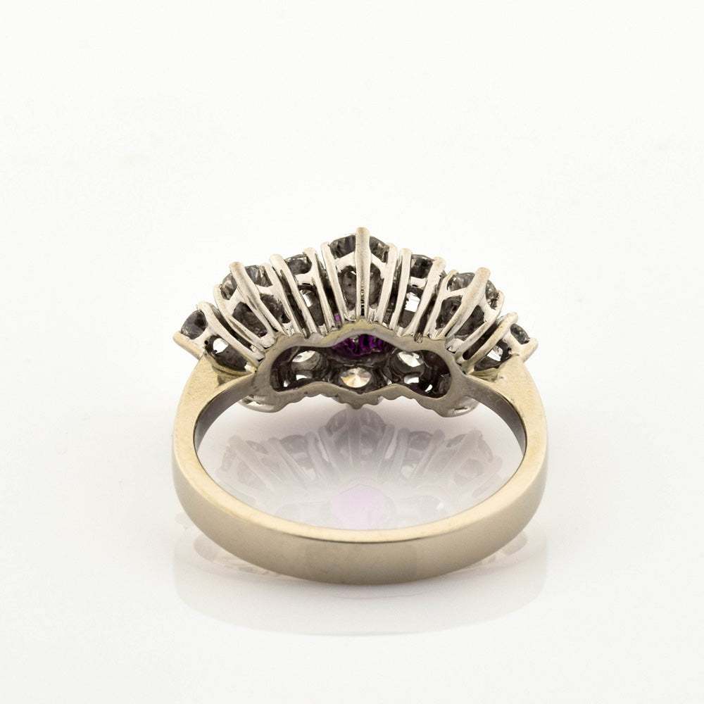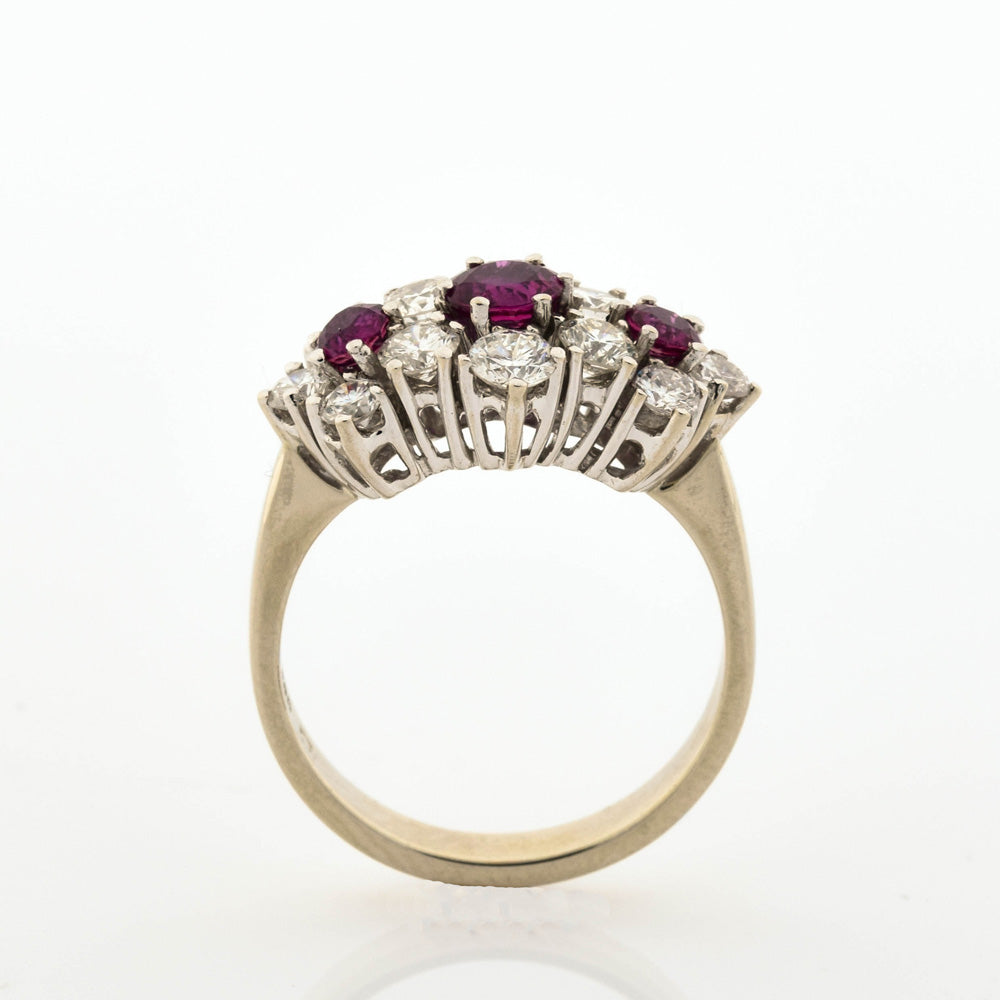 Bei dem Schmuckstück handelt es sich um einen Ring aus 585 Weißgold mit drei Rubinen von zusammen ca. 0,82 ct und zwölf Brillanten von zusammen ca. 1,36 ct in der Qualität feines Weiß mit sehr, sehr kleinen Einschlüssen (TW/vvs).